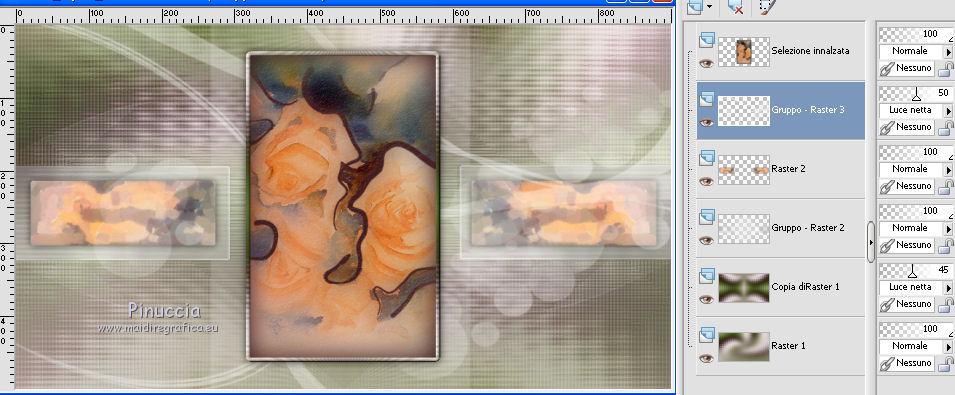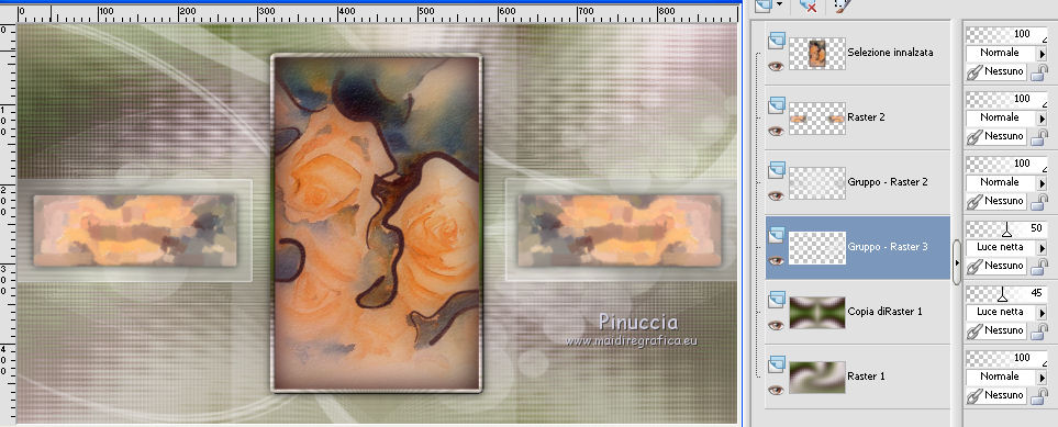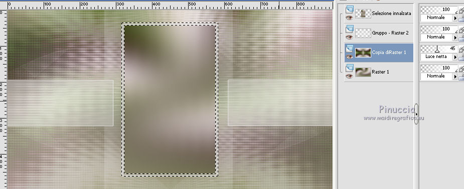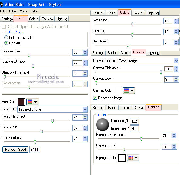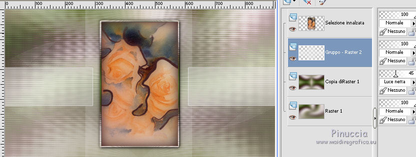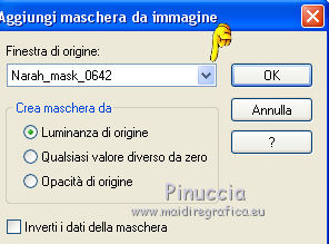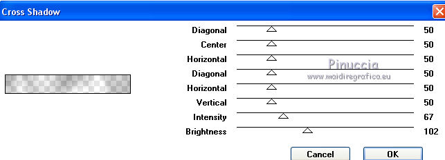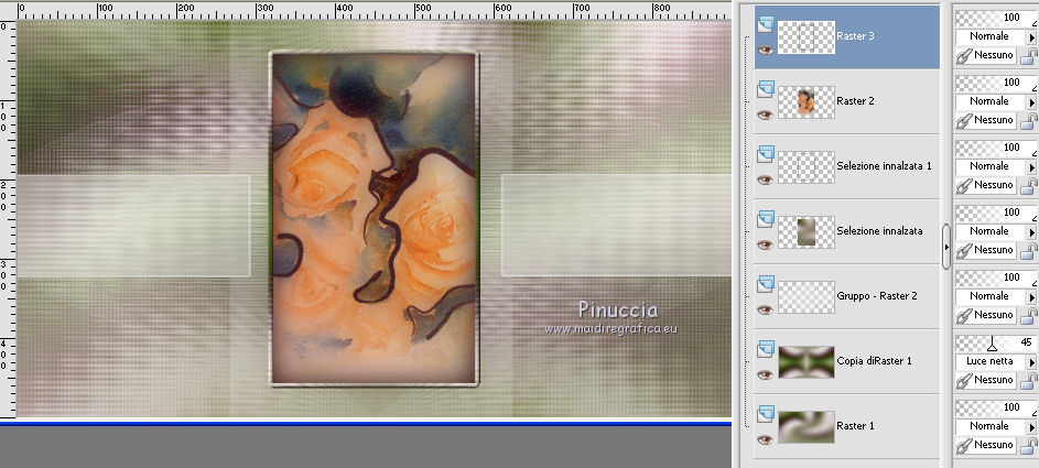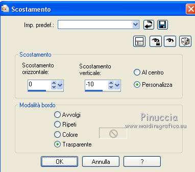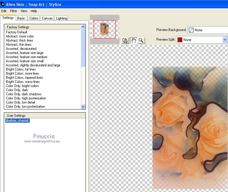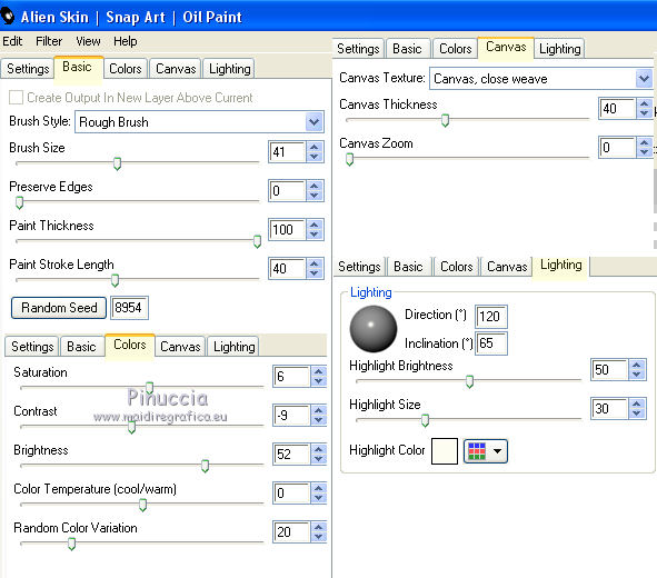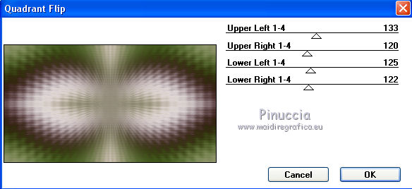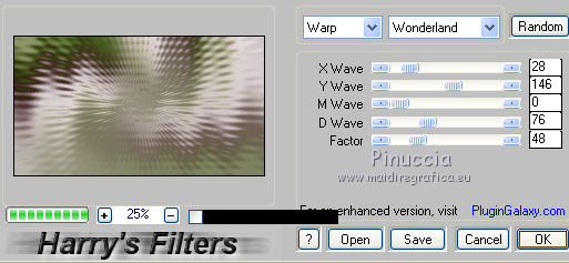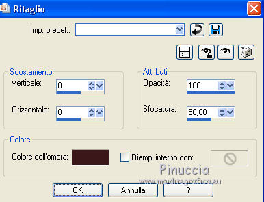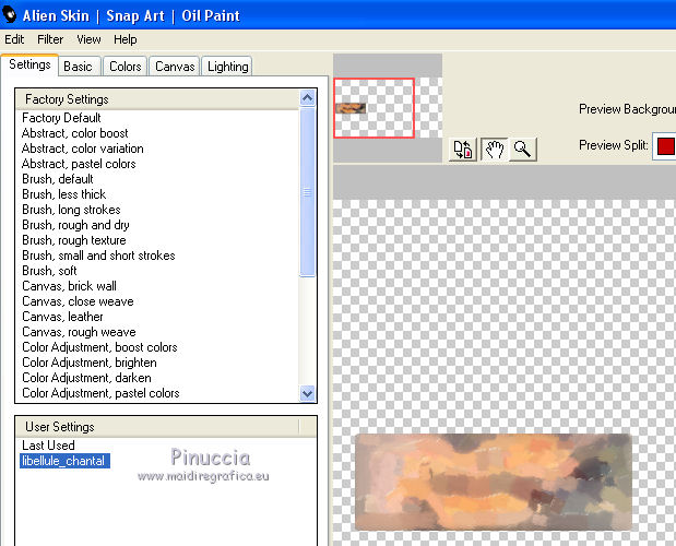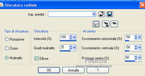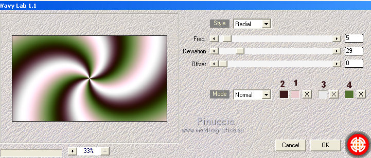 qui puoi trovare qualche risposta ai tuoi dubbi. Se l'argomento che ti interessa non è presente, ti prego di segnalarmelo. Questo tutorial è stato creato da Libellule con X17 e tradotto con CorelX, ma può essere eseguito con tutte le versioni di PSP Dalla versione X4, il comando Immagine>Rifletti è stato sostituito con Immagine>Capovolgi in orizzontale, e il comando Immagine>Capovolgi con Immagine>Capovolgi in verticale. Nelle versioni X5 e X6, le funzioni sono state migliorate rendendo disponibile il menu Oggetti. Con la nuova versione X7, sono tornati i comandi Rifletti e Capovolgi, ma con nuove differenze. Vedi la scheda sull'argomento qui Occorrente. Materiale qui Questo tutorial è dedicato a Chantal, pseudo di Cibi-Bijoux (in questa pagina trovi i links ai loro siti). Filtri in caso di dubbi, ricorda di consultare la mia sezione filtri qui Filters Unlimited 2.0 qui Mehdi - Wavy Lab 1.1. qui Simple - Top Bottom Wrap (bonus) qui Simple - 4Way Average qui Harry's Filter - Warp qui Mirror Rave - Quadrant Flip qui Alien Skin Snap Art - Stylize, Oil Paint qui Graphics Plus - Cross Shadow qui I filtri Mirror Rave, Harry's, Simple e Graphics Plus si possono usare da soli o importati in Filters Unlimited (come fare vedi qui) Se un filtro fornito appare con questa icona ![]() non esitare a cambiare modalità di miscelatura e opacità secondo i colori utilizzati. Metti i presets Cliccando sul file una o due volte (a seconda delle tue impostazioni), automaticamente il preset si installerà nella cartella corretta. perchè uno o due clic vedi qui Se preferisci, puoi importare direttamente il preset nel corso del tutorial Come fare vedi la scheda del filtro Eye Candy qui Apri le maschere in PSP e minimizzale con il resto del materiale. Colori utilizzati ![]() 1. Imposta il colore di primo piano con il colore 1 #eacacd e il colore di sfondo con il colore 2 #3c181a. ![]() 2. Apri canal_alpha chantal.pspimage. Finestra>Duplica, o sulla tastiera maiuscola+D per fare una copia. ![]() Chiudi l'originale. La copia, che sarà la base del tuo lavoro, non è vuota, ma contiene le selezioni salvate sul canale alfa. 3. Effetti>Plugins>Mehdi - Wavy Lab 1.1 questo filtro lavora con i colori della paletta: il primo è il colore di sfondo, il secondo quello di primo piano; cambia gli altri due colori creati dal filtro con i colori 3 #e9e9e9 e 4 #51702c (attenzione, il colore 3 non è bianco, ma un grigio chiaro). ![]() 4. Regola>Sfocatura>Sfocatura radiale. ![]() 5. Regola>Sfocatura>Sfocatura gaussiana - raggio 35. ![]() 6. Effetti>Plugins>Harry's Filters - Warp - Wonderland. ![]() 7. Effetti>Effetti di bordo>Aumenta di più. 8. Livelli>Duplica. Effetti>Plugins>Mirror Rave - Quadrant Flip, con i settaggi standard. ![]() 9. Effetti>Plugins>Simple - Top Bottom Wrap. 10. Cambia la modalità di miscelatura di questo livello in Luce netta e abbassa l'opacità al 45%. ![]() 11. Livelli>Nuovo livello raster. Imposta il colore di primo piano con il colore 3 #e9e9e9 ![]() Abbassa l'opacità dello strumento Riempimento a 80 ![]() e riempi il livello con il colore di primo piano.12. Livelli>Nuovo livello maschera>Da immagine. Apri il menu sotto la finestra di origine e vedrai la lista dei files aperti. Seleziona la maschera Narah_mask_0642.jpg ![]() Livelli>Unisci>Unisci gruppo. Regola>Messa a fuoco>Metti a fuoco. 13. Attiva il livello di sfondo. Selezione>Carica/Salva selezione>Carica selezione da canale alfa. La selezione sélection 1 è subito disponibile. Devi soltanto cliccare Carica. ![]() Selezione>Innalza selezione a livello. Livelli>Disponi>Porta in alto. Mantieni selezionato. 14. Regola>Sfocatura>Sfocatura gaussiana - raggio 10. ![]() 15. Selezione>Modifica>Seleziona bordature selezione. ![]() 16. Attiva il livello Copia di Raster 1 (il secondo dal basso) ![]() Selezione>Innalza selezione a livello. Livelli>Disponi>Porta in alto. 17. Effetti>Effetti 3D>Smusso a incasso. ![]() Selezione>Deseleziona. 18. Apri il tube libellulegraphisme_wash_of_roses.png, cancella il watermark e rimani su questo tube. Immagine>Ruota a destra. Il tube deve essere più grande in altezza che in larghezza. 19. Modifica>Copia. Torna al tuo lavoro e vai a Modifica>Incolla come nuovo livello. Immagine>Ridimensiona, al 65%, tutti i livelli non selezionato. 20. Selezione>Carica/Salva selezione>Carica selezione da canale alfa. Carica nuovamente sélection 1, questa volta Inverti immagine selezionato. ![]() 21. Premi sulla tastiera il tasto CANC ![]() 22. Di nuovo Selezione>Carica/Salva selezione>Carica selezione da canale alfa. Carica nuovamente sélection 1 e deseleziona Inverti immagine. ![]() 23. Effetti>Plugins>Alien Skin Snap Art - Stylize. Seleziona il preset libellule_chantal e ok. ![]() Questi i settaggi, in caso di problemi con il preset. Se usi altri colori, imposta il tuo colore scuro. ![]() 24. Livelli>Nuovo livello raster. Effetti>Effetti 3D>Ritaglio, colore 2 (colore di sfondo ).![]() 25. Dovresti avere questo ![]() 26. Attiva il livello di sfondo. Selezione>Seleziona tutto. Immagine>Ritaglia la selezione. 27. Attiva il livello superiore. Livelli>Unisci>Unisci giù - 3 volte. 28. Modifica>Copia. Modifica>Incolla come nuova immagine, e minimizza questa immagine. 29. Torna al tuo lavoro. Effetti>Effetti 3D>Sfalsa ombra, colore nero. ![]() 30. Attiva il livello della maschera (gruppo Raster 2). ![]() 31. Selezione>Carica/Salva selezione>Carica selezione da canale alfa. Apri il menu delle selezioni e carica sélection 2. ![]() 32. Effetti>Plugins>Graphics Plus - Cross Shadow. ![]() Selezione>Deseleziona. 33. Selezione>Carica/Salva selezione>Carica selezione da canale alfa. Apri il menu delle selezioni e carica sélection 3. ![]() 34. Attiva l'immagine che hai minimizzato al punto 28. ![]() Immagine>Ruota a destra. Modifica>Copia. 35. Torna al tuo lavoro. Livelli>Nuovo livello raster. Modifica>Incolla nella selezione. 36. Effetti>Plugins>Alien Skin Snap Art - Oil Paint. Seleziona il preset libellule_chantal_oil_paint e ok. ![]()