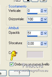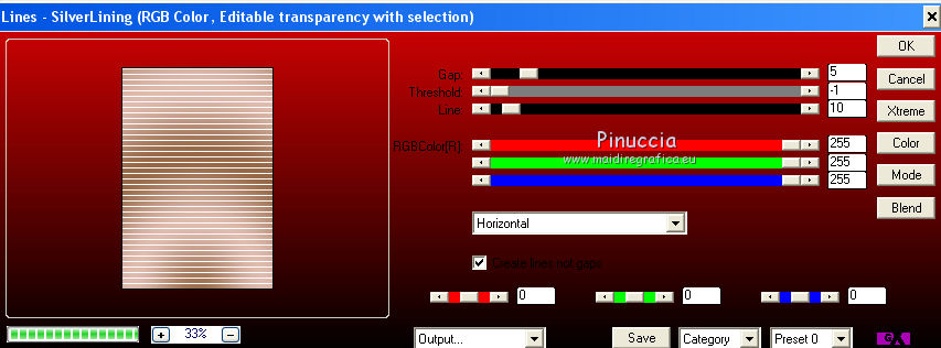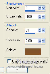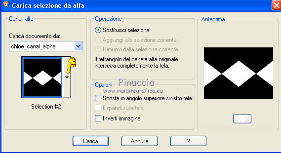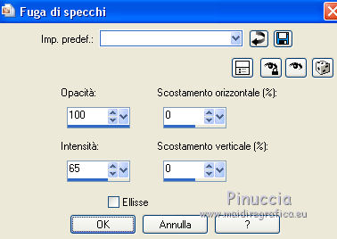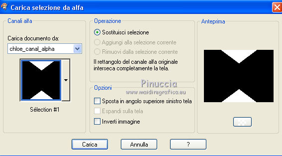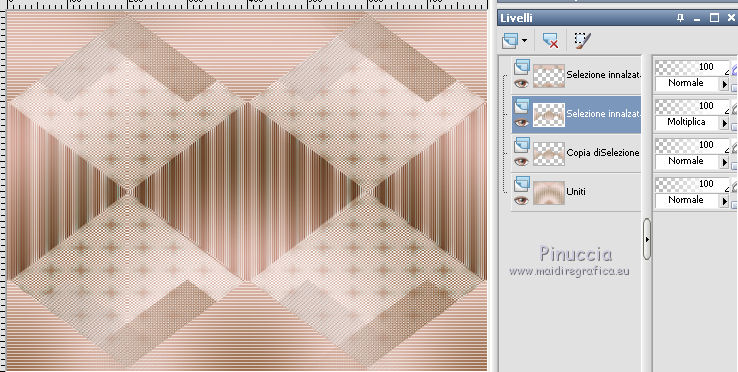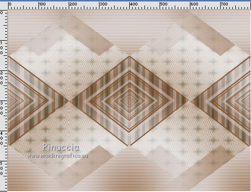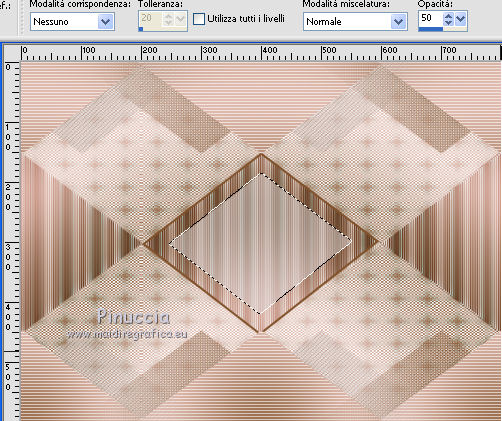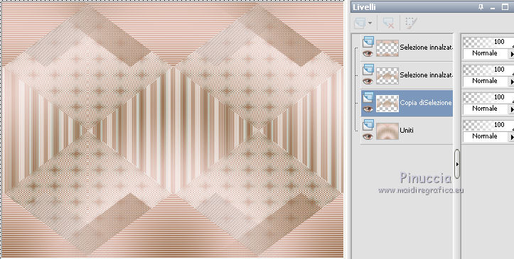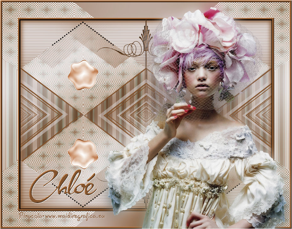 qui puoi trovare qualche risposta ai tuoi dubbi. Se l'argomento che ti interessa non è presente, ti prego di segnalarmelo. Questo tutorial è stato creato da Libellule con X12, ma può essere eseguito con tutte le versioni di PSP Dalla versione X4, il comando Immagine>Rifletti è stato sostituito con Immagine>Capovolgi in orizzontale, e il comando Immagine>Capovolgi con Immagine>Capovolgi in verticale. Nelle versioni X5 e X6, le funzioni sono state migliorate rendendo disponibile il menu Oggetti. Con la nuova versione X7, sono tornati i comandi Rifletti e Capovolgi, ma con nuove differenze. Vedi la scheda sull'argomento qui Per tradurre questo tutorial ho usato PSP X. Occorrente. Materiale qui Il tube della donna è di Guismo. Il resto del materiale è di Libellule. Filtri in caso di dubbi, ricorda di consultare la mia sezione filtri qui AP [Gradient] - Gradient Pyramid qui AP 01 [Innovations] - Lines SilverLining qui Simple - Top Left Mirror qui ![]() 1. Imposta il colore di primo piano con il colore scuro #82532c, e il colore di sfondo con il colore chiaro #dcd6d8. ![]() Passa il colore di primo piano a Gradiente di primo piano/sfondo, stile Sprazzo di luce. ![]() Per il mio esempio, per avere i colori simili al tutorial originale, ho cambiato il colore chiaro del gradiente con #f0cfc8. ![]() e, dopo aver riempito l'immagine trasparente ho riportato il colore di sfondo al colore chiaro #dcd6d8. Vedi in fondo al tutorial il risultato senza questa modifica 2. Apri Chloe_canal_alpha.pspimage. Finestra>Duplica, o sulla tastiera maiuscolo+D per fare una copia. Chiudi l'originale. La copia, che sarà la base del tuo lavoro, non è vuota, ma contiene le selezioni salvate sul canale alfa. 3. Riempi l'immagine trasparente con il gradiente.4. Se hai seguito il mio esempio, non dimenticare di sostituire il colore di sfondo con il colore chiaro #dcd6d8. ![]() Regola>Sfocatura>Sfocatura gaussiana - raggio 40. ![]() 5. Livelli>Duplica. Effetti>Plugins>AP [Gradient] - Gradient Pyramid ![]() Cambia la modalità di miscelatura di questo livello in Filtra. ![]() Effetti>Effetti di bordo>Aumenta. 6. Selezione>Carica/Salva selezione>Carica selezione da canale alfa. La selezione sélection#1 è subito disponibile. Devi soltanto cliccare Carica. ![]() Premi sulla tastiera il tasto CANC ![]() Mantieni selezionato. Attiva il livello inferiore - Raster 1. 7. Effetti>Plugins>AP 01 [Innovations] - Lines SilverLining. ![]() 8. Mantieni ancora selezionato. Livelli>Unisci>Unisci visibile. Selezione>Innalza selezione a livello. Effetti>Effetti 3D>Sfalsa ombra, colore scuro di primo piano. ![]() 9. Selezione>Inverti. Effetti>Effetti di trama>Intessitura colore intessitura: primo piano #82532c - colore spazio: colore di sfondo #dcd6d8. ![]() 10. Selezione>Inverti. Effetti>Effetti 3D>Sfalsa ombra, colore chiaro di sfondo #dcd6d8, ombra su nuovo livello selezionato. ![]() 11. Selezione>Inverti. Effetti>Effetti di trama>Intessitura, con i settaggi precedenti. ![]() Selezione>Deseleziona. 12. Attiva il livello superiore. Livelli>Unisci>Unisci giù. Effetti>Effetti di immagine>Motivo unico. ![]() 13. Attiva il livello di sfondo. Selezione>Carica/Salva selezione>Carica selezione da canale alfa. Apri il menu delle selezioni e carica sélection#2. ![]() 14. Selezione>Innalza selezione a livello. Selezione>Deseleziona. Livelli>Duplica. Regola>Sfocatura>Sfocatura gaussiana - raggio 10. ![]() Livelli>Disponi>Sposta giù. Dovresti avere questo. ![]() 15. Attiva il livello soprastante dell'originale (selezione innalzata) e cambia la modalità di miscelatura in Moltiplica. ![]() 16. Selezione>Carica/Salva selezione>Carica selezione da canale alfa. Apri il menu delle selezioni e carica sélection#3. ![]() Livelli>Nuovo livello raster. Riempi la selezione con il colore scuro di primo piano.17. Selezione>Modifica>Contrai - 4 pixels. Premi sulla tastiera il tasto CANC ![]() 18. Selezione>Modifica>Contrai - 25 pixels. Abbassa l'opacità dello strumento Riempimento a 50 e riempi la selezione con il colore chiaro di sfondo.![]() 19. Selezione>Modifica>Contrai - 10 pixels. Riporta l'opacità dello strumento Riempimento a 100, e riempi con il colore scuro di primo piano.20. Selezione>Modifica>Contrai - 4 pixels. Premi sulla tastiera il tasto CANC. Selezione>Deseleziona. 21. Effetti>Effetti di riflesso>Fuga di specchi. ![]() 22. Effetti>Effetti di immagine>Motivo unico, con i settaggi precedenti. ![]() Dovresti avere questo: con la modifica dei colori: ![]() senza la modifica dei colori: ![]() 23. Attiva il livello superiore. Apri il tube chloe_etoile.png, e vai a Modifica>Copia. Torna al tuo lavoro e vai a Modifica>Incolla come nuovo livello. 24. Effetti>Effetti di immagine>Scostamento. ![]() 25. Regola>Tonalità e saturazione>Viraggio. ![]() 26. Effetti>Plugins>Simple - Top Left Mirror. 27. Livelli>Unisci>Unisci visibile. 28. Selezione>Seleziona tutto. Immagine>Aggiungi bordatura, 2 pixels, simmetriche, colore nero. Effetti>Effetti 3D>Ritaglio - colore scuro di primo piano. ![]() Ripeti l'Effetto Ritaglio cambiando verticale e orizzontale con -5. 29. Selezione>Seleziona tutto. Immagine>Aggiungi bordatura, 6 pixels, simmetriche, colore scuro di primo piano. Selezione>Inverti. 30. Effetti>Effetti 3D>Smusso a incasso. ![]() 31. Selezione>Seleziona tutto. Immagine>Aggiungi bordatura, 50 pixels, simmetriche, colore bianco. Selezione>Inverti. Riporta il colore di primo piano a Gradiente, e riempi la selezione con il gradiente iniziale.senza la modifica. ![]() con il colore di sfondo #f0cfc8. ![]() 32. Regola>Sfocatura>Sfocatura gaussiana - raggio 40. ![]() Selezione>Innalza selezione a livello. Effetti>Plugins>AP [Gradient] - Gradient Pyramid, con i settaggi precedenti. ![]() Cambia la modalità di miscelatura di questo livello in Filtra Effetti>Effetti di bordo>Aumenta. 33. Selezione>Seleziona tutto. Immagine>Aggiungi bordatura, 6 pixels, simmetriche, colore scuro di primo piano. Selezione>Inverti. 34. Effetti>Effetti 3D>Smusso a incasso. ![](