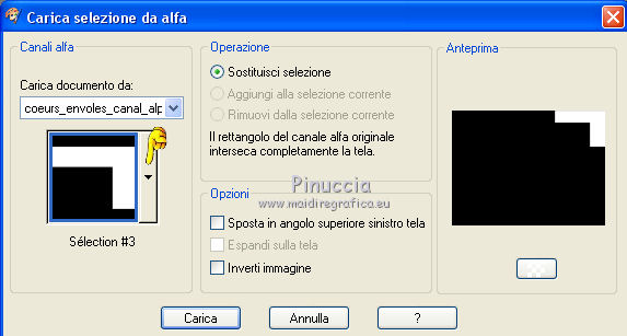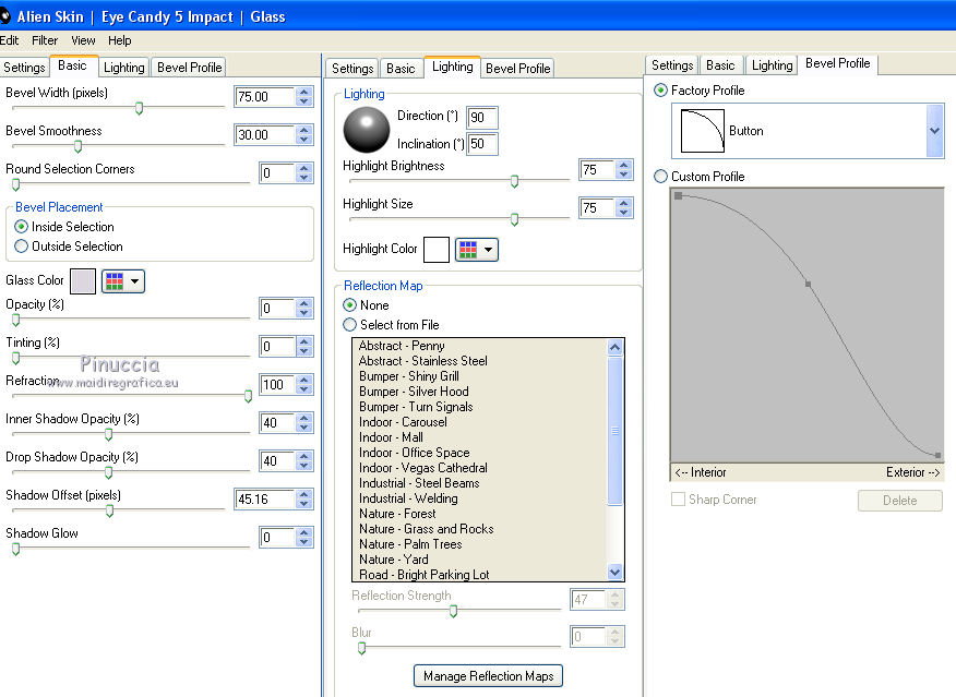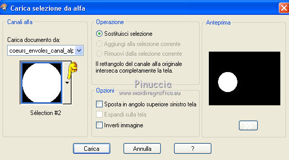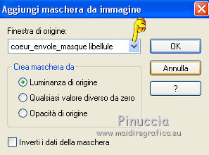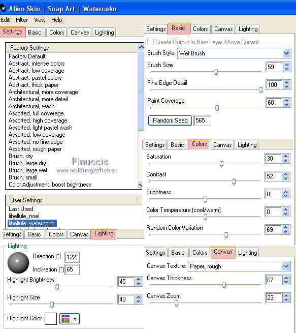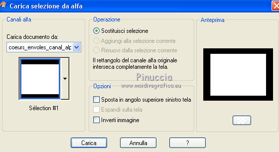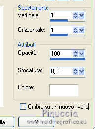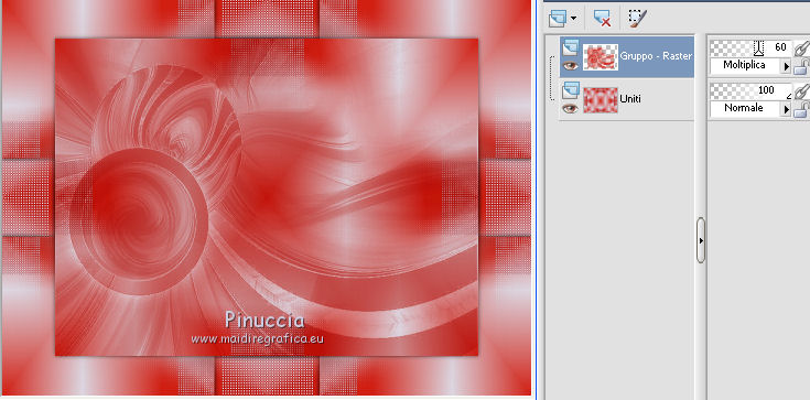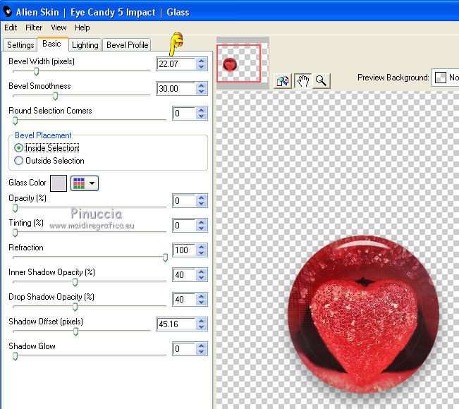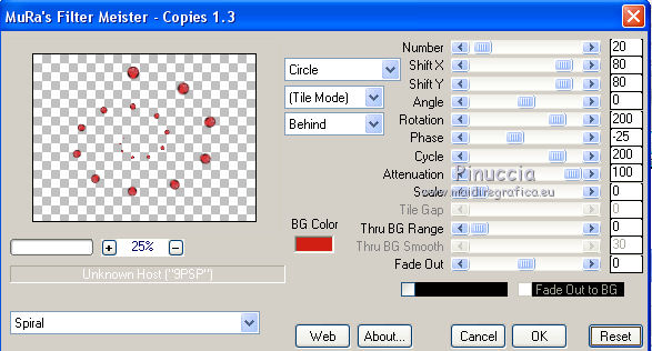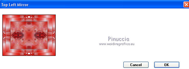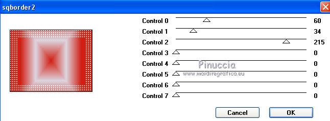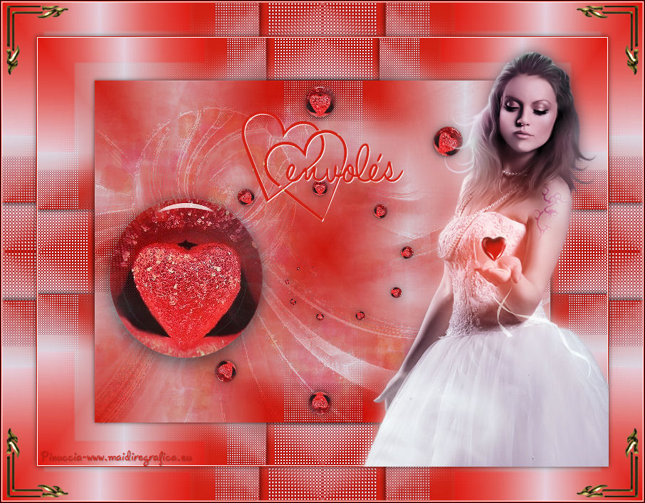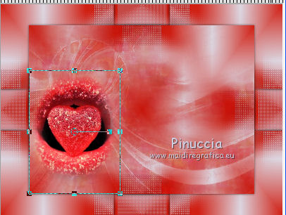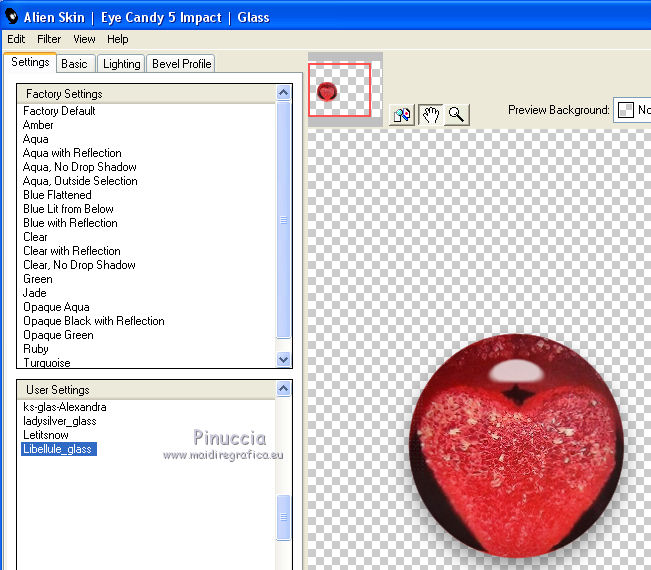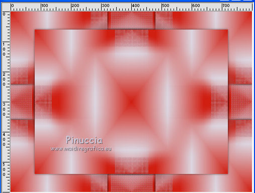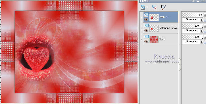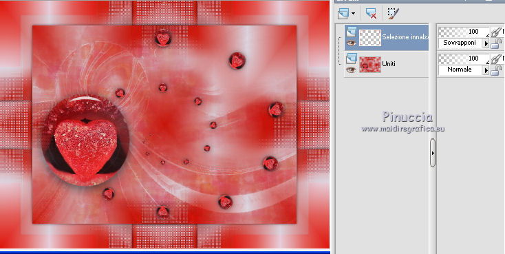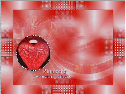 qui puoi trovare qualche risposta ai tuoi dubbi. Se l'argomento che ti interessa non è presente, ti prego di segnalarmelo. Questo tutorial è stato creato da Libellule con X12, ma può essere eseguito con tutte le versioni di PSP Dalla versione X4, il comando Immagine>Rifletti è stato sostituito con Immagine>Capovolgi in orizzontale, e il comando Immagine>Capovolgi con Immagine>Capovolgi in verticale. Nelle versioni X5 e X6, le funzioni sono state migliorate rendendo disponibile il menu Oggetti. Con la nuova versione X7, sono tornati i comandi Rifletti e Capovolgi, ma con nuove differenze. Vedi la scheda sull'argomento qui Per tradurre questo tutorial ho usato PSP X. Occorrente. Materiale qui Tutto il materiale utilizzato è di Libellule. Filtri in caso di dubbi, ricorda di consultare la mia sezione filtri qui Penta.com - Dot and Cross qui Filters Unlimited 2.0 qui AFS IMPORT - sqborder2 qui Simple - 4way average, Top left mirror qui Alien Skin Snap Art qui Mura's Meister - Copies qui Alien Skin Eye Candy 5 Impact - Glass qui I filtri AFS IMPORT e Simple si possono usare da soli o importati in Filters Unlimited (come fare vedi qui) Se un filtro fornito appare con questa icona ![]() Metti i preset Cliccando sul file una o due volte (a seconda delle tue impostazioni), automaticamente il preset si installerà nella cartella corretta. perchè uno o due clic vedi qui Apri la maschera in PSP e minimizzala con il resto del materiale. 1. Imposta il colore di primo piano con #dcd6e0, e il colore di sfondo con #d11f13. ![]() se vuoi usare altri colori, scegli due colori contrastanti Passa il colore di primo piano a Gradiente di primo piano/sfondo, stile Rettangolare. ![]() 2. Apri coeurs_envoles_canal_alpha.pspimage. Finestra>Duplica, o sulla tastiera maiuscola+D per fare una copia. Chiudi l'originale. La copia, che sarà la base del tuo lavoro, non è vuota, ma contiene le selezioni salvate sul canale alfa. Riempi l'immagine trasparente con il gradiente.3. Effetti>Plugins>AFS IMPORT - sqborder2. ![]() Effetti>Effetti di bordo>Aumenta. 4, Effetti>Effetti di immagine>Motivo unico, con i settaggi standard. ![]() 5. Livelli>Duplica. Immagine>Ridimensiona, all'80%, tutti i livelli non selezionato. ![]() 6. Effetti>Effetti 3D>Sfalsa ombra. ![]() 7. Livelli>Duplica. Effetti>Effetti di immagine>Motivo unico, con i settaggi standard. ![]() Livelli>Disponi>Sposta giù. 8. Effetti>Effetti 3D>Sfalsa ombra, con i settaggi precedenti. ![]() 9. Dovresti avere questo. ![]() Livelli>Unisci>Unisci visibile. 10. Selezione>Carica/Salva selezione>Carica selezione da canale alfa. La selezione sélection#1 è subito disponibile. Devi soltanto cliccare Carica. ![]() 11. Livelli>nuovo livello raster. Riempi con il colore rosso di sfondo (tasto destro del mouse).12. Livelli>Nuovo livello maschera>Da immagine. Apri il menu sotto la finestra di origine e vedrai la lista dei files aperti. Seleziona la maschera coeur_envole_masque_libellule, con i seguenti settaggi. ![]() Effetti>Effetti di bordo>Aumenta. Selezione>Deseleziona. Livelli>Unisci>Unisci gruppo. 13. Cambia la modalità di miscelatura di questo livello in Moltiplica, e abbassa l'opacità al 60%. ![]() 14. Effetti>Plugins>Alien Skin Snap Art - Watercolor. Seleziona il preset libellule watercolor e ok. In caso di problemi con il preset, puoi copiare i settaggi che vedi nella schermata. ![]() Regola>Messa a fuoco>Metti a fuoco. Livelli>Unisci>Unisci visibile. 15. Selezione>Carica/Salva selezione>Carica selezione da canale alfa. Apri il menu delle selezioni e carica sélection#2. ![]() 16. Selezione>Innalza selezione a livello. Selezione>Deseleziona. 17. Apri il mist libellulegraphisme_levres_coeur.png e vai a Modifica>Copia. Torna al tuo lavoro e vai a Modifica>Incolla come nuovo livello. Immagine>Ridimensiona, al 70%, tutti i livelli non selezionato. Posiziona il tube sull'area della selezione innalzata.![]() Abbassa l'opacità di questo livello all'80%. ![]() Livelli>Unisci>Unisci giù, per avere il livello della selezione innalzata e il mist su un unico livello. 18. Selezione>Carica/Salva selezione>Carica selezione da canale alfa. Apri il menu delle selezioni e carica nuovamente sélection#2. ![]() Selezione>Inverti. Premi sulla tastiera il tasto CANC ![]() 19. Di nuovo Selezione>Inverti. Effetti>Plugins>Alien Skin Eye Candy 5 Impact - Glass. Seleziona il preset libellule_glass e ok. ![]() Questi i settaggi del preset. ![]() E questo il risultato: ![]() Per il mio esempio, ho scelto di giocare sul settaggio di Bevel Width (pixels): ![]() Selezione>Deseleziona. 20. Regola>Messa a fuoco>Metti a fuoco. 21. Livelli>Duplica. Immagine>Ridimensiona, al 20%, tutti i livelli non selezionato. Lascialo come sta. Non spostarlo. 22. Effetti>Plugins>Mura's Meister - Copies. ![]() 23. Livelli>Disponi>Sposta giù. Effetti>Effetti di immagine>Scostamento. ![]() 24. Attiva nuovamente il livello superiore. Livelli>Unisci>Unisci giù. Effetti>Effetti 3D>Sfalsa ombra. ![]() 25. Livelli>Unisci>Unisci visibile. 26. Selezione>Carica/Salva selezione>Carica selezione da canale alfa. Apri il menu delle selezioni e carica sélection#3. ![]() Selezione>Innalza selezione a livello. Selezione>Deseleziona. 27. Effetti>Effetti 3D>Smusso a incasso. ![]() 28. Effetti>Effetti di immagine>Scostamento. ![]() 29. Effetti>Plugins>Simple - 4Way Average. 30. Cambia la modalità di miscelatura di questo livello in Sovrapponi. ![]() 31. Immagine>Aggiungi bordatura, 1 pixel, simmetriche, colore bianco #ffffff. Immagine>Aggiungi bordatura, 1 pixel, simmetriche, colore rosso di sfondo. 32. apri il tube libellulegraphisme_Speaking_a_Dead_Language_by_Kechake.png, e vai a Modifica>Copia. Torna al tuo lavoro e vai a Modifica>Incolla come nuovo livello. Spostalo 33. Livelli>Duplica. Regola>Sfocatura>Sfocatura gaussiana - raggio 10. ![]() Livelli>Disponi>Sposta giù. 34. Attiva il livello inferiore. Selezione>Seleziona tutto. Immagine>Aggiungi bordatura, 50 pixels, simmetriche, colore bianco #ffffff. 35. Modifica>C