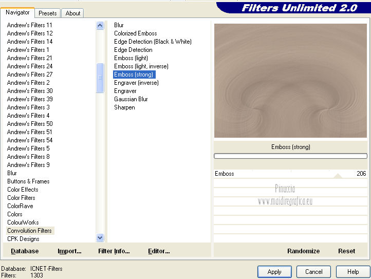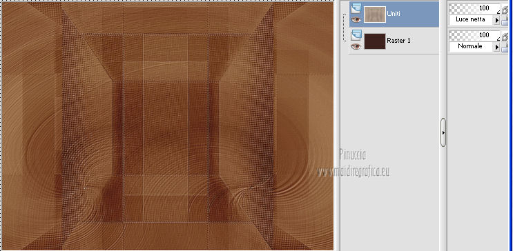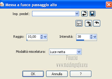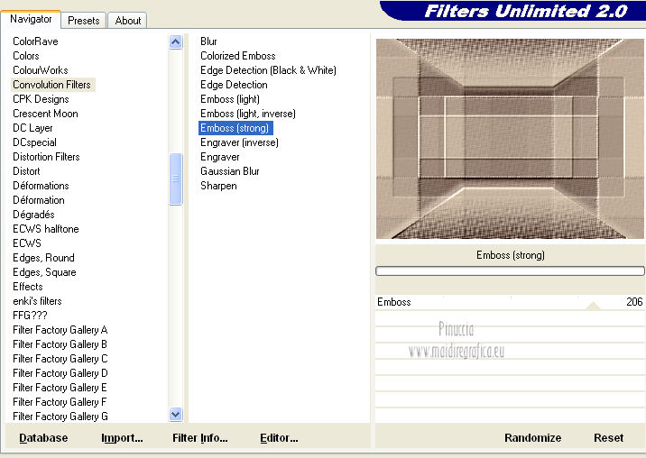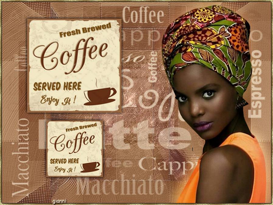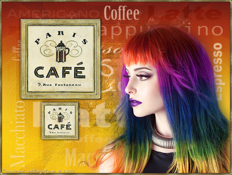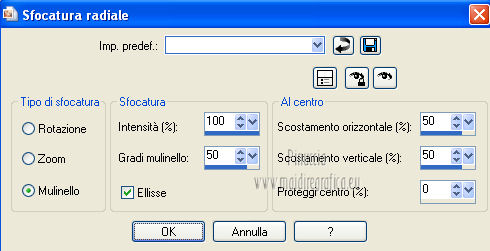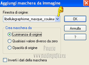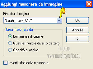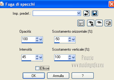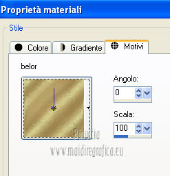 qui puoi trovare qualche risposta ai tuoi dubbi. Se l'argomento che ti interessa non è presente, ti prego di segnalarmelo. Questo tutorial è stato creato con PSP XII, ma può essere eseguito anche con le altre versioni di PSP. Per tradurlo ho usato PSP X. Occorrente. Materiale qui Il tube della donna è di Guismo. Una maschera è di Narah. Il resto del materiale è di Libellule. Filtri: Filters Unlimited 2.0 qui Apri le maschere in PSP e minimizzale con il resto del materiale. 1. Imposta il colore di primo piano con #3c221d, e il colore di sfondo con #f3e1c8. ![]() Apri una nuova immagine 800 x 600 pixels, e riempila con il colore di sfondo #f3e1c8.2. Livelli>Nuovo livello raster. Riempi con il colore di primo piano #3c221d.3. Livelli>Nuovo livello maschera>Da immagine. Apri il menu sotto la finestra di origine e vedrai la lista dei files aperti. Seleziona la maschera Narah_mask_0171, con i seguenti settaggi. ![]() Livelli>Unisci>Unisci gruppo. Livelli>Unisci>Unisci visibile. Effetti>Effetti di bordo>Aumenta. Livelli>Duplica. 4. Effetti>Plugins>Filters Unlimited 2.0 - Convolution Filters - Emboss (strong). ![]() Immagine>Ruota per gradi - 90 gradi a sinistra. ![]() 5. Immagine>Ridimensiona, all'85%, tutti i livelli non selezionato. Livelli>Unisci>Unisci visibile. Livelli>Duplica. 6. Regola>Sfocatura>Sfocatura radiale. ![]() Livelli>Duplica. Immagine>Rifletti. Abbassa l'opacità di questo livello al 50%. Livelli>Unisci>Unisci giù. 7. Effetti>Plugins>Filters Unlimited 2.0 - Convolution Filters - Emboss (strong). ![]() Ripeti l'Effetto una seconda volta. Abbassa l'opacità di questo livello al 75%. Livelli>Unisci>Unisci visibile. 8. Livelli>Nuovo livello raster. Riempi con il colore di primo piano #3c221d.Livelli>Disponi>Sposta giù. Attiva il livello superiore. Cambia la modalità di miscelatura di questo livello in Luce netta. ![]() 9. Livelli>Nuovo livello raster Selezione>Seleziona tutto. Apri il tube Apos-111119-102-s121-11-ak.png e vai a Modifica>Copia. Torna al tuo lavoro e vai a Modifica>Incolla nella selezione. Selezione>Deseleziona. Cambia la modalità di miscelatura di questo livello in Luminanza (esistente). Effetti>Effetti di bordo>Aumenta. 10. Livelli>Nuovo livello raster. Riempi con il colore di sfondo #f3e1c8.Livelli>Nuovo livello maschera>Da immagine. Apri il menu sotto la finestra di origine e seleziona la maschera libellulegraphisme_masque_couleur_cafe, con i seguenti settaggi. ![]() Livelli>Unisci>Unisci gruppo. 11. Passa il colore di primo piano a Motivi e seleziona il motivo "Belor". ![]() Apri l'immagine Angela-Staehling-Parisienne-Caf e vai a Modifica>Copia. Torna al tuo lavoro e vai a Modifica>Incolla come nuovo livello. Immagine>Ridimensiona, al 70%, tutti i livelli non selezionato. Selezione>Seleziona tutto. Selezione>Mobile. Selezione>Immobilizza. Livelli>Nuovo livello raster. Riempi con il motivo oro.Selezione>Modifica>Contrai - 3 pixels. Selezione>Deseleziona. Effetti>Effetti 3D>Smusso a incasso. ![]() Livelli>Duplica. Immagine>Ridimensiona, al 90%, tutti i livelli non selezionato. Livelli>Unisci>Unisci giù - 2 volte. 12. Effetti>Effetti di immagine>Scostamento. ![]() 13. Effetti>Effetti di riflesso>Fuga di specchi. ![]() 14. Attiva lo strumento Selezione a mano libera ,sfumatura e tolleranza 0, o lo strumento Selezione ![]() e traccia una selezione intorno ai quadri inferiori ![]() Premi sulla tastiera il tasto CANC ![]() Selezione>Deseleziona. 15. Effetti>Effetti 3D>Sfalsa ombra. ![]() Ripeti l'Effetto Sfalsa ombra, cambiando verticale e orizzontale con -2. Regola>Messa a fuoco>Metti a fuoco. 16. Apri il tube calguisgoldenbeauty18102012 e vai a Modifica>Copia. Torna al tuo lavoro e vai a Modifica>Incolla come nuovo livello. Immagine>Ridimensiona, al 65%, tutti i livelli non selezionato. Sposta il tube a destra.Regola>Messa a fuoco>Messa a fuoco passaggio alto. ![]() se stai usando Psp 9 non trovi questo strumento. Sostituisci il passaggio con Regola>Messa a fuoco>Metti a fuoco Livelli>Duplica. Regola>Sfocatura>Sfocatura gaussiana - raggio 20. ![]() Cambia la modalità di miscelatura di questo livello in Filtra. Livelli>Disponi>Sposta giù. 17. Immagine>Aggiungi bordatura, 1 pixel, simmetriche, con il colore di primo piano #3c221d. Immagine>Aggiungi bordatura, 5 pixels, simmetriche, con il colore bianco. Attiva lo strumento Bacchetta magica , sfumatura e tolleranza 0,e clicca nel bordo bianco selezionarlo. Riempi la selezione con il motivo oro.Selezione>Inverti. Effetti>Effetti 3D>Sfalsa ombra, con il colore nero. ![]() Ripeti l'Effetto Sfalsa ombra, cambiando verticale e orizzontale con -2. Selezione>Deseleziona. Immagine>Aggiungi bordatura, 1 pixel, simmetriche, con il colore nero. 18. Immagine>Ridimensiona, a 800 pixels di larghezza (o come preferisci), tutti i livelli selezionato. Regola>Messa a fuoco>Metti a fuoco. Firma il tuo lavoro e salva in formato jpg. Per questo esempio ho usato un tube di Mary. ![]() ![]() Le vostre versioni. Grazie ![]() Gianni ![]() Se hai problemi o dubbi, o trovi un link non funzionante, o anche soltanto per un saluto, scrivimi. 18 marzo 2013 |