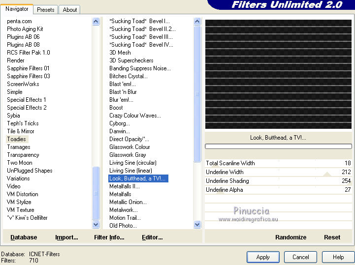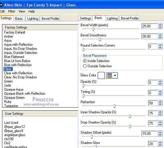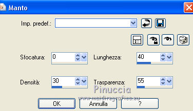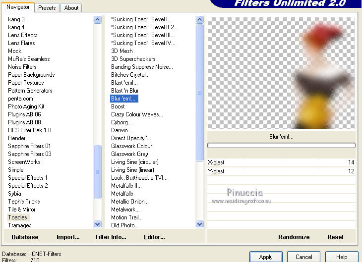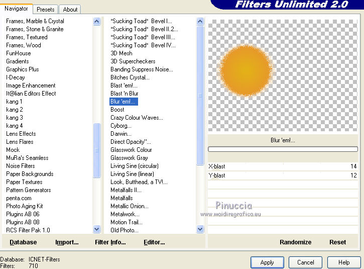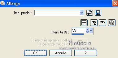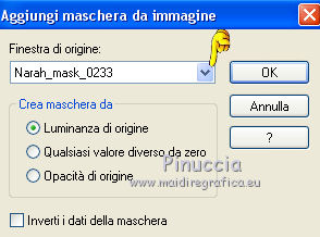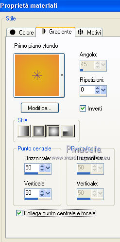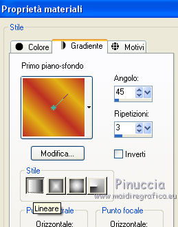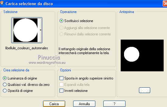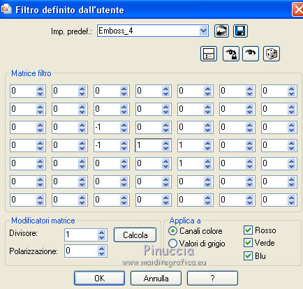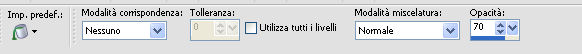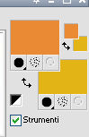qui puoi trovare qualche risposta ai tuoi dubbi. Se l'argomento che ti interessa non è presente, ti prego di segnalarmelo. Questo tutorial è stato creato con PSP XII, ma può essere eseguito anche con le altre versioni di PSP. Per tradurlo ho usato PSP X. Occorrente. Materiale qui La maschera è di Narah. Il resto del materiale è di Libellule. Filtri: se hai problemi con il filtri consulta la mia sezione filtri qui Filters Unlimited 2.0 qui Toadies qui Alien Skin Eye Candy 5 Impact - Glass qui I filtri Toadies si possono usare da soli o importati in Filters Unlimited. come fare vedi qui) Se un filtro fornito appare con questa icona ![]() Metti il preset Emboss 4 nella cartella Impostazioni predefinite. Metti la selezione nella cartella Selezioni. Apri la maschera in PSP e minimizzala con il resto del materiale. 1. Imposta il colore di primo piano con #bd2f23, e il colore di sfondo con #e2b416. ![]() Passa il colore di primo piano a Gradiente, stile Lineare, con i seguenti settaggi: ![]() 2. Apri una nuova immagine trasparente 800 x 600 pixels, e riempila con il gradiente.3. Regola>Sfocatura>Sfocatura gaussiana - raggio 20. ![]() 4. Effetti>Effetti tecniche di disegno>Pennellate. ![]() Effetti>Effetti di bordo>Aumenta. 5. Effetti>Effetti di trama>Manto. ![]() Effetti>Effetti di distorsione>Allarga (nelle versioni più recenti Espansione) ![]() 6. Livelli>Nuovo livello raster. Selezione>Seleziona tutto. Apri il tube couleurs_automnales_spirale.png e vai a Modifica>Copia. Torna al tuo lavoro e vai a Modifica>Incolla nella selezione. Selezione>Deseleziona. Effetti>Effetti di bordo>Erodi. Cambia la modalità di miscelatura di questo livello in Luce diffusa, e abbassa l'opacità al 50%. 7. Imposta il colore di primo piano con il colore nero. Imposta l'opacità dello strumento Riempimento al 70%. ![]() Livelli>Nuovo livello raster. Riempi il livello con il colore nero.Prima di dimenticarlo, riporta l'opacità dello strumento Riempimento a 100 Effetti>Plugins>Filters Unlimited 2.0 - Toadies - Look Buthead a TV! ![]() 8. Livelli>Nuovo livello maschera>Da immagine. Apri il menu sotto la finestra di origine e vedrai la lista dei files aperti. Seleziona la maschera Narah_mask_0233. ![]() Livelli>Unisci>Unisci gruppo. Effetti>Filtro definito dall'utente - seleziona il preset Emboss 4 e ok. puoi anche impostare manualmente i settaggi che vedi nella schermata ![]() 9. Imposta il colore di primo piano con #ea8a36, e mantieni il colore di sfondo con #e2b416. ![]() Passa il colore di primo piano a Gradiente, stile Sprazzo di luce ![]() Livelli>Nuovo livello raster. Selezione>Carica/Salva selezione>Carica selezione da disco. Cerca e carica la selezione libellule_couleurs_automnales. ![]() Riempi la selezione con il gradiente.Selezione>Deseleziona. 10. Livelli>Duplica. Effetti>Plugins>Filters Unlimited 2.0 - Toadies - Blur' eml, con i settaggi standard. ![]() Livelli>Disponi>Sposta giù. Regola>Aggiungi/Rimuovi disturbo>Aggiungi disturbo. ![]() Attiva nuovamente il livello superiore. 11. Livelli>Nuovo livello raster. elezione>Carica/Salva selezione>Carica selezione da disco. Carica nuovamente la selezione libellule_couleurs_automnales. ![]() Apri il tube "libellulegraphisme_mist paysage automne" e vai a Modifica>Copia. Torna al tuo lavoro e vai a Modifica>Incolla nella selezione. Livelli>Unisci>Unisci giù. Mantieni selezionato. Effetti>Plugins>Alien Skin Eye Candy 5 Impact - Glass. ![]() Selezione>Deseleziona. 12. Apri il tube della donna libellulegraphisme_couleurs_automnales e vai a Modifica>Copia. Torna al tuo lavoro e vai a Modifica>Incolla come nuovo livello. Immagine>Ridimensiona, all'83%, tutti i livelli non selezionato. Regola>Messa a fuoco>Metti a fuoco. Sposta il tube a destra.13. Livelli>Duplica. Regola>Sfocatura>Sfocatura gaussiana - raggio 20. ![]() Come fatto per il cerchio: Effetti>Plugins>Filters Unlimited 2.0 - Toadies - Blur' eml, con i settaggi standard. ![]() Regola>Aggiungi/Rimuovi disturbo>Aggiungi disturbo. ![]() Livelli>Disponi>Sposta giù. 14. Attiva nuovamente il livello superiore. Apri il wordart libellulegraphisme_wordart_couleurs_automne.png. Modifica>Copia. Torna al tuo lavoro e vai a Modifica>Incolla come nuovo livello. Posiziona il testo intorno al medaglione.Effetti>Effetti 3D>Sfalsa ombra, colore bianco. ![]() 15. Immagine>Aggiungi bordatura, 2 pixels, simmetriche, con il colore nero. Immagine>Aggiungi bordatura, 25 pixels, simmetriche, con il colore bianco. 16. Attiva lo strumento Bacchetta magica , sfumatura e tolleranza 0,e clicca nel bordo bianco per selezionarlo. Imposta i colori e il gradiente iniziali. Primo piano #bd2f23, Sfondo con #e2b416. ![]() Gradiente, stile Lineare ![]() Livelli>Nuovo livello raster. Riempi la selezione con il gradiente.17. Regola>Sfocatura>Sfocatura gaussiana - raggio 20. ![]() 18. Effetti>Effetti tecniche di disegno>Pennellate. ![]() 19. Effetti>Effetti di trama>Manto. ![]() Effetti>Effetti di bordo>Aumenta. Selezione>Deseleziona. 20. Immagine>Aggiungi bordatura, 2 pixels, simmetriche, con il colore nero. Immagine>Aggiungi bordatura, 1 pixel, simmetriche con il colore giallo. 21. Livelli>Unisci>Unisci tutto. Firma il tuo lavoro. Immagine>Ridimensiona, a 800 pixels di larghezza, o come preferisci, tutti i livelli selezionato. Salva in formato jpg. ![]() Se hai problemi o dubbi, o trovi un link non funzionante, o anche soltanto per un saluto, scrivimi. 14 Ottobre 2013 |