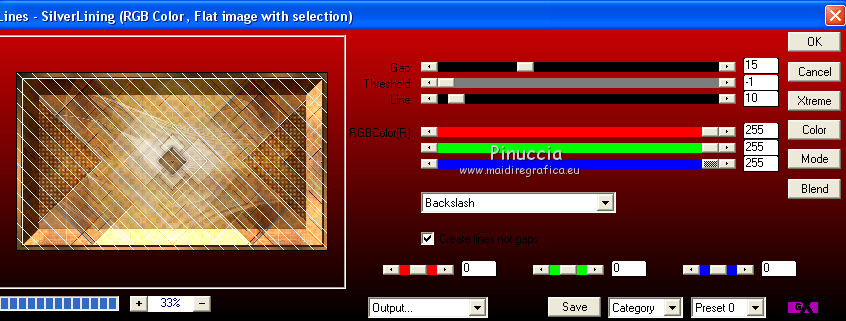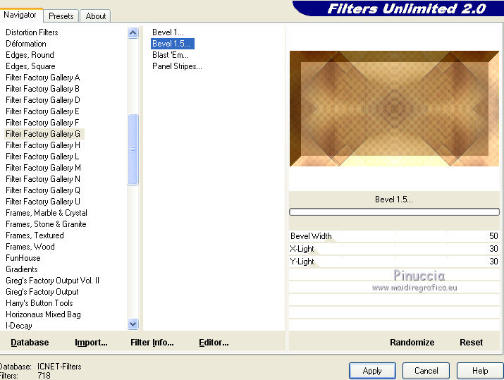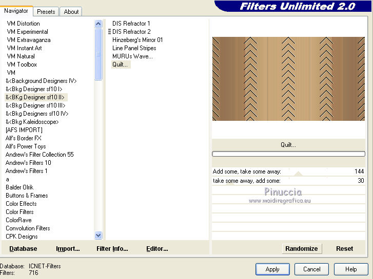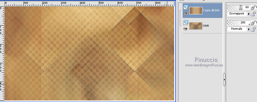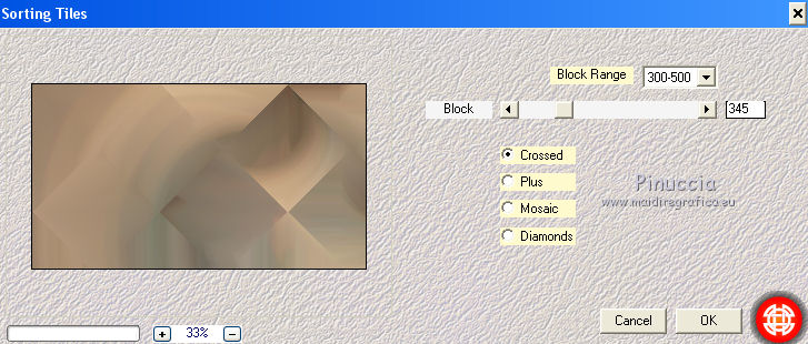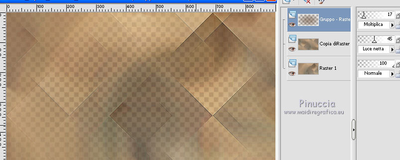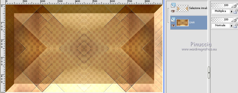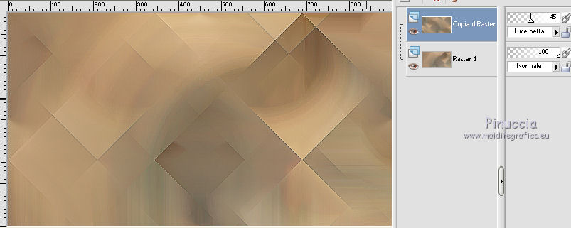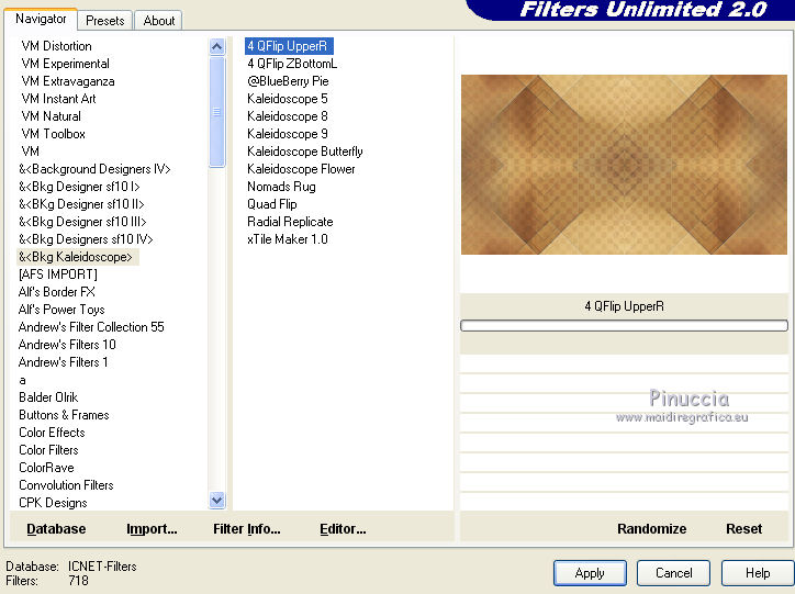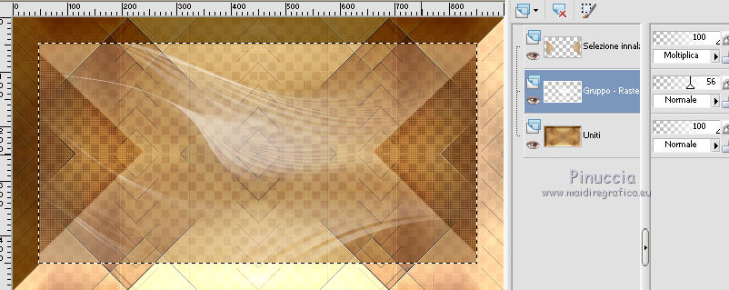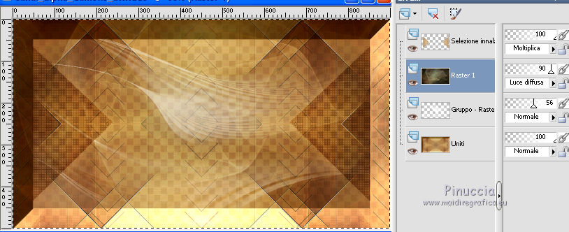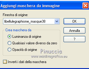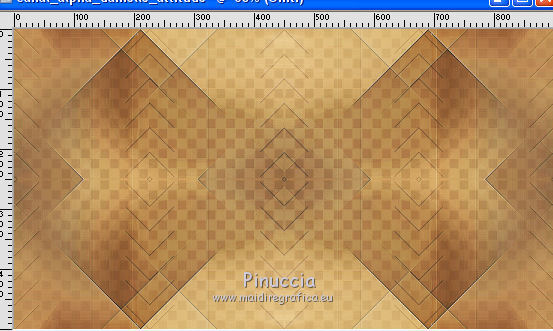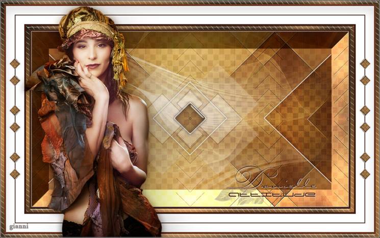 qui puoi trovare qualche risposta ai tuoi dubbi. Se l'argomento che ti interessa non è presente, ti prego di segnalarmelo. Questo tutorial è stato creato da Libellule con X19 e tradotto con CorelX, ma può essere eseguito con tutte le versioni di PSP Dalla versione X4, il comando Immagine>Rifletti è stato sostituito con Immagine>Capovolgi in orizzontale, e il comando Immagine>Capovolgi con Immagine>Capovolgi in verticale. Nelle versioni X5 e X6, le funzioni sono state migliorate rendendo disponibile il menu Oggetti. Con la nuova versione X7, sono tornati i comandi Rifletti e Capovolgi, ma con nuove differenze. Vedi la scheda sull'argomento qui Occorrente. Materiale qui Questo tutorial è dedicato a Danielle (pseudo Danisha). (in questa pagina trovi i links ai loro siti). Filtri in caso di dubbi, ricorda di consultare la mia sezione filtri qui Filters Unlimited 2.0 qui Mehdi - Sorting Tiles qui &<Bkg Designer sf10II> - Quilt (da importare in Unlimited) qui &<Bkg Designer Kaleidoscope> - 4 QFlip UpperR (da importare in Unlimited) qui Factory Gallery G - Bevel 1.5 qui AFS IMPORT - sqborder2 qui Graphics Plus - Cross shadow qui AP 01 [Innovations] - Lines SilverLining qui Alien Skin Eye Candy 5 - Perspective Shadow, Glass qui Simple - 4Way Average qui I filtri Simple, Factory Gallery, Graphics Plus e AFS IMPORT si possono usare da soli o importati in Filters Unlimited (come fare vedi qui) Se un filtro fornito appare con questa icona ![]() non esitare a cambiare modalità di miscelatura e opacità secondo i colori utilizzati. Metti i presets Cliccando sul file una o due volte (a seconda delle tue impostazioni), automaticamente il preset si installerà nella cartella corretta. perchè uno o due clic vedi qui Se preferisci, puoi importare direttamente il preset nel corso del tutorial Come fare vedi la scheda del filtro Eye Candy qui Apri le maschere in PSP e minimizzale con il resto del materiale. Colori utilizzati ![]() 1. Imposta il colore di primo piano con il colore 1 #f4d5a9 e il colore di sfondo con il colore 2 #6f3720. ![]() 2. Apri canal_alpha_danielle_attitude_pspimage. Finestra>Duplica, o sulla tastiera maiuscola+D per fare una copia. Chiudi l'originale. La copia, che sarà la base del tuo lavoro non è vuota, ma contiene le selezioni salvate sul canale alfa. 3. Selezione>Seleziona tutto. Apri l'immagine di sfondo libellule_fond_danielle_attitude.jpg si usi altri colori, più tardi potrai colorizzarla Modifica>Copia. Torna al tuo lavoro e vai a Modifica>Incolla nella selezione. 4. Effetti>Plugins>Mehdi - Sorting Tiles. ![]() 5. Effetti>Effetti di bordo>Aumenta di più. Selezione>Deseleziona. 6. Livelli>Duplica. Effetti>Effetti di immagine>Motivo unico, con i settaggi standard. ![]() 7. Immagine>Rifletti. Cambia la modalità di miscelatura di questo livello in Luce netta, e abbassa l'opacità al 45%. ![]() 8. Livelli>Nuovo livello raster. Imposta il colore di primo piano con il colore 3 #401f12 ![]() Riempi il livello con il colore 3.9. Livelli>Nuovo livello maschera>Da immagine. Apri il menu sotto la finestra di origine e vedrai la lista dei files aperti. Seleziona la maschera libellulegraphisme_masque38.jpg ![]() Livelli>Unisci>Unisci gruppo. 10. Effetti>Effetti di bordo>Aumenta. Effetti>Effetti di bordo>Aumenta di più. 11. Cambia la modalità di miscelatura di questo livello in Moltiplica e abbassa l'opacità al 17%. ![]() 12. Livelli>Unisci>Unisci visibile. 13. Regola>Messa a fuoco>Metti a fuoco. Dovresti avere questo. ![]() 14. Livelli>Duplica. Effetti>Effetti di immagine>Scostamento. ![]() 15. Regola>Messa a fuoco>Metti a fuoco. 16. Effetti>Plugins>Simple - 4 way average. 17. Effetti>Plugins>Filters Unlimited 2.0 - &<Bkg Designer sf10II> - Quilt. ![]() 18. Cambia la modalità di miscelatura di questo livello in Sovrapponi, e abbassa l'opacità al 60%. ![]() 19. Livelli>Unisci>Unisci visibile. 20. Effetti>Plugins>Filters Unlimited 2.0 - &<Bkg Designer Kaleidoscope> - 4 QFlip UpperR. ![]() Dovresti avere questo: ![]() 21. Effetti>Plugins>Filter Factory Gallery G - Bevel 1.5. ![]() Secondo la versione di Unlimited utilizzata o se usi il filtro da solo, potresti avere un risultato differente 22. Selezione>Carica/Salva selezione>Carica selezione da canale alfa. La selezione sélection#1 è subito disponibile. Devi soltanto cliccare Carica. ![]() Selezione>Innalza selezione a livello. Selezione>Deseleziona. 23. Effetti>Plugins>AFS Import - sqborder2. ![]() 24. Livelli>Duplica. Immagine>Rifletti. Livelli>Unisci>Unisci giù. 25. Cambia la modalità di miscelatura di questo livello in Moltiplica. 26. Attiva il livello di sfondo. ![]() Selezione>Carica/Salva selezione>Carica selezione da canale alfa. Apri il menu delle selezioni e carica Sélection#2. ![]() 27. Livelli>Nuovo livello raster. Imposta il colore di primo piano con il colore bianco. Riempi con il colore bianco.28. Livelli>Nuovo livello maschera>Da immagine. Apri il menu sotto la finestra di origine e seleziona la maschera Narah_mask_0413. ![]() Livelli>Unisci>Unisci gruppo. 29. Abbassa l'opacità di questo livello al 56%. ![]() 30. Selezione>Seleziona tutto. Livelli>Nuovo livello raster. 31. Apri il frattale ©Alice Kelley (30).jpg e vai a Modifica>Coipia. Torna al tuo lavoro e vai a Modifica>Incolla nella selezione. 32. Cambia la modalità di miscelatura di questo livello in Luce diffusa, e abbassa l'opacità al 90%. ![]() Selezione>Deseleziona. 33. Attiva il livello superiore. Apri il tube libellule_decor1_danielle_attitude.png e vai a Modifica>Copia. Torna al tuo lavoro e vai a Modifica>Incolla come nuovo livello. Lascialo come sta. E' al suo posto. 34. Apri il tube libellule_decor2_danielle_attitude.png e vai a Modifica>Copia. Torna al tuo lavoro e vai a Modifica>Incolla come nuovo livello. Lascialo come sta. E' al suo posto. Livelli>Disponi>Sposta giù. 35. Immagine>Aggiungi bordatura, 1 pixel, simmetriche, colore bianco. Immagine>Aggiungi bordatura, 5 pixels, simmetriche, colore 3 #401f12 .36. Selezione>Seleziona tutt