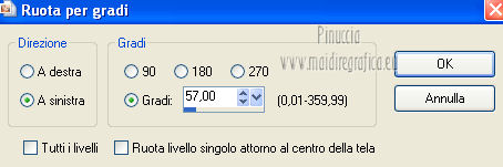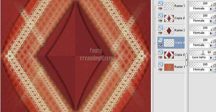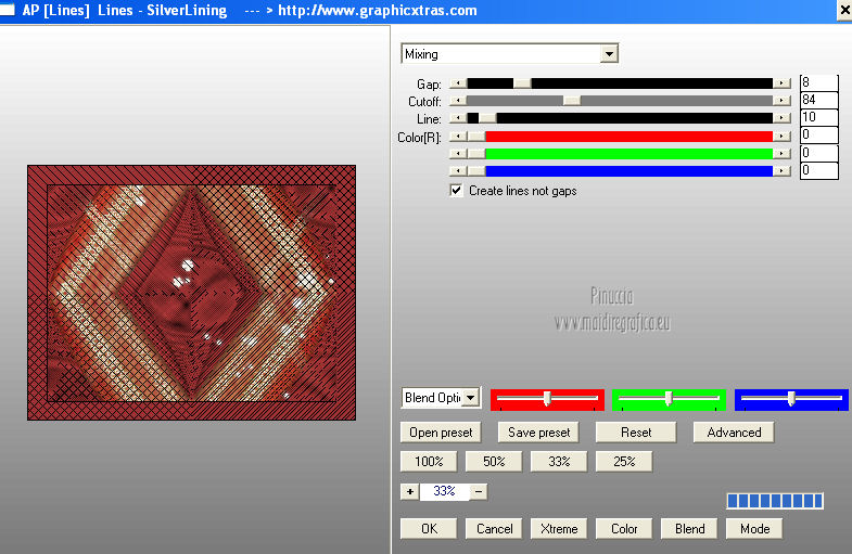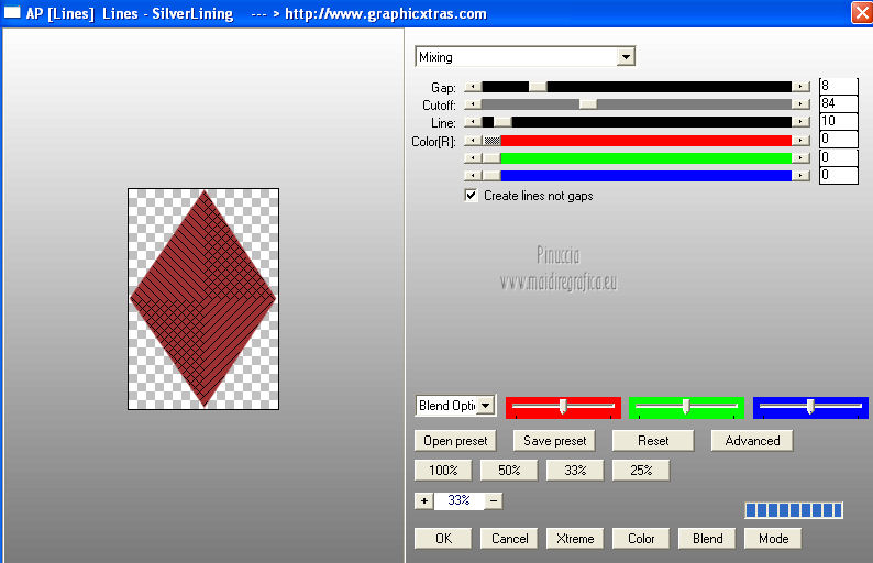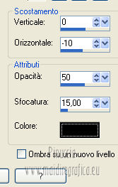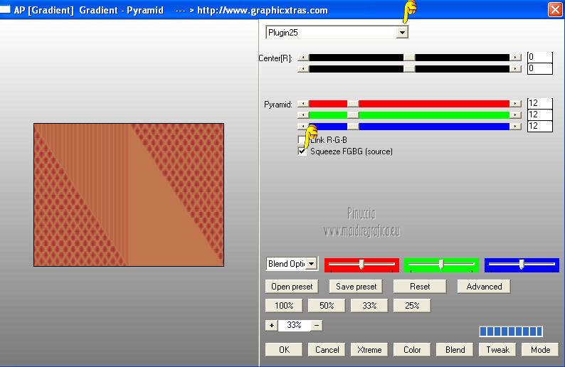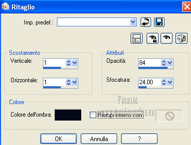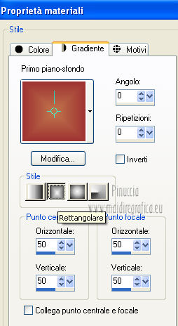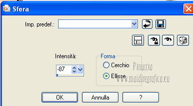 qui puoi trovare qualche risposta ai tuoi dubbi. Se l'argomento che ti interessa non è presente, ti prego di segnalarmelo. Questo tutorial è stato creato con PSP XII, ma può essere eseguito anche con le altre versioni di PSP. Per tradurlo ho usato PSP X. Occorrente. Materiale qui Il tube della donna è di Cibi-Bijoux. Il resto del materiale è di Libellule. Filtri: AP Lines - Lines SilverLining qui AP Gradient - Gradient Pyramid qui Metti le selezioni nella cartella Selezioni. 1. Imposta il colore di primo piano con #c1764d, e il colore di sfondo con #9e3232. ![]() Passa il colore di primo piano a Gradiente, con i seguenti settaggi. ![]() 2. Apri una nuova immagine 800 x 600 pixels, e riempila con il gradiente.3. Effetti>Plugins>AP [Gradient] - Gradient-Pyramid. ![]() 4. Livelli>Duplica. Immagine>Rifletti. Abbassa l'opacità di questo livello al 50%. Livelli>Unisci>Unisci giù. 5. Livelli>Nuovo livello raster. Selezione>Carica/Salva selezione>Carica selezione da disco. Cerca e carica la selezione libellule_danisha. ![]() Riempi la selezione con il colore di sfondo #9e3232.6. Effetti>Plugins>AP Lines - Lines SilverLining. ![]() secondo i tuoi colori l'effetto potrebbe cambiare. Gioca con i primi cursori Selezione>Deseleziona. 7. Livelli>Duplica. Effetti>Effetti di immagine>Motivo unico, con i settaggi standard. ![]() Cambia la modalità di miscelatura di questo livello in Luce netta, e abbassa l'opacità al 60%. Livelli>Disponi>Sposta giù. 8. Attiva il livello superiore. Livelli>Duplica. Effetti>Effetti geometrici>Sfera. ![]() 9. Effetti>Effetti 3D>Sfalsa ombra. ![]() Ripeti l'Effetto Sfalsa ombra in negativo. ![]() Attiva il livello sottostante. Ripeti l'Effetto Sfalsa ombra, in positivo e in negativo. 10. Attiva il livello superiore. Effetti>Effetti di immagine>Motivo unico. ![]() 11. Apri il tube ruban_irin_s.png, e vai a Modifica>Copia. Torna al tuo lavoro e vai a Modifica>Incolla come nuovo livello. 12. Immagine>Ruota per gradi - 57 gradi a sinistra. ![]() 13. Effetti>Effetti di immagine>Scostamento. ![]() Livelli>Duplica. Immagine>Rifletti. Livelli>Unisci>Unisci giù. Livelli>Duplica. Immagine>Capovolgi. Livelli>Unisci>Unisci giù. 14. Seelezione>Carica/Salva selezione>Carica selezione da disco. Cerca e carica la selezione libellule_danisha2. ![]() Premi sull tastiera il tasto CANC ![]() Selezione>Deseleziona. 15. Livelli>Duplica. Immagine>Ridimensiona, al 70%, tutti i livelli non selezionato. Effetti>Effetti di immagine>Motivo unico, seleziona il preset Fianco a fianco. ![]() Livelli>Disponi>Sposta giù - 3 volte. ![]() 16. Attiva il livello superiore. Apri il tube danisha_fleurs e vai a Modifica>Copia. Torna al tuo lavoro e vai a Modifica>Incolla come nuovo livello. Regola>Messa a fuoco>Metti a fuoco. Sposta il tube a destra.Livelli>Duplica. Regola>Sfocatura>Sfocatura gaussiana - raggio 5. ![]() Livelli>Disponi>Sposta giù. 17. Immagine>Aggiungi bordatura, 2 pixels, simmetriche, con il colore nero. Immagine>Aggiungi bordatura, 50 pixels, simmetriche, con il colore bianco. Seleziona questo bordo con la bacchetta magica , sfumatura e tolleranza 0.Riempi con il colore di sfondo #9e3232.Effetti>Plugins>AP Lines - Lines SilverLining. ![]() Mantieni selezionato. 18. Effetti>Effetti 3D>Ritaglio. ![]() Ripeti l'Effetto Ritaglio cambiando verticale e orizzontale con -1. Selezione>Deseleziona. 19. Immagine>Aggiungi bordatura, 2 pixels, simmetriche, con il colore nero. Immagine>Aggiungi bordatura, 1 pixel, simmetriche, con il colore di primo piano. 20. Apri il tube Fashion_eyes_CibiBijoux e vai a Modifica>Copia. Torna al tuo lavoro e vai a Modifica>Incolla come nuovo livello. Immagine>Ridimensiona, al 90%, tutti i livelli non selezionato. Spostalo a sinistra.Effetti>Effetti 3D>Sfalsa ombra. ![]() 21. Apri il wordart danisha_wordart e vai a Modifica>Copia. Torna al tuo lavoro e vai a Modifica>Incolla come nuovo livello. Effetti>Effetti 3D>Sfalsa ombra, con i settaggi precedenti. ![]() 22. Firma il tuo lavoro. Livelli>Unisci>Unisci tutto. 23. Immagine>Ridimensiona, a 800 pixels di larghezza, o come preferisci, tutti i livelli selezionato. Regola>Messa a fuoco>Metti a fuoco. Salva in formato jpg. Per questo esempio ho usato un tube di Gabry. ![]() ![]() Le vostre versioni. Grazie ![]() Inge-Lore ![]() Se hai problemi o dubbi, o trovi un link non funzionante, o anche soltanto per un saluto, scrivimi. 18 marzo 2013 |