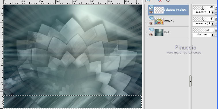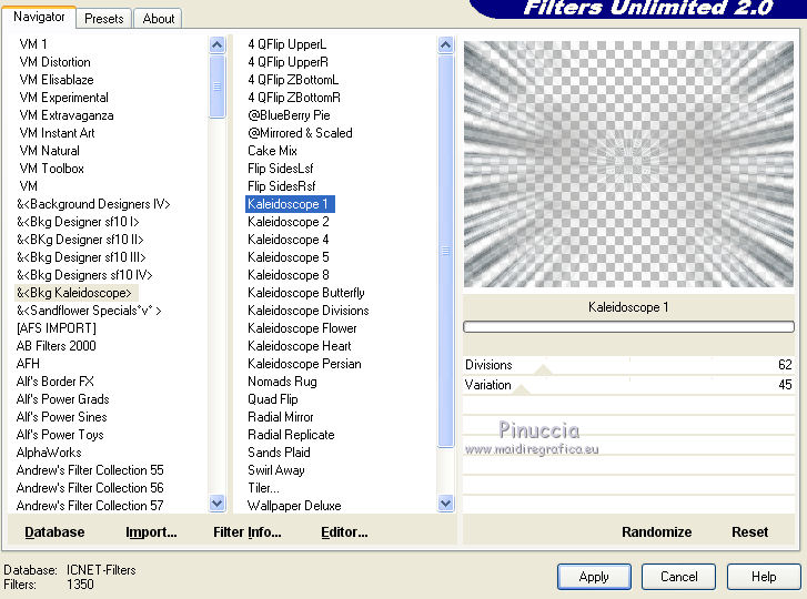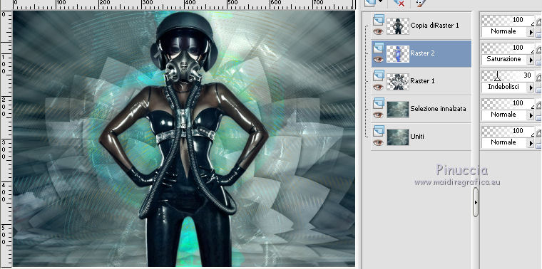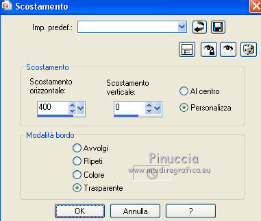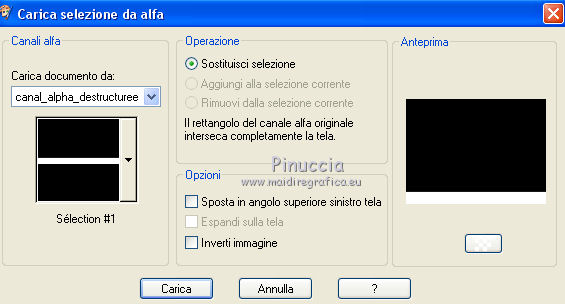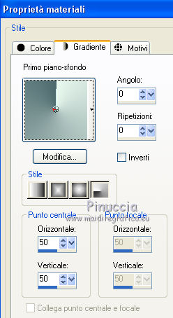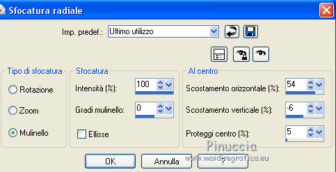 qui puoi trovare qualche risposta ai tuoi dubbi. Se l'argomento che ti interessa non è presente, ti prego di segnalarmelo. Questo tutorial è stato creato da Libellule con X12, ma può essere eseguito con tutte le versioni di PSP Dalla versione X4, il comando Immagine>Rifletti è stato sostituito con Immagine>Capovolgi in orizzontale, e il comando Immagine>Capovolgi con Immagine>Capovolgi in verticale. Nelle versioni X5 e X6, le funzioni sono state migliorate rendendo disponibile il menu Oggetti. Con la nuova versione X7, sono tornati i comandi Rifletti e Capovolgi, ma con nuove differenze. Vedi la scheda sull'argomento qui Per tradurre questo tutorial ho usato PSP X. Occorrente. Materiale qui Filtri in caso di dubbi, ricorda di consultare la mia sezione filtri qui Filters Unlimited 2.0 qui &<Bkg Kaleidoscope> - Kaleidoscope 8 (da importare in Unlimited) qui Simple - Diamonds - Top Left Mirror qui AAA Frames - Texture Frame qui FM Tile Tools - Blend Emboss qui Graphics Plus - Cross Shadow qui Alien Skin Eye Candy 5 Impact - Perspective Shadow qui I filtri Simple e Graphics Plus si possono usare da soli o importati in Filters Unlimited (come fare vedi qui) Se un filtro fornito appare con questa icona ![]() Nelle ultime versioni di PSP non ci sono tutti i gradienti delle versioni precedenti, tra i quelli quello di primo piano/sfondo (Corel_06_029) Trovi i gradienti delle versioni precedenti qui Metti il preset Emboss 3 nella cartella Impostazioni predefinite. 1. Imposta il colore di primo piano con #ebfbf1, e il colore di sfondo con #4c696d. ![]() Passa il colore di primo piano a Gradiente di primo piano/sfondo (Corel_06_029), stile Radiale. ![]() Apri canal_alpha_destructuree.pspimages. Finestra>Duplica, o sulla tastiera maiuscolo+D per fare una copia. ![]() Chiudi l'originale. La copia, che sarà la base del tuo lavoro, non è vuota, ma contiene le selezioni salvate sul canale alfa. Riempi l'immagine trasparente con il gradiente.3. Regola>Sfocatura>Sfocatura gaussiana - raggio 40. ![]() 4. Livelli>Nuovo livello raster. Selezione>Seleziona tutto. 5. Apri il tube libellulegraphisme_cover_heavy_rubber_by_ophelia_overdose.png, cancella il watermark, e vai a Modifica>Copia. non chiudere il tube. Ti servirà ancora Torna al tuo lavoro e vai a Modifica>Incolla nella selezione. Se usi un altro tube l'effetto sarà leggermente differente, ma è normale. É qui l'interessante. Selezione>Deseleziona. 6. Regola>Sfocatura>Sfocatura radiale. ![]() 7. Effetti>Effetti di immagine>Scostamento. ![]() 8. Livelli>Duplica. Immagine>Rifletti. Livelli>Unisci>Unisci giù. 9. Di nuovo Livelli>Duplica. Effetti>Plugins>Filters Unlimited 2.0 - &<Bkg Kaleidoscope> - Kaleidoscope 1. ![]() 10. Cambia la modalità di miscelatura di questo livello in Rafforza e abbassa l'opacità al 30%. ![]() 11. Effetti>Effetto definito dall'utente, seleziona il preset Emboss 3 e ok. ![]() 12. Livelli>Unisci>Unisci visibile. 13. Livelli>Duplica. Effetti>Effetti di immagine>Motivo unico, con i settaggi standard. ![]() 14. Cambia la modalità di miscelatura di questo livello in Luce diffusa, e abbassa l'opacità al 30%. ![]() 15. Livelli>Unisci>Unisci visibile. 16. Apri il tube di Logane logane_forme2_20decembre2011.pspimage, e vai a Modifica>Copia. Torna al tuo lavoro e vai a Modifica>Incolla come nuovo livello. Non spostarlo. 17. Cambia la modalità di miscelatura di questo livello in Luminanza (esistente), e abbassa l'opacità al 45%. ![]() 18. Effetti>Effetti 3D>Sfalsa ombra. ![]() Ripeti l'Effetto Sfalsa ombra, cambiando verticale e orizzontale con 0/-22. ![]() 19. Attiva il livello di sfondo (Uniti). Selezione>Carica/Salva selezione>Carica selezione da canale alfa. La selezione sélection#1 è subito disponibile. Devi soltanto cliccare Carica. ![]() 20. Selezione>Innalza selezione a livello. Livelli>Disponi>Porta in alto. Mantieni selezionato. 22. Effetti>Plugins>AAA Frames - Texture Frame. ![]() 23. Mantieni ancora selezionato. Effetti>Plugins>Graphics Plus - Cross Shadow, con i settaggi standard. ![]() 24. Effetti>Plugins>Simple - Diamonds. Modifica>Ripeti Diamonds. 25. Cambia la modalità di miscelatura di questo livello in Luminanza (esistente), e abbassa l'opacità al 45%. ![]() 26. Mantieni sempre selezionato. Effetti>Plugins>FM Tile Tools - Blend Emboss, con i settaggi standard. ![]() Selezione>Deseleziona. 27. Attiva il livello di sfondo. Livelli>Nuovo livello raster. 28. Selezione>Carica/Salva selezione>Carica selezione da canale alfa. Apri il menu delle selezioni e carica sélection #2. ![]() Apri il tube destructure_libellule.png, e vai a Modifica>Copia. Torna al tuo lavoro e vai a Modifica>Incolla nella selezione. Selezione>Deseleziona. 29. Effetti>Effetti di distorsione>Increspa. ![]() 30. Abbassa l'opacità di questo livello al 30%. 31. Livelli>Duplica. Immagine>Rifletti. 32. Regola>Tonalità e saturazione>Viraggio. ![]() Attenzione, il viraggio va usato soltanto sul livello duplicato. 33. Effetti>Effetti di bordo>Aumenta. 34. Livelli>Unisci>Unisci visibile. 35. Selezione>Carica/Salva selezione>Carica selezione da canale alfa. Apri il menu delle selezioni e carica nuovamente sélection #2. ![]() 36. Selezione>Innalza selezione a livello. 37. Selezione>Modifica>Contrai - 20 pixels. ![]() 38. Effetti>Plugins>Alien Skin Eye Candy 5 Impact - Perspective Shadow Seleziona il preset Reflect in Front-Sharp e ok. ![]() Selezione>Deseleziona. 39. Attiva nuovamente il tube libellulegraphisme_cover_heavy_rubber_by_ophelia_overdose.png e vai a Modifica>Copia. Torna al tuo lavoro e vai a Modifica>Incolla come nuovo livello. 40. Immagine>Ridimensiona, al 70%, tutti i livelli non selezionato. Posiziona il tube al centro.![]() 41. Regola>Messa a fuoco>Messa a fuoco passaggio alto. ![]() Secondo il tuo tube, potrebbe essere necessario adattare i settaggi. 42. Livelli>Duplica. Attiva il livello sottostante dell'originale (Raster 1). 43. Effetti>Plugins>Filters Unlimited 2.0 - VM Distortion - Broken Miror. ![]() 44. Cambia la modalità