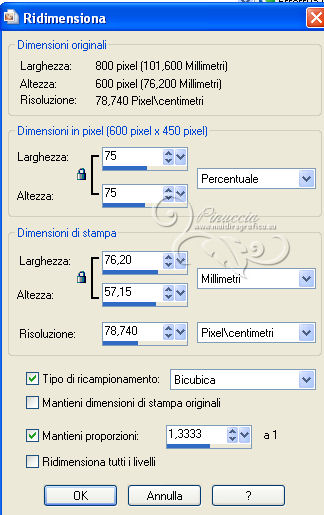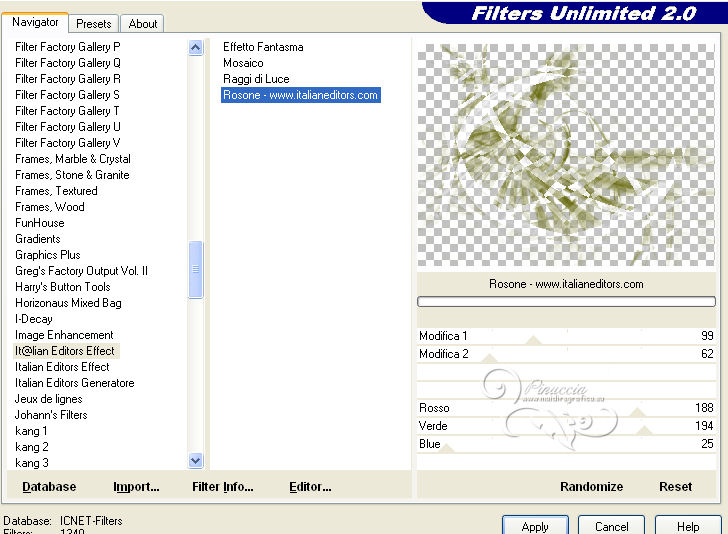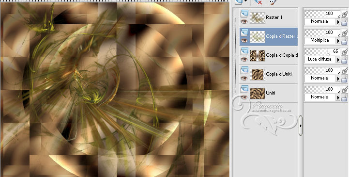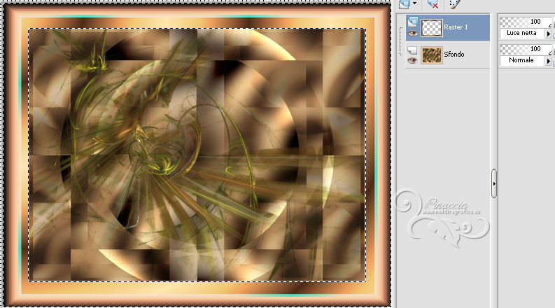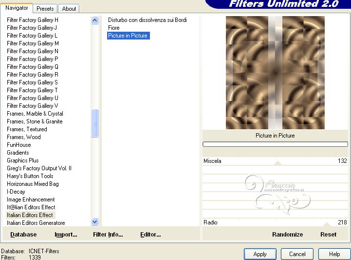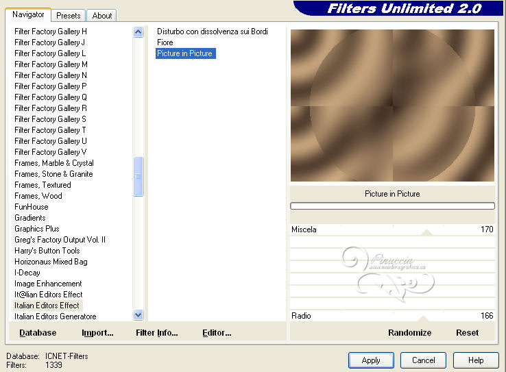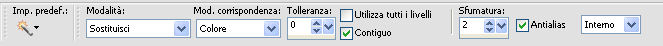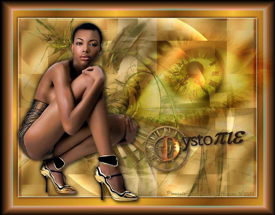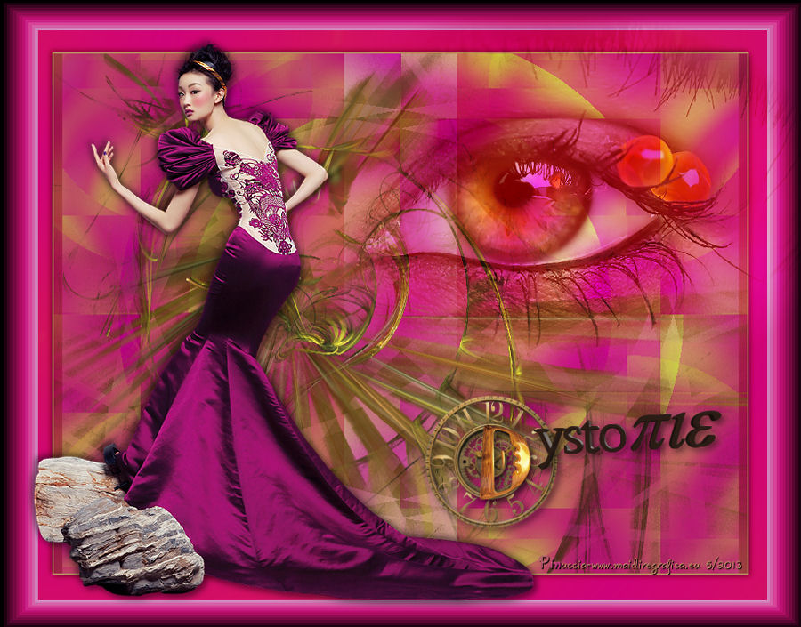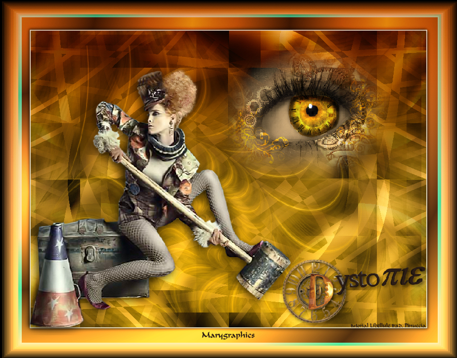 qui puoi trovare qualche risposta ai tuoi dubbi. Se l'argomento che ti interessa non è presente, ti prego di segnalarmelo. Questo tutorial è stato creato con PSP XII, ma può essere eseguito anche con le altre versioni di PSP. Per tradurlo ho usato PSP X. Occorrente. Materiale qui Il tube della donna è di CibiBijoux. Il mist dell'occhio è di MDS. Il resto del materiale è di Libellule. Filtri: se hai problemi con il filtri consulta la mia sezione filtri qui Filters Unlimited 2.0 qui Italian Editors Effects qui I filtri Italian Editors si possono usare da soli o importati in Filters Unlimited (come fare vedi qui) Se un filtro fornito appare con questa icona ![]() Metti il preset Preset DropShadow libellule2 nella cartella Impostazioni predefinite. 1. Imposta il colore di primo piano con #dab483, e il colore di sfondo con #2b1c15. ![]() Passa il colore di primo piano a Gradiente, stile Sprazzo di luce. ![]() Apri una nuova immagine trasparente 800 x 600 pixels, e riempila con il gradiente.2. Regola>Sfocatura>Sfocatura gaussiana - raggio 50. ![]() 3. Effetti>Plugins>Filters Unlimited 2.0 - Picture in picture. ho importato il filtro in Unlimited per comodità ![]() 4. Livelli>Duplica. Immagine>Ridimensiona, al 75%, tutti i livelli non selezionato. ![]() Immagine>Ruota per gradi - 90 gradi a sinistra. ![]() Livelli>Unisci>Unisci visibile. 5. Livelli>Duplica. Immagine>Ruota per gradi - 90 gradi a sinistra. ![]() 6. Ancora Livelli>Duplica. Effetti>Plugins>Filters Unlimited 2.0 - Italian Editors Effect - Picture in picture. ![]() Immagine>Ridimensiona, al 130%, tutti i livelli non selezionato. Cambia la modalità di miscelatura di questo livello in Luce diffusa, e abbassa l'opacità al 65%. ![]() 7. Livelli>Nuovo livello raster. Selezione>Seleziona tutto. Apri il frattale Apos-111119-102-s121-7-ak.pspimages e vai a Modifica>Copia. Torna al tuo lavoro e vai a Modifica>Incolla nella selezione. Selezione>Deseleziona. 8. Livelli>Duplica. Livelli>Disponi>Sposta giù. Effetti>Plugins>Filters Unlimited 2.0 - Italian Editors Effect - Rosone. ![]() 9. Cambia la modalità di miscelatura di questo livello in Moltiplica. ![]() 10. Immagine>Aggiungi bordatura, 2 pixels, simmetriche, con il colore #f6ebde. Immagine>Aggiungi bordatura, 60 pixels, simmetriche, con il colore #dab483. 11. Attiva lo strumento Bacchetta magica ![]() con i seguenti settaggi. ![]() Clicca nel bordo da 60 pixels per selezionarlo. 12. Livelli>Nuovo livello raster. Riempi la selezione con il gradiente iniziale.![]() 13. Effetti>Plugins>Filters Unlimited 2.0 - Italian Editors Effect - Cornice. ![]() 14. Cambia la modalità di miscelatura di questo livello in Luce netta, o secondo i tuoi colori. ![]() Selezione>Inverti. Effetti>Effetti 3D>Sfalsa ombra. ![]() Ripeti l'Effeto Sfalsa ombra, cambiando verticale e orizzontale con -2. Selezione>Deseleziona. 15. Apri il tube Fant_1704_CibiBijoux.pspimages e vai a Modifica>Copia. Torna al tuo lavoro e vai a Modifica>Incolla come nuovo livello. Immagine>Ridimensiona, all'80%, tutti i livelli non selezionato. Spostalo a sinistra.Effetti>Effetti 3D>Sfalsa ombra. Seleziona il preset libellule2 e ok (puoi anche impostare manualmente i settaggi che vedi nella schermata). ![]() 16. Apri il mist mds4081 Eye-vergoldet- baerbel.psp e vai a Modifica>Copia. Torna al tuo lavoro e vai a Modifica>Incolla come nuovo livello. Immagine>Rifletti. Spostalo a destra.Livelli>Disponi>Sposta giù. Cambia la modalità di miscelatura di questo livello in Sovrapponi. 17. Attiva nuovamente il livello superiore. Apri il wordart libellulegraphisme_dystopie.png e vai a Modifica>Copia. Torna al tuo lavoro e vai a Modifica>Incolla come nuovo livello. Spostalo a destra, o dove preferisci.18. Aggiungi il tuo nome e/o il tuo watermark su un nuovo livello. Livelli>Unisci>Unisci tutto e salva in formato jpg. Per questi esempi ho usato tubes di Tocha ![]() Thafs ![]() ![]() Le vostre versioni. Grazie ![]() Marygraphics ![]() Aura ![]() Se hai problemi o dubbi, o trovi un link non funzionante, o anche soltanto per un saluto, scrivimi. 7 Maggio 2013 |