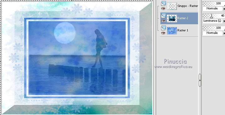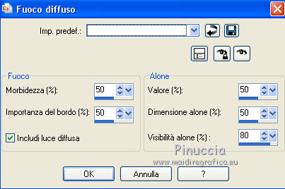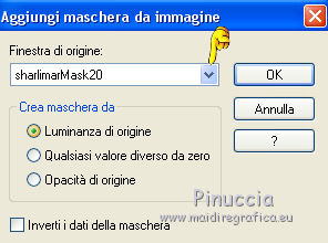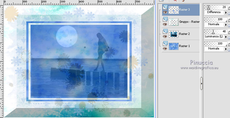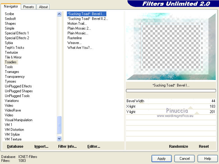 qui puoi trovare qualche risposta ai tuoi dubbi. Se l'argomento che ti interessa non è presente, ti prego di segnalarmelo. Questo tutorial è stato creato da Libellule con X12, ma può essere eseguito con tutte le versioni di PSP Dalla versione X4, il comando Immagine>Rifletti è stato sostituito con Immagine>Capovolgi in orizzontale, e il comando Immagine>Capovolgi con Immagine>Capovolgi in verticale. Nelle versioni X5 e X6, le funzioni sono state migliorate rendendo disponibile il menu Oggetti. Con la nuova versione X7, sono tornati i comandi Rifletti e Capovolgi, ma con nuove differenze. Vedi la scheda sull'argomento qui Per tradurre questo tutorial ho usato PSP X. Occorrente. Materiale qui E' vietato utilizzare il materiale per i vostri tutorial, o distribuirli in gruppi e/o forum. Filtri in caso di dubbi, ricorda di consultare la mia sezione filtri qui Filters Unlimited 2.0 qui Graphics Plus - Cross Shadow qui Toadies - Sucking Toad Bevel I qui I filtri Graphics Plus et Toadies si possono usare da soli o importati in Filters Unlimited (come fare vedi qui) Se un filtro fornito appare con questa icona ![]() Apri la maschera in PSP e minimizzala con il resto del materiale. 1. Imposta il colore di primo piano con il colore #acebf4, e il colore di sfondo con #377cf3. ![]() se vuoi cambiare i colori, scegli due colori abbinati al tuo tube 2. Apri una nuova immagine trasparente 800 x 600 pixels. Selezione>Seleziona tutto. Apri la trama libellule_texture_fleur_bleue.jpg, e vai a Modifica>Copia. Torna al tuo lavoro e vai a Modifica>Incolla nella selezione. Selezione>Deseleziona. 3. Regola>Morbidezza>Fuoco diffuso ![]() 4. Livelli>Nuovo livello raster. Selezione>Seleziona tutto. Apri la trama sekadadesigns_springcomes_paper(14).jpg, e vai a Modifica>Copia. Torna al tuo lavoro e vai a Modifica>Incolla nella selezione. Selezione>Deseleziona. 5. Livelli>Nuovo livello maschera>Da immagine. Apri il menu sotto la finestra di origine e vedrai la lista dei files aperti. Seleziona la maschera sharlimarMask20.jpg. ![]() Livelli>Unisci>Unisci gruppo. 6. Effetti>Plugins>Filters Unlimited 2.0 - Toadies - Sucking Toad, Bevel I, con i settaggi standard. ![]() 7. Regola>Messa a fuoco>Metti a fuoco. 8. Attiva il livello di sfondo (Raster 1). Apri il tube di Lila 5116_lila.pspimage, e vai a Modifica>Copia. Torna al tuo lavoro e vai a Modifica>Incolla come nuovo livello. 9. Immagine>Rifletti. Immagine>Ridimensiona, al 75%, tutti i livelli non selezionato. Cambia la modalità di miscelatura di questo livello in Luminanza (esistente) e abbassa l'opacità di questo livello al 40%. ![]() 10. Attiva il livello superiore. Livelli>Nuovo livello raster. Selezione>Seleziona tutto. Apri il tube TURKIS by_Mago74 elem (8).png, e vai a Modifica>Copia. Torna al tuo lavoro e vai a Modifica>Incolla nella selezione. Selezione>Deseleziona. 11. Immagine>Rifletti. Cambia la modalità di miscelatura di questo livello in Differenza, e abbassa l'opacità al 20%. ![]() 12. Effetti>Effetti di trama>Intessitura, colore nero. ![]() 13. Regola>Messa a fuoco>Metti a fuoco. Regola>Messa a fuoco>Accentua messa a fuoco. 14. Immagine>Aggiungi bordatura, 2 pixels, simmetriche, con il colore di sfondo. Immagine>Aggiungi bordatura, 2 pixels, simmetriche, colore di primo piano. Immagine>Aggiungi bordatura, 25 pixels, simmetriche, colore bianco. 15. Apri il tube di Linda LF-Woman-17102013.pspimage, e vai a Modifica>Copia. Torna al tuo lavoro e vai a Modifica>Incolla come nuovo livello. Immagine>Ridimensiona, al 110%, dimensione ottimale, tutti i livelli non selezionato. ![]() Regola>Messa a fuoco>Metti a fuoco. 16. Effetti>Effetti di immagine>Scostamento. ![]() Non ho messo ombra sul mio tube perchè dava un risultato poco piacevole. Se vuoi, puoi aggiungere un'ombra con settaggi a tua scelta. 17. Selezione>Seleziona tutto. Immagine>Aggiungi bordatura, 25 pixels, simmetriche, con il colore di sfondo. Selezione>Inverti. 18. Effetti>Plugins>Graphics Plus - Cross Shadow, con i settaggi standard. ![]() 19. Di nuovo Selezione>Inverti. Effetti>Effetti 3D>Sfalsa ombra. ![]() Ripeti l'Effetto Sfalsa ombra, cambiando verticale e orizzontale con -2. Selezione>Deseleziona. 20. Immagine>Aggiungi bordatura, 1 pixel, simmetriche, colore nero. 21. Apri il wordart, e vai a Modifica>Copia. Torna al tuo lavoro e vai a Modifica>Incolla come nuovo livello. Spostalo in basso a destra.22. Effetti>Effetti 3D>Sfalsa ombra, con il colore chiaro di primo piano. ![]() 23. Firma il tuo lavoro. Livelli>Unisci>Unisci tutto e salva in formato jpg. Per questo esempio ho usato un tube di Maryse. ![]() ![]() Le vostre versioni. Grazie ![]() Rom ![]() Celia ![]() Puoi scrivermi per qualsiasi problema, o dubbio se trovi un link che non funziona, o anche soltanto per un saluto 15 Ottobre 2015 |