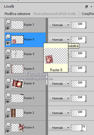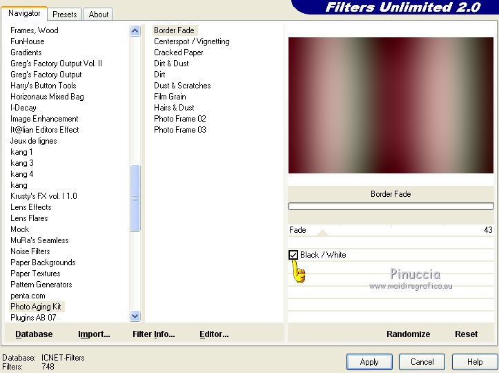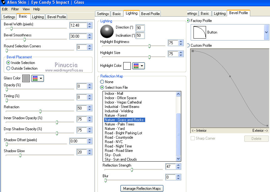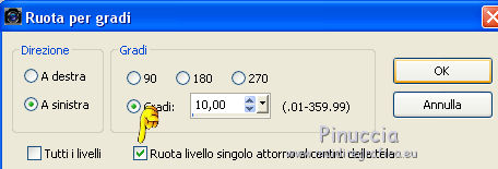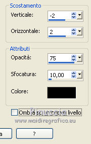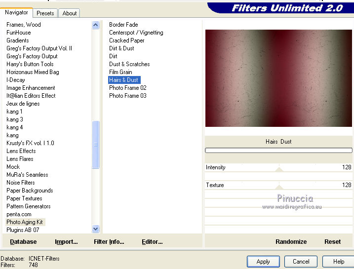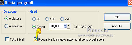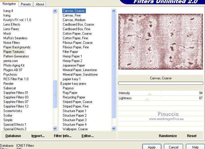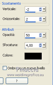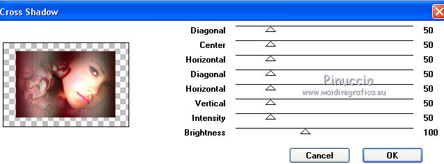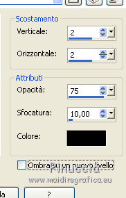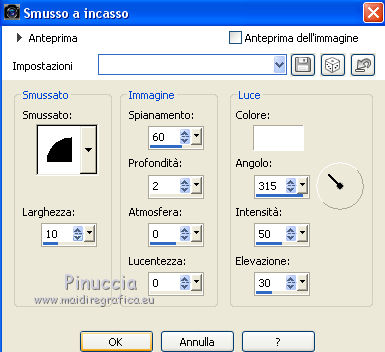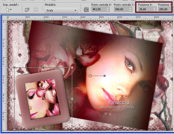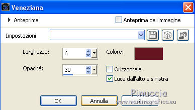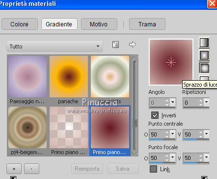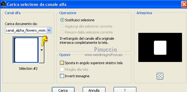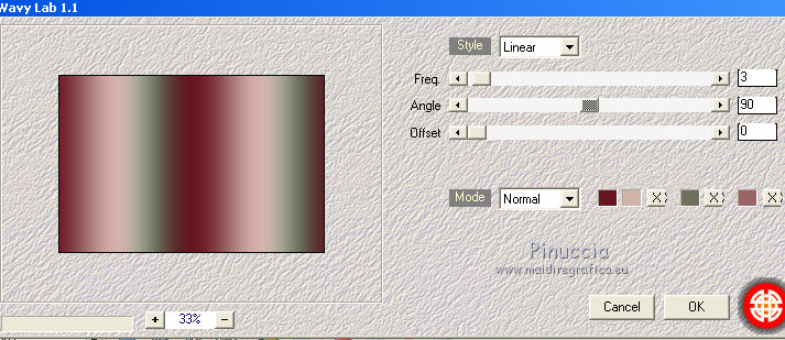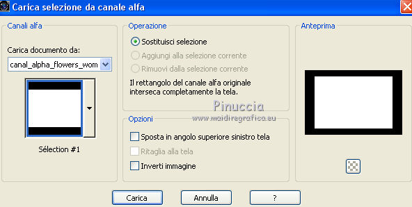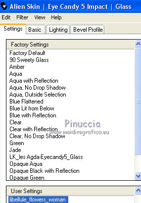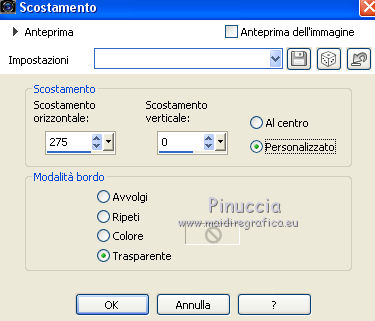 qui puoi trovare qualche risposta ai tuoi dubbi. Se l'argomento che ti interessa non è presente, ti prego di segnalarmelo. Questo tutorial è stato creato da Libellule con X19 e tradotto con CorelX e CorelX17, ma può essere eseguito con tutte le versioni di PSP Dalla versione X4, il comando Immagine>Rifletti è stato sostituito con Immagine>Capovolgi in orizzontale, e il comando Immagine>Capovolgi con Immagine>Capovolgi in verticale. Nelle versioni X5 e X6, le funzioni sono state migliorate rendendo disponibile il menu Oggetti. Con la nuova versione X7, sono tornati i comandi Rifletti e Capovolgi, ma con nuove differenze. Vedi la scheda sull'argomento qui Occorrente. Materiale qui (in questa pagina trovi i links ai loro siti). Filtri in caso di dubbi, ricorda di consultare la mia sezione filtri qui Filters Unlimited 2.0 qui Photo Aging Kit (da importare in Unlimited) qui Mehdi - Wavy Lab 1.1 qui Alien Skin Eye Candy 5 Impact - Glass qui Graphics Plus - Cross shadow qui I filtri Graphics Plus si possono usare da soli o importati in Filters Unlimited (come fare vedi qui) Se un filtro fornito appare con questa icona ![]() non esitare a cambiare modalità di miscelatura e opacità secondo i colori utilizzati. Nelle ultime versioni di PSP non c'è il gradiente di primo piano/sfondo (Corel_06_029) Puoi usare i gradienti delle versioni precedenti. Trovi qui i gradienti Corel X. 1. Imposta il colore di primo piano con il colore 1 #949a20 e il colore di sfondo con il colore 2 #156c35. ![]() 2. Apri canal_alpha_flowers_woman.pspimage. Finestra>Duplica, o sulla tastiera maiuscola+D, per fare una copia. Chiudi l'originale. La copia, che sarà la base del tuo lavoro, non è vuota, ma contiene le selezioni salvate sul canale alfa. 3. Selezione>Seleziona tutto. Apri l'immagine di sfondo flower_woman_fond.jpg e vai a Modifica>Copia. Torna al tuo lavoro e vai a Modifica>Incolla nella selezione. Selezione>Deseleziona. 4. Effetti>Plugins>Filters Unlimited 2.0 - Paper Textures - Canvas Coarse, con i settaggi standard. ![]() 5. Regola>Messa a fuoco>Metti a fuoco. 6. Apri la carta flower_woman_papier1_libellule.png e vai a Modifica>Copia. Torna al tuo lavoro e vai a Modifica>Incolla come nuovo livello. 7. Oggetti>Allinea>Sinistra. Se stai usando una versione che non rende disponibile il menu Oggetti, usa lo strumento Spostamento ![]() e sposta la carta a sinistra. ![]() 8. Effetti>Effetti 3D>Sfalsa ombra, colore nero. ![]() 9. Apri la carta flower_woman_papier2_libellule.png e vai a Modifica>Copia. Torna al tuo lavoro e vai a Modifica>Incolla come nuovo livello. 10. Oggetti>Allinea>Superiore. Oggetti>Allinea>Destra. Se stai usando una versione che non rende disponibile il menu Oggetti, usa lo strumento Spostamento ![]() e sposta la carta in alto a destra. ![]() 11. Livelli>Nuovo livello raster. Selezione>Carica/Salva selezione>Carica selezione da canale alfa. La selezione sélection#1 è subito disponibile. Devi soltanto cliccare Carica. ![]() 12. Effetti>Plugins>Mehdi - Wavy Lab 1.1. Questo filtro lavora con i colori della paletta: il primo è il colore di sfondo, il secondo quello di primo piano Degli ultimi due colori creati dal filtro mantieni il quarto colore e cambia il terzo colore con #6f705e. ![]() 13. Mantieni selezionato. Regola>Sfocatura>Sfocatura gaussiana - raggio 30. ![]() 14. Effetti>Plugins>Filters Unlimited 2.0 - Photo Aging Kit - Border Fade. ![]() 15. Effetti>Plugins>Filters Unlimited 2.0 - Photo Aging Kit - Hairs & Dust, con i settaggi standard. ![]() 16. Effetti>Effetti di trama>Veneziana, colore di sfondo. ![]() 17. Livelli>Nuovo livello raster. Apri il tube libellulegraphisme_flower_woman.png se cambi tube, prendi un misted che sia più grande in orizzontale che in verticale Modifica>Copia. Torna al tuo lavoro e vai a Modifica>Incolla nella selezione. Selezione>Deseleziona. 18. Cambia la modalità di miscelatura di questo livello in Luce netta, o secondo i tuoi colori). 19. Livelli>Unisci>Unisci giù. 20. Effetti>Plugins>Graphics Plus - Cross Shadow. ![]() 21. Immagine>Ruota per gradi - 10 gradi a destra ![]() 22. Effetti>Effetti 3D>Sfalsa ombra, con i settaggi precedenti. ![]() 23. Apri la carta flower_woman_texture3_libellule.png e vai a Modifica>Copia. Torna al tuo lavoro e vai a Modifica>Incolla come nuovo livello. 24. Oggetti>Allinea>Sinistra. Se stai usando una versione che non rende disponibile il menu Oggetti, usa lo strumento Spostamento ![]() 25. Livelli>Duplica. Immagine>Rifletti. Immagine>Capovolgi. 26. Effetti>Effetti di immagine>Scostamento. ![]() 27. Livelli>Unisci>Unisci giù. 28. Effetti>Effetti 3D>Sfalsa ombra, colore nero. ![]() Ripeti l'Effetto Sfalsa ombra, ma verticale e orizzontale -2. 29. Attiva il livello di sfondo. Apri il tube di Guismo calguisfleurpapierArt05082014.pspimage e vai a Modifica>Copia. Torna al tuo lavoro e vai a Modifica>Incolla come nuovo livello. Immagine>Rifletti. Immagine>Ridimensiona, all'80%, dimensione ottimale, tutti i livelli non selezionato. 30. Effetti>Effetti di immagine>Scostamento. ![]() 31. Abbassa l'opacità di questo livello al 70%. Regola>Messa a fuoco>Metti a fuoco. 32. Passa il colore di primo piano a Gradiente di primo piano/sfondo, stile Sprazzo di luce. ![]() 33. Attiva il livello superiore. Livelli>Nuovo livello raster. 34. Selezione>Carica/Salva selezione>Carica selezione da canale alfa. Apri il menu delle selezioni e carica sélection#2. ![]() Riempi la selezione con il gradiente.35. Effetti>Effetti di trama>Veneziana, con i settaggi precedenti. ![]() 36. Effetti>Effetti di bordo>Aumenta. 37. Effetti>Effetti 3D>Smusso a incasso. ![]() 38. Selezione>Modifica>Contrai - 45 pixels. Premi sulla tastiera il tasto CANC ![]() Mantieni selezionato. 39. Livelli>Nuovo livello raster. Selezione>Modifica>Contrai - 2 pixels. 40. Apri l'immagine flowers_woman_mini.jpg e vai a Modifica>Copia. Minimizza l'immagine, perchè ti servirà ancora. Torna al tuo lavoro e vai a Modifica>Incolla nella selezione. Selezione>Deseleziona. 41. Live