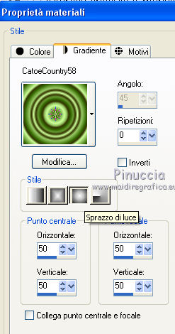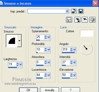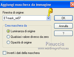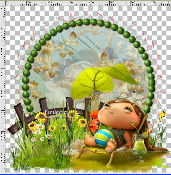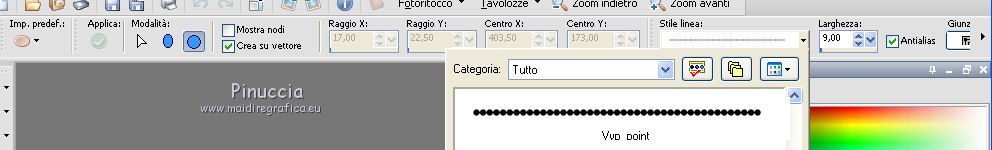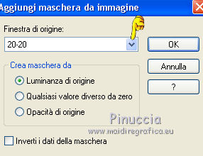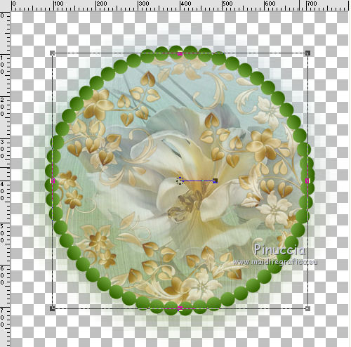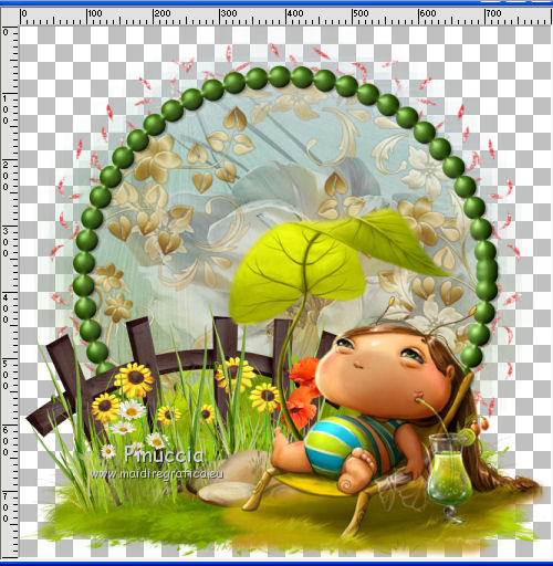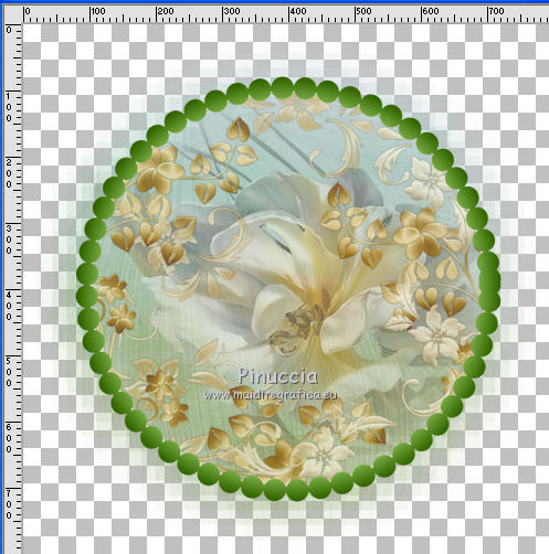 qui puoi trovare qualche risposta ai tuoi dubbi. Se l'argomento che ti interessa non è presente, ti prego di segnalarmelo. Questo tutorial è stato creato da Libellule con X17 e tradotto con CorelX, ma può essere eseguito con tutte le versioni di PSP Dalla versione X4, il comando Immagine>Rifletti è stato sostituito con Immagine>Capovolgi in orizzontale, e il comando Immagine>Capovolgi con Immagine>Capovolgi in verticale. Nelle versioni X5 e X6, le funzioni sono state migliorate rendendo disponibile il menu Oggetti. Con la nuova versione X7, sono tornati i comandi Rifletti e Capovolgi, ma con nuove differenze. Vedi la scheda sull'argomento qui Occorrente. Materiale qui ![]() non esitare a cambiare modalità di miscelatura e opacità secondo i colori utilizzati. Metti la linea di stile vyp_point nella cartella Linee di stile Metti il gradiente nella cartella Gradienti. Apri le maschera in PSP e minimizzale con il resto del materiale. 1. Apri una nuova immagine trasparente 800 x 800 pixels. 2. Selezione>Seleziona tutto. Apri la carta fond.jpg e vai a Modifica>Copia. Torna al tuo lavoro e vai a Modifica>Incolla nella selezione. Selezione>Deseleziona. 3. Livelli>Nuovo livello maschera>Da immagine. Apri il menu sotto la finestra di origine e vedrai la lista dei files aperti. Seleziona la maschera ETmask_re07.jpg ![]() Regola>Messa a fuoco>Metti a fuoco. Livelli>Unisci>Unisci gruppo. 4. Apri il tube libellulegraphisme_Twins_Girls.png. Finestra>Duplica, per fare una copia. Lavora sulla copia. Elimina il watermark. 5. Livelli>Nuovo livello maschera>Da immagine. Apri il menu sotto la finestra di origine e seleziona la maschera 20-20. ![]() Livelli>Unisci>Unisci gruppo. 6. Modifica>Copia. Torna al tuo lavoro e vai a Modifica>Incolla come nuovo livello. 7. Immagine>Ridimensiona, all'80%, dimensione ottimale, tutti i livelli non selezionato. 8. Abbassa l'opacità di questo livello al 60%. 9. Apri il tube garden_décor1_libellule.png e vai a Modifica>Copia. Torna al tuo lavoro e vai a Modifica>Incolla come nuovo livello. Abbassa l'opacità di questo livello al 75%. 10. Passa il colore di primo piano a Gradiente, e seleziona il gradiente CatoeCountry58. ![]() Chiudi il colore di sfondo. 11. Attiva lo strumento Forme predefinite Ellisse ![]() forma cerchio, linea di stile vyp_point, larghezza 9 pixels. ![]() 12. Traccia un cerchio partendo dall'alto a sinistra, fino in basso a destra. Se necessario, ridimensiona il cerchio. Puoi usare Immagine>Ridimensiona, tutti i livelli non selezionato, oppure lo strumento Puntatore ![]() ![]() Oggetti>Allinea>Centra nella tela. 13. Livelli>Converti in livello raster. ![]() con le versioni precedenti a X17, la funzione Oggetti>Allinea>Centra nella tela è disponibile soltanto prima di convertire in livello raster Dalla versione X17 il menu Oggetti è disponibile sempre 15. Effetti>Effetti 3D>Smusso a incasso. ![]() Nel materiale trovi la cornice (garden_decor2_libellule.png), se non vuoi farla da solo. 16. Effetti>Effetti 3D>Sfalsa ombra. ![]() 17. Apri il tube garden_decor3_libellule.png e vai a Modifica>Copia. Torna al tuo lavoro e vai a Modifica>Incolla come nuovo livello. Livelli>Disponi>Porta sotto. 18. Livelli>Unisci>Unisci visibile. 19. Effetti>Effetti di immagine>Scostamento. ![]() 20. Apri il tube ScrapAngeline (5).png e vai a Modifica>Copia. Torna al tuo lavoro e vai a Modifica>Incolla come nuovo livello. 21. Oggetti>Allinea>Inferiore. Se stai usando una versione precedente che non dispone del menu Oggetti, usa lo strumento Spostamento ![]() ![]() 22. Apri il tube barrière.png e vai a Modifica>Copia. Torna al tuo lavoro e vai a Modifica>Incolla come nuovo livello. Immagine>Ridimensiona, al 60%, tutti i livelli non selezionato. 23. Immagine>Rifletti. Sposta il tube in basso a sinistra.24. Apri il tube libellulegraphisme_F_10_Fairy_grill.png e vai a Modifica>Copia. Torna al tuo lavoro e vai a Modifica>Incolla come nuovo livello. Spostalo in basso a destra.![]() 25. Apri il tube herbe.png. e vai a Modifica>Copia. Torna al tuo lavoro e vai a Modifica>Incolla come nuovo livello. Spostalo in basso a sinistra.26. Livelli>Duplica Immagine>Rifletti. Sposta questo tube dietro la fata.27. Livelli>Disponi>Sposta giù - 2 volte. ![]() 28. Attiva il livello superiore. Apri il tube lampes.png e vai a Modifica>Copia. Torna al tuo lavoro e vai a Modifica>Incolla come nuovo livello. Spostalo a sinistra, sulla cornice, sopra lo steccato.![]() 29. Apri il tube garden_decor5_libellule.png e vai a Modifica>Copia. Torna al tuo lavoro e vai a Modifica>Incolla come nuovo livello. Spostalo in alto a sinistra.30. Apri il tube garden_decor4_libellule.png e vai a Modifica>Copia. Torna al tuo lavoro e vai a Modifica>Incolla come nuovo livello. Spostalo a destra della cornice.31. Firma il tuo lavoro. 32. Livelli>Unisci>Unisci visibile e, se vuoi conservare la trasparenza dello sfondo, salva in formato png: File>Esporta>Ottimizzazione PNG. ![]() Se vuoi avere lo sfondo bianco: Livelli>Unisci>Unisci tutto e salva in formato jpg. ![]() Il tube di questo esempio è di Gabry ![]() ![]() Puoi scrivermi per qualsiasi problema, o dubbio se trovi un link che non funziona, o anche soltanto per un saluto. 12 Maggio 2017 |