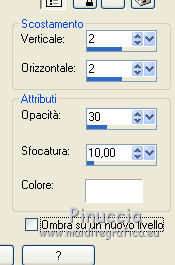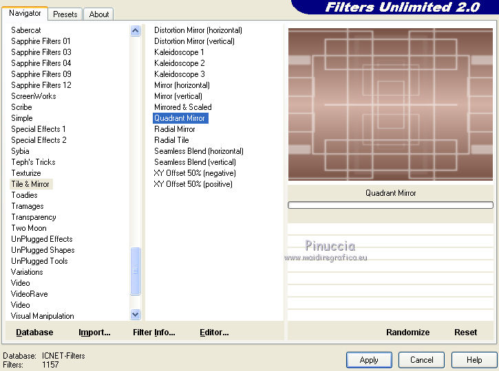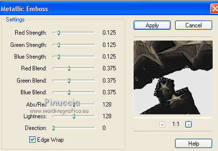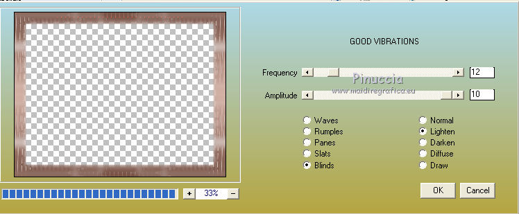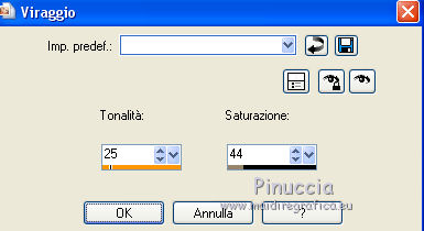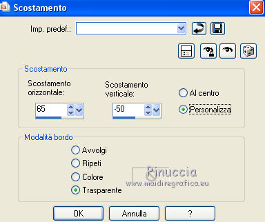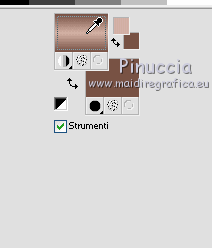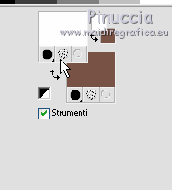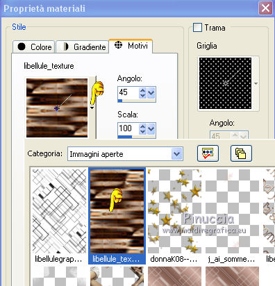 qui puoi trovare qualche risposta ai tuoi dubbi. Se l'argomento che ti interessa non è presente, ti prego di segnalarmelo. Questo tutorial è stato creato da Libellule con X12, ma può essere eseguito con tutte le versioni di PSP Dalla versione X4, il comando Immagine>Rifletti è stato sostituito con Immagine>Capovolgi in orizzontale, e il comando Immagine>Capovolgi con Immagine>Capovolgi in verticale. Nelle versioni X5 e X6, le funzioni sono state migliorate rendendo disponibile il menu Oggetti. Con la nuova versione X7, sono tornati i comandi Rifletti e Capovolgi, ma con nuove differenze. Vedi la scheda sull'argomento qui Per tradurre questo tutorial ho usato PSP X. Occorrente. Materiale qui Il tube delle stelle è di Donna Il resto del materiale è di Libellule. E' proibito utilizzare il materiale per i vostri tutorial o distribuirlo in gruppi e/o forum. Filtri in caso di dubbi, ricorda di consultare la mia sezione filtri qui Filters Unlimited 2.0 qui FM Tile Tools - Metallic Emboss qui AAA Filters - Good Vibrations qui Graphics Plus - Cross Shadow qui Mura's Meister - Copies qui I filtri Graphics Plus si possono usare da soli o importati in Filters Unlimited (come fare vedi qui) Se un filtro fornito appare con questa icona ![]() Metti la selezione nella cartella Selezioni. Apri la maschera e la trama in PSP, e minimizzali con il resto del materiale. 1. Imposta il colore di primo piano con #d4b2a5, e il colore di sfondo con #785245. ![]() Passa il colore di primo piano a Gradiente di primo piano/sfondo, stile Lineare. ![]() 2. Apri una nuova immagine trasparente 800 x 600 pixels, e riempila con il gradiente.3. Livelli>Nuovo livello raster. Imposta il colore di primo piano con il colore bianco, clicca con il tasto destro del mouse sulla paletta del colore e clicca sulla palettina del colore bianco, che è sempre l'ultima della tabella ![]() Riempi il livello con il colore bianco.4. Livelli>Nuovo livello maschera>Da immagine. Apri il menu sotto la finestra di origine e vedrai la lista dei files aperti. Carica la maschera libellulegraphisme_masque, con i seguenti settaggi. ![]() Livelli>Unisci>Unisci gruppo. Cambia la modalità di miscelatura di questo livello in Filtra, e abbassa l'opacità al 50%. ![]() 5. Livelli>Unisci>Unisci visibile. 6. Effetti>Plugins>Filters Unlimited 2.0 - Tile & Mirror - Quadrant Mirror. ![]() 7. Modifica>Copia. Modifica>Incolla come nuova IMMAGINE. Minimizza questa immagine, che ti servirà più tardi. 8. Torna al tuo lavoro. Livelli>Nuovo livello raster. Selezione>Carica/Salva selezione>Carica selezione da disco. Cerca e carica la selezione libellule_sommeil1. ![]() 9. Passa il colore di primo piano a Motivi, cerca nella lista dei motivi - categoria Immagini aperte - la trama libellule_texture, e impostala con i seguenti settaggi. ![]() 10. Riempi la selezione con il motivo.Mantieni selezionato. 11. Effetti>Effetti 3D>Smusso a incasso. ![]() 12. Rimani sul livello superiore. Effetti>Effetti 3D>Sfalsa ombra, colore nero. ![]() Ripeti l'Effetto Sfalsa ombra, cambiando verticale e orizzontale con -1. Selezione>Deseleziona. 13. Livelli>Duplica. Immagine>Ridimensiona, all'80%, tutti i livelli non selezionato. 14. Effetti>Effetti di distorsione>Mulinello. ![]() 15. Apri il tube libellulegraphisme_bebe_a_sommeil.png e vai a Modifica>Copia. Torna al tuo lavoro e vai a Modifica>Incolla come nuovo livello. 16. Effetti>Effetti di immagine>Scostamento. ![]() 17. Livelli>Duplica. Attiva il livello sottostante dell'originale. ![]() 18. Regola>Sfocatura>Sfocatura gaussiana - raggio 15. ![]() 19. Attiva il livello superiore della copia. Effetti>Effetti 3D>Sfalsa ombra, colore bianco. ![]() 20. Attiva il livello Raster 1. Livelli>Disponi>Porta in alto. ![]() 21. Attiva il livello copia di Raster 1. ![]() 22. Apri il tube plume.png e vai a Modifica>Copia. Torna al tuo lavoro e vai a Modifica>Incolla come nuovo livello. Immagine>Ridimensiona, al 40%, tutti i livelli non selezionato. Immagine>Ruota per gradi - 30 gradi a destra. ![]() 23. Effetti>Plugins>Mura's Meister - Copies. ![]() 24. Abbassa l'opacità di questo livello al 55%. ![]() 25. Rimani posizionato sul livello delle piume. Apri il tube donnak08-scattered stars-4002, e vai a Modifica>Copia. Torna al tuo lavoro e vai a Modifica>Incolla come nuovo livello. 26. Regola>Tonalità e saturazione>Viraggio. ![]() 27. Effetti>Plugins>FM Tile Tools - Metallic Emboss - 2 volte con i settaggi standard. ![]() Abbassa l'opacità di questo livello al 65%. 28. Attiva il livello superiore. ![]() Apri il wordart libellule_modart.png, e vai a Modifica>Copia. Torna al tuo lavoro e vai a Modifica>Incolla come nuovo livello. Effetti>Effetti di immagine>Scostamento. ![]() 29. Immagine>Aggiungi bordatura, 3 pixels, simmetriche, con il colore di primo piano iniziale #d4b2a5. Immagine>Aggiungi bordatura, 3 pixels, simmetriche, con il colore di sfondo #785245. Immagine>Aggiungi bordatura, 50 pixels, simmetriche, con il colore bianco. 30. Attiva lo strumento Bacchetta magica ![]() ![]() e clicca nel bordo bianco per selezionarlo. 31. Attiva l'immagine di sfondo che hai minimizzato al punto 7. ![]() Modifica>Copia. Torna al tuo lavoro e vai a Modifica>Incolla nella selezione. Selezione>Innalza selezione a livello. Mantieni selezionato. 32. Regola>Sfocatura>Sfocatura gaussiana - raggio 10. ![]() 33. Effetti>Plugins>AAA Filters - Good Vibration. ![]() Cambia la modalità di miscelatura di questo livello in Luminanza (esistente). 34. Effetti>Plugins>Graphics Plus - Cross Shadow. ![]() Abbassa l'opacità di questo livello al 95%. Selezione>Deseleziona. 35. Immagine>Aggiungi bordatura, 3 pixels, simmetriche, con il colore bianco. Seleziona questo bordo con la bacchetta magica ![]() Riporta il colore di primo piano al motivo: (apri il menu della paletta e seleziona Motivo) ![]() Riempi la selezione con il motivo.Mantieni selezionato. 36. Effetti>Effetti 3D>Smusso a incasso, con i settaggi precedenti. ![]() 37. Effetti>Effetti 3D>Sfalsa ombra, colore n