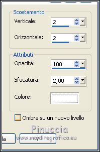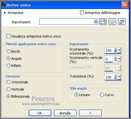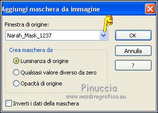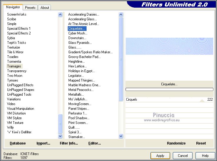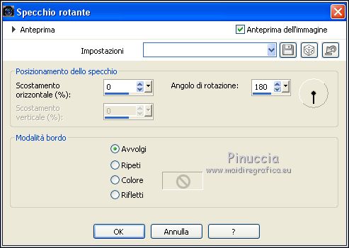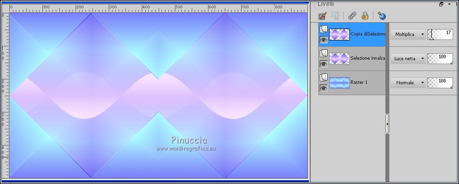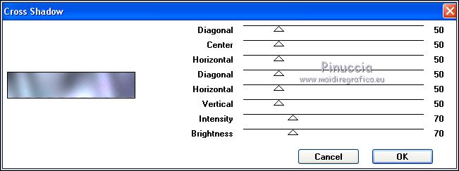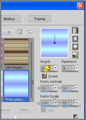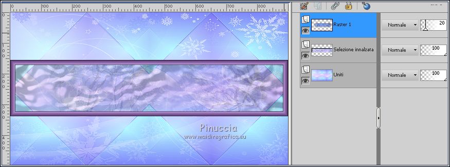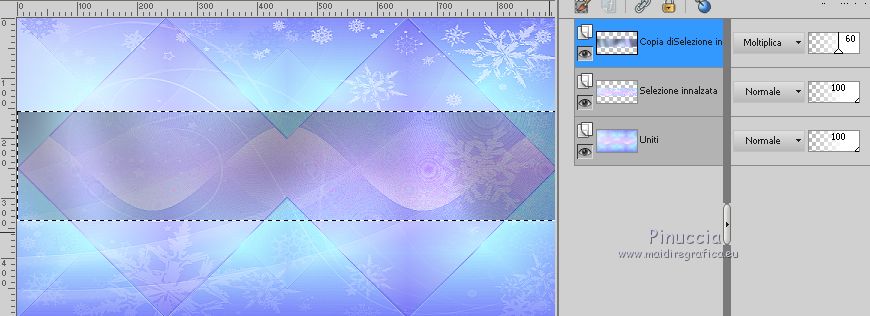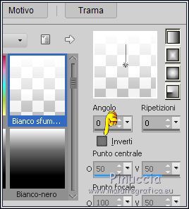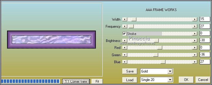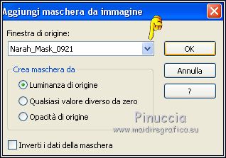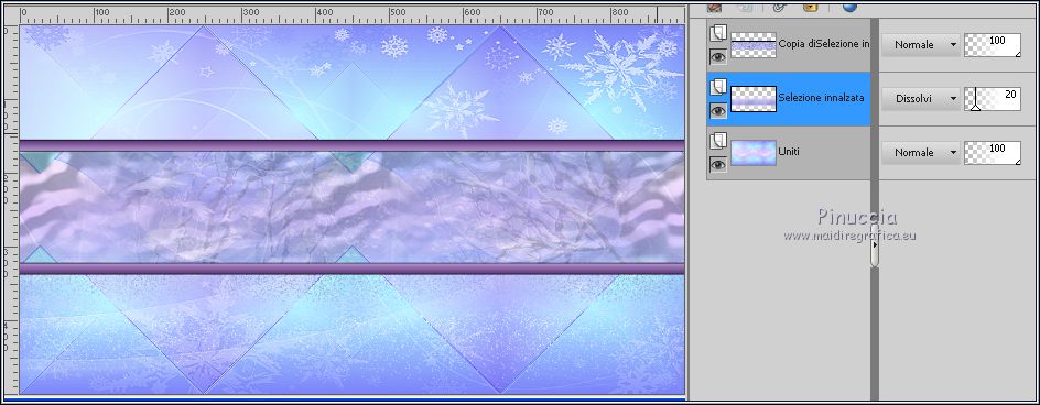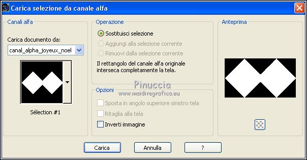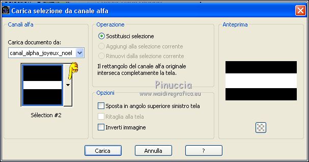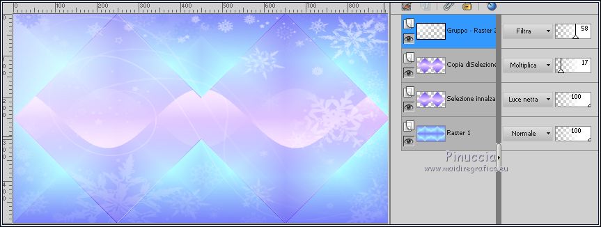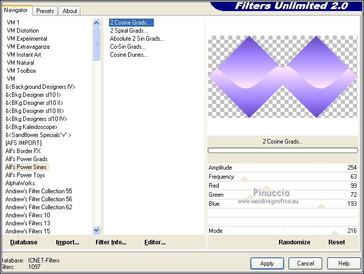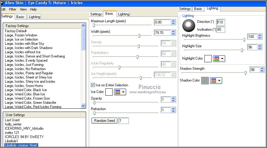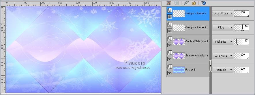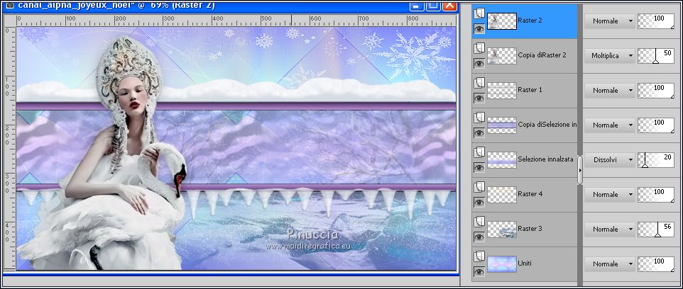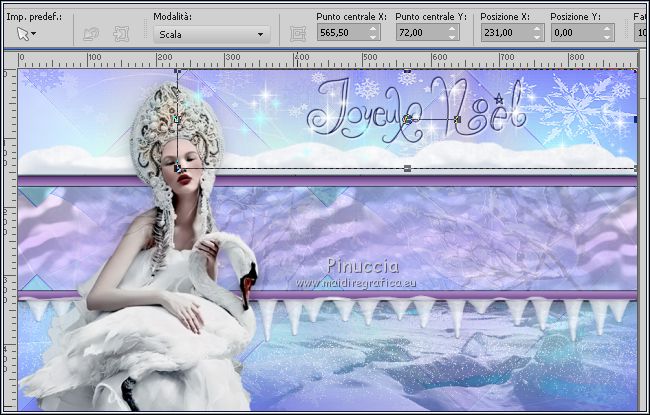 qui puoi trovare qualche risposta ai tuoi dubbi. Se l'argomento che ti interessa non è presente, ti prego di segnalarmelo. Questo tutorial è stato creato da Libellule con X19 e tradotto con Corelx7, ma può essere eseguito con tutte le versioni di PSP Dalla versione X4, il comando Immagine>Rifletti è stato sostituito con Immagine>Capovolgi in orizzontale, e il comando Immagine>Capovolgi con Immagine>Capovolgi in verticale. Nelle versioni X5 e X6, le funzioni sono state migliorate rendendo disponibile il menu Oggetti. Con la nuova versione X7, sono tornati i comandi Rifletti e Capovolgi, ma con nuove differenze. Vedi la scheda sull'argomento qui Le vostre versioni Occorrente. Materiale qui Per i tubes grazie Cibi-Bijoux e Cal (in questa pagina trovi i links ai siti dei creatori di tubes) Filtri in caso di dubbi, ricorda di consultare la mia sezione filtri qui Filters Unlimited 2.0 qui Alf's Power Sines - 2 Cosine Grads qui Tramages - Cirquelate qui Alien Skin Eye Candy 5 Nature - Icicles qui Mehdi - Sorting Tiles qui Simple - 4Way Average qui Graphics Plus - Cross Shadow qui AAA Frames - Frame Works qui I filtri Alf's Power Sines, Tramages, Simple e Graphics Plus si possono usare da soli o importati in Filters Unlimited (come fare vedi qui) Se un filtro fornito appare con questa icona ![]() non esitare a cambiare modalità di miscelatura e opacità secondo i colori utilizzati. Metti il preset Cliccando sul file una o due volte (a seconda delle tue impostazioni), automaticamente il preset si installerà nella cartella corretta. perchè uno o due clic vedi qui Se preferisci, puoi importare direttamente il preset nel corso del tutorial Come fare vedi la scheda del filtro Eye Candy qui Apri le maschere in PSP e minimizzale con il resto del materiale. Colori utilizzati ![]() Imposta il colore di primo piano con il colore 1 #c0ffff e il colore di sfondo con il colore 2 #8196fb. ![]() Passa il colore di primo piano a Gradiente di primo piano/sfondo, stile Lineare. ![]() 1. Apri canal_alpha_joyeuxnoel.pspimage. Finestra>Duplica, o sulla tastiera maiuscola+D, per fare una copia. Chiudi l'originale. La copia, che sarà la base del tuo lavoro non è vuota, ma contiene le selezioni salvate sul canale. Riempi l'immagine trasparente con il gradiente.2. Effetti>Plugins>Mehdi - Sorting Tiles. ![]() 3. Effetti>Effetti di riflesso>Specchio rotante. ![]() 4. Effetti>Effetti di bordo>Aumenta. 5. Livelli>Duplica. Effetti>Effetti di immagine>Motivo unico. ![]() 6. Cambia la modalità di miscelatura di questo livello in Moltiplica, e abbassa l'opacità al 35%. 7. Livelli>Unisci>Unisci giù. 9. Selezione>Carica/Salva selezione>Carica selezione da canale alfa. La selezione 1 è subito disponibile. Devi soltanto cliccare Carica. ![]() Selezione>Innalza selezione a livello. Selezione>Deseleziona. 10. Effetti>Plugins>Filters Unlimited 2.0 - Alf's Power Sines 2 - Cosine Grads ![]() se stai usando altri colori, gioca con i settaggi di Red-Green-Blue) 11. Cambia la modalità di miscelatura di questo livello in Luce netta, opacità 100. 12. Livelli>Duplica. Immagine>Capovolgi. Cambia la modalità di miscelatura di questo livello in Moltiplica, e abbassa l'opacità al 17%. ![]() 13. Livelli>Nuovo livello raster. Cambia il gradiente di primo piano con il gradiente Bianco sfumato, stile Lineare. ![]() Riempi il livello con il gradiente.14. Livelli>Nuovo livello maschera>Da immagine. Apri il menu sotto la finestra di origine e vedrai la lista dei files aperti. Selezione la maschera Narah_Mask_0921. ![]() Livelli>Unisci>Unisci gruppo. 15. Cambia la modalità di miscelatura di questo livello in Filtra, e abbassa l'opacità al 58%. ![]() 16. Imposta il colore di primo piano con il colore bianco. Livelli>Nuovo livello raster. Riempi il livello con il colore bianco.17. Livelli>Nuovo livello maschera>Da immagine. Apri il menu sotto la finestra di origine e selezione la maschera Narah_Mask_1237. ![]() Livelli>Unisci>Unisci gruppo. Cambia la modalità di miscelatura di questo livello in Luce diffusa. ![]() 18. Livelli>Unisci>Unisci visibile. 19. Selezione>Carica/Salva selezione>Carica selezione da canale alfa. Apri il menu delle selezioni e carica la selezione 2. ![]() Selezione>Innalza selezione a livello. Mantieni selezionato. 20. Livelli>Duplica. Effetti>Plugins>Tramages - Cirquelate ![]() Effetti>Effetti di bordo>Aumenta. 21. Effetti>Plugins>Graphics Plus - Cross Shadow. ![]() 22. Cambia la modalità di miscelatura di questo livello in Moltiplica, e abbassa l'opacità al 60%. ![]() Mantieni ancora selezionato. 23. Effetti>Plugins>Alien Skin Eye Candy 5 Nature - Icicles Seleziona il preset Libellule_Joyeux_Noel e ok ![]() 24. Livelli>Unisci>Unisci giù. 25. Effetti>Plugins>AAA Frames - Frames Works ![]() 26. Apri il tube CAL-2273-102817, cancella la firma e vai a Modifica>Copia. Torna al tuo lavoro e vai a Modifica>Incolla come nuovo livello. Oggetti>Allinea>Destra Se stai lavorando con una versione precedente che non dispone del menu Oggetti attiva lo strumento Puntatore ![]() e imposta Posizione X a 0,00 ![]() 27. Selezione>Modifica>Contrai - 15 pixels. Selezione>Inverti. Premi sulla tastiera il tasto CANC ![]() Selezione>Deseleziona. Regola>Messa a fuoco>Metti a fuoco. Abbassa l'opacità di questo livello al 20%. ![]() 28. Attiva il livello sottostante. Effetti>Effetti di immagine>Motivo unico, fianco a fianco. ![]() 29. Attiva il livello superiore. Livelli>Unisci>Unisci giù. 30. Livelli>Duplica. Immagine>Ruota a destra. Attiva il livello sottostante. Effetti>Effetti di distorsione>Vento - da destra, intensità 100. ![]() Modifica>Ripeti Vento. Immagine>Ruota a sinistra. 31. Cambia la modalità di miscelatura di questo livello in Dissolvi, e abbassa l'opacità al 20%. ![]() 32. Attiva il livello superiore. Effetti>Effetti 3D>Sfalsa ombra, colore nero. ![]() 33. Apri il tube joyeux_noel_decor1.pspimage e vai a Modifica>Copia. Torna al tuo lavoro e vai a Modifica>Incolla come nuovo livello. Lascialo come sta. 34. Apri il tu