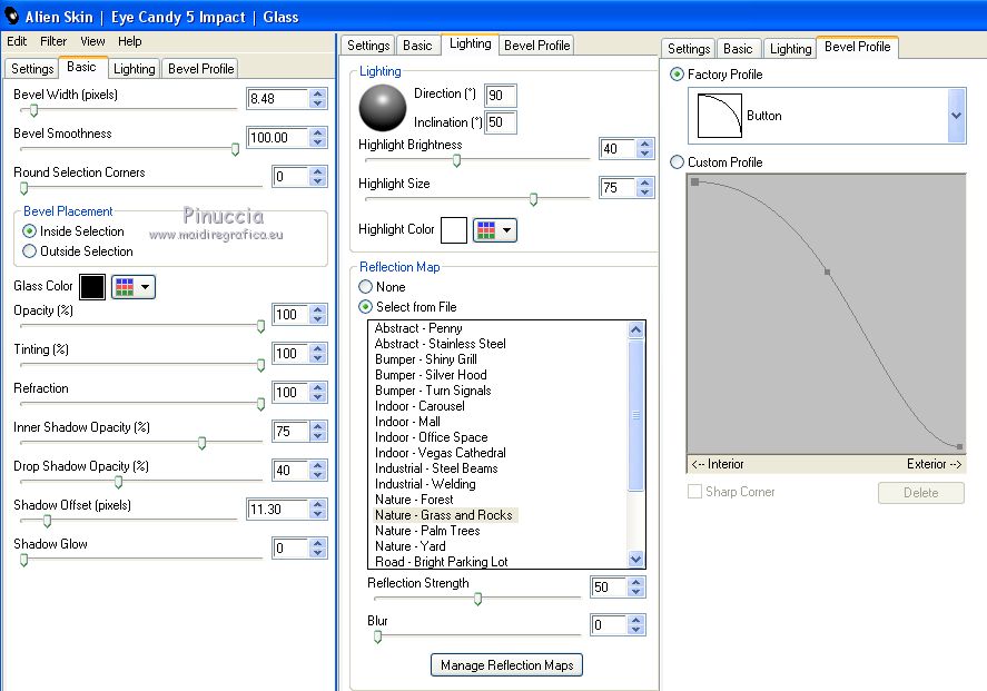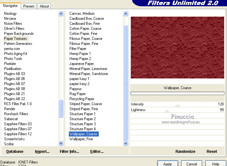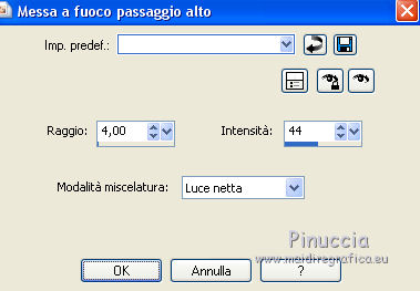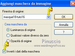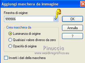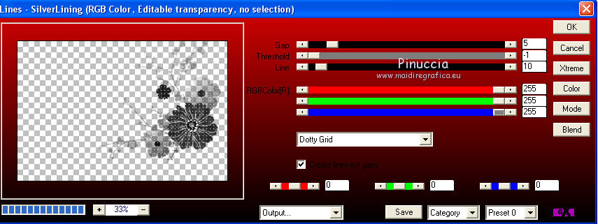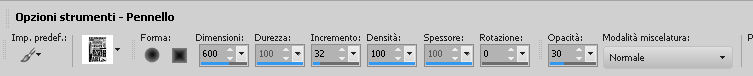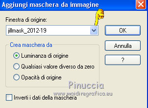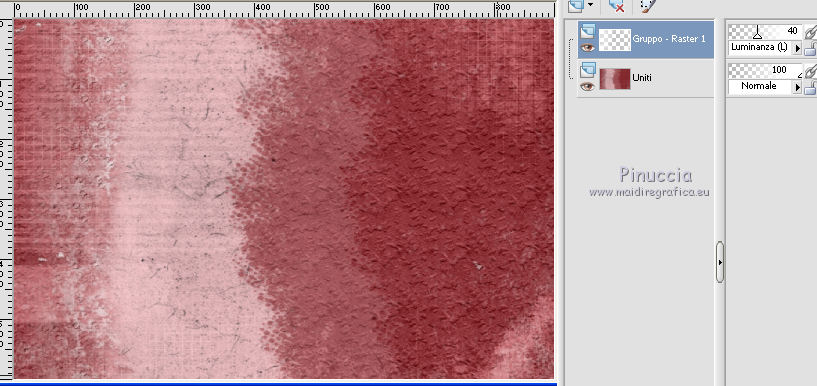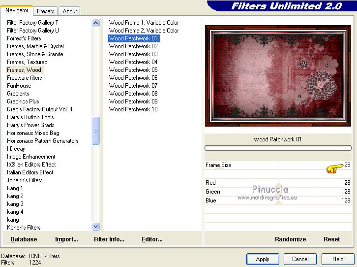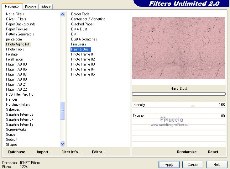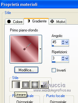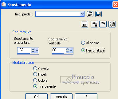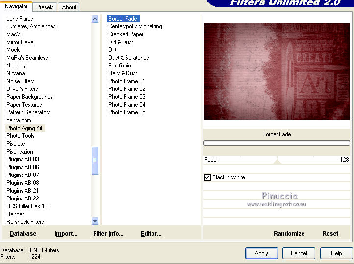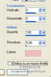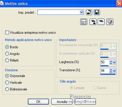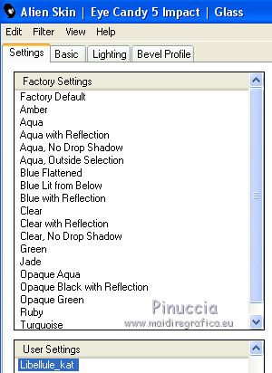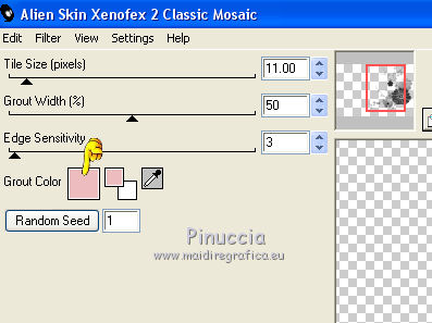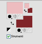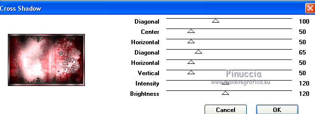 qui puoi trovare qualche risposta ai tuoi dubbi. Se l'argomento che ti interessa non è presente, ti prego di segnalarmelo. Questo tutorial è stato creato da Libellule con X17, ma può essere eseguito con tutte le versioni di PSP Dalla versione X4, il comando Immagine>Rifletti è stato sostituito con Immagine>Capovolgi in orizzontale, e il comando Immagine>Capovolgi con Immagine>Capovolgi in verticale. Nelle versioni X5 e X6, le funzioni sono state migliorate rendendo disponibile il menu Oggetti. Con la nuova versione X7, sono tornati i comandi Rifletti e Capovolgi, ma con nuove differenze. Vedi la scheda sull'argomento qui Per tradurre questo tutorial ho usato PSP X. Occorrente. Materiale qui Filtri in caso di dubbi, ricorda di consultare la mia sezione filtri qui Filters Unlimited 2.0 qui Photo Aging Kit (da importare in Unlmited) qui Alien Skin Xenofex 2 qui Ap 01 [Innovations] - Lines SilverLining qui Graphics Plus - Cross Shadow qui Alien Skin Eye Candy 5 Impact - Glass qui I filtri Graphics Plus si possono usare da soli o importati in Filters Unlimited (come fare vedi qui) Se un filtro fornito appare con questa icona ![]() non esitare a cambiare modalità di miscelatura e opacità secondo i colori utilizzati. Metti il preset Cliccando sul file una o due volte (a seconda delle tue impostazioni), automaticamente il preset si installerà nella cartella corretta. perchè uno o due clic vedi qui Metti il pennello nella cartella Pennelli. Attenzione il pennello si compone di due files che non devono essere separati. Vedi gli appunti sui pennelli qui Metti la trama nella cartella Trame. Apri le maschere in PSP e minimizzale con il resto del materiale. Paletta dei colori utilizzati ![]() Se cambi colori, conserva il bianco e il nero e scegli dal tuo tube il colore più chiaro e il colore più scuro. 1. Imposta il colore di primo piano con #ecbcbf, e il colore di sfondo con #81252a. ![]() 2. Apri una nuova immagine trasparente 900 x 600 pixels, e riempila con il colore di sfondo.3. Effetti>Plugins>Filters Unlimited 2.0 - Paper Textures - Wallpaper,Coarse, con i settaggi standard. ![]() 4. Livelli>Nuovo livello raster. Imposta il colore di sfondo con il colore bianco. ![]() Riempi il livello con il colore bianco.5. Livelli>Nuovo livello maschera>Da immagine Apri il menu sotto la finestra di origine e vedrai la lista dei files aperti. Seleziona la maschera 999906.jpg. ![]() Livelli>Unisci>Unisci gruppo. 6. Effetti>Effetti di trama>Trama - seleziona la trama 7drsm6ti, con i seguenti settaggi ![]() 7. Effetti>Effetti di bordo>Aumenta. 8. Livelli>Nuovo livello raster. Riempi con il colore 1 (primo piano) .9. Effetti>Plugins>Filters Unlimited 2.0 - Photo Aging Kit - Hairs & Dust. ![]() 10. Livelli>Nuovo livello maschera>Da immagine Apri il menu sotto la finestra di origine e seleziona la maschera jillmask_2012_10.jpg ![]() Livelli>Unisci>Unisci gruppo. 11. Livelli>Unisci>Unisci visibile. 12. Effetti>Effetti di immagine>Motivo unico. ![]() Dovresti avere questo. ![]() 13. Livelli>Nuovo livello raster. Riempi con il colore bianco di sfondo.14. Livelli>Nuovo livello maschera>Da immagine Apri il menu sotto la finestra di origine e seleziona la maschera masque18-tuto16.jpg. ![]() Livelli>Unisci>Unisci gruppo. 15. Cambia la modalità di miscelatura di questo livello in Luminanza (esistente) e abbassa l'opacità al 40%. ![]() 16. Livelli>Nuovo livello raster. Attiva lo strumento Pennello ![]() Cerca e seleziona il pennello pinceau-libellule-Kat, dimensione 600, opacità 30 ![]() Applica il pennello a destra, cliccando con il tasto destro del mouse per usare il colore bianco di sfondo. ![]() se il tuo PSP non supporta pennelli superiori a 500 pixels, applica il pennello alla massima dimensione e poi attiva lo strumento Puntatore ![]() se stai usando PSP 9 lo strumento Deformazione ![]() in modalità Scala usa i nodi centrali![]() per ottenere le dimensioni del pennello originale. ![]() 17. Livelli>Unisci>Unisci visibile. 18. Effetti>Plugins>Filters Unlimited 2.0 - Photo Aging Kit - Border Fade, con i settaggi standard. e Black/white selezionato. ![]() 19. Apri il tube kat_deco1.png e vai a Modifica>Copia. Torna al tuo lavoro e vai a Modifica>Incolla come nuovo livello. 20. Effetti>Effetti di immagine>Scostamento. ![]() 21. Effetti>Plugins>AP 01 [Innovations] - Lines SilverLining. ![]() 22. Effetti>Plugins>Alien Skin Xenofex 2 - Classic Mosaic Grout Color: colore di primo piano. ![]() 23. Effetti>Effetti 3D>Sfalsa ombra, colore 1 (primo piano) .![]() Regola>Messa a fuoco>Metti a fuoco. 24. Apri il tube kat_deco2.png e vai a Modifica>Copia. Torna al tuo lavoro e vai a Modifica>Incolla come nuovo livello. 25. Effetti>Effetti di immagine>Scostamento. ![]() 26. Effetti>Plugins>Alien Skin Eye Candy 5 Impact - Glass. Seleziona il preset Libellule_kat e ok. ![]() Questi i settaggi in caso di problemi con il preset. ![]() 27. Livelli>Duplica. Immagine>Capovolgi. 28. Immagine>Aggiungi bordatura, simmetriche non selezionato, colore nero. ![]() 29. Immagine>Aggiungi bordatura, 2 pixels, simmetriche, colore bianco. 30. Imposta nuovamente il colore di sfondo con il colore 2 .![]() 31. Passa il colore di primo piano a Gradiente di primo piano/sfondo, stile Lineare. ![]() 32. Selezione>Seleziona tutto. Immagine>Aggiungi bordatura, 10 pixels, simmetriche, un altro colore (non ha importanza quale). Selezione>Inverti. 33. Riempi la selezione con il gradiente.34. Effetti>Plugins>Graphics Plus - Cross shadow. ![]() Selezione>Deseleziona. 35. Immagine>Aggiungi bordatura, 2 pixels, simmetriche, colore bianco. Immagine>Aggiungi bordatura, 5 pixels, simmetriche, colore nero. Immagine>Aggiungi bordatura, 15 pixels, simmetriche, colore bianco. 36. Di nuovo Selezione>Seleziona tutto. Immagine>Aggiungi bordatura, 25 pixels, simmetriche, colore scuro di sfondo .37. Selezione>Inverti. Effetti>Plugins>Filters Unlimited 2.0 - Frames Wood - Wood Patchwork 01. ![]() se stai usando altri colori, non ti consiglio usare i cursori dei colori