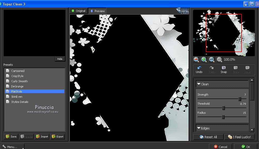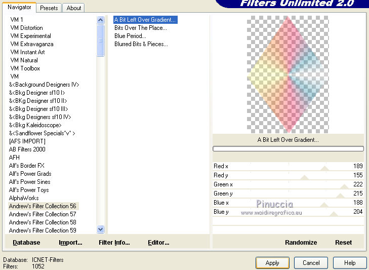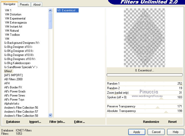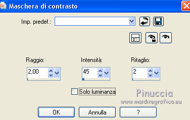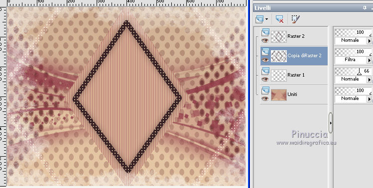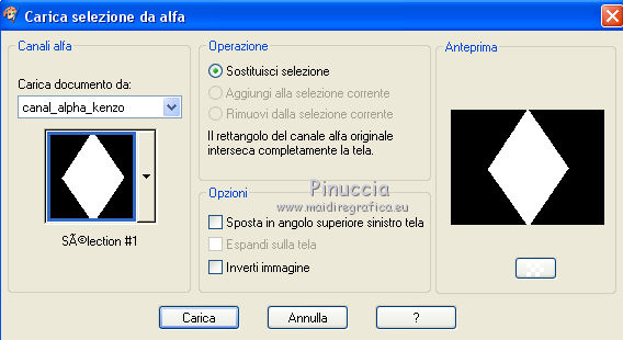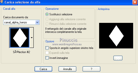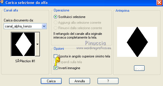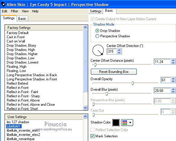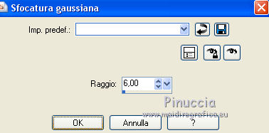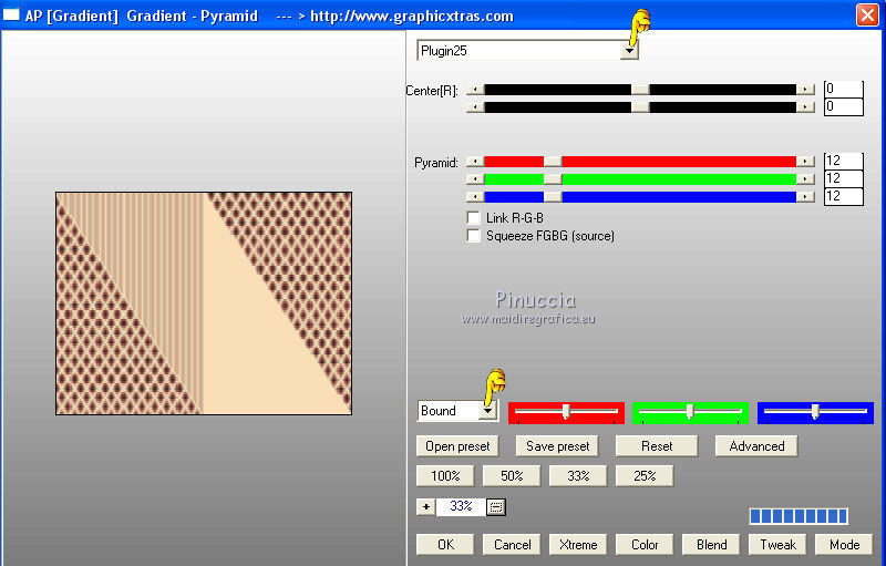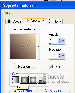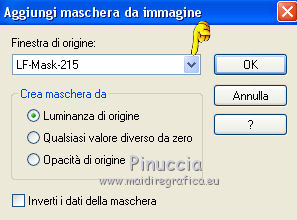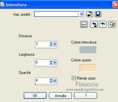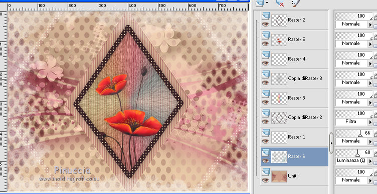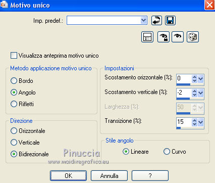 qui puoi trovare qualche risposta ai tuoi dubbi. Se l'argomento che ti interessa non è presente, ti prego di segnalarmelo. Questo tutorial è stato creato da Libellule con X17, ma può essere eseguito con tutte le versioni di PSP Dalla versione X4, il comando Immagine>Rifletti è stato sostituito con Immagine>Capovolgi in orizzontale, e il comando Immagine>Capovolgi con Immagine>Capovolgi in verticale. Nelle versioni X5 e X6, le funzioni sono state migliorate rendendo disponibile il menu Oggetti. Con la nuova versione X7, sono tornati i comandi Rifletti e Capovolgi, ma con nuove differenze. Vedi la scheda sull'argomento qui Per tradurre questo tutorial ho usato PSP X. Occorrente. Materiale qui Grazie per i tubes Guismo e Maryse; per la maschera Linda. E' vietato utilizzare il materiale di Libellule per i vostri tutorial, o distribuirli in gruppi e/o forum. Filtri in caso di dubbi, ricorda di consultare la mia sezione filtri qui Filters Unlimited 2.0 qui AP [Gradient] - Gradient-Pyramid qui Topaz Labs - Clean 3 qui Neu - qui Andrew's Filter Collection 56 qui Alien Skin Eye Candy 5 Impact - Perspective Shadow qui I filtri Neu e Andrew's si possono usare da soli o importati in Filters Unlimited (come fare vedi qui) Se un filtro fornito appare con questa icona ![]() non esitare a cambiare modalità di miscelatura e opacità secondo i colori utilizzati. Nelle ultime versioni di PSP non c'è il gradiente di primo piano/sfondo (Corel_06_029) Trovi i gradienti delle versioni precedenti qui Metti il preset Cliccando sul file una o due volte (a seconda delle tue impostazioni), automaticamente il preset si installerà nella cartella corretta. perchè uno o due clic vedi qui Apri la maschera in PSP e minimizzala con il resto del materiale. 1. Imposta il colore di primo piano con il colore #fadfb6, e il colore di sfondo con il colore #372125. ![]() Passa il colore di primo piano a Gradiente di primo piano/sfondo, stile Lineare. ![]() 2. Apri canal_alpha_kenzo.pspimage. Finestra>Duplica, o sulla tastiera maiuscola+D per fare una copia. ![]() Chiudi l'originale. La copia, che sarà la base del tuo lavoro, non è vuota, ma contiene le selezioni salvate sul canale alfa. 3. Riempi l'immagine trasparente con il gradiente.4. Effetti>Plugins>AP Gradient - Gradient Pyramid. Seleziona Plugin25 e Bound ![]() 5. Livelli>Duplica. Immagine>Rifletti (con X17/X18: Immagine>Rifletti>Rifletti orizzontalmente). Abbassa l'opacità di questo livello al 50%. ![]() 6. Livelli>Unisci>Unisci giù. 7. Regola>Sfocatura>Aumenta sfocatura. 8. Effetti>Plugins>Topaz Labs - Clean 3, FlayStyle, con i settaggi standard. ![]() 9. Livelli>Nuovo livello raster. Imposta il colore di primo piano con il colore #933d4a. ![]() Riempi il livello con il nuovo colore di primo piano.10. Regola>Aggiungi/Rimuovi disturbo>Aggiungi disturbo. ![]() 11. Livelli>Nuovo livello maschera>Da immagine. Apri il menu sotto la finestra di origine e vedrai la lista dei files aperti. Seleziona la maschera Linda LF-Mask-215.jpg. ![]() Livelli>Unisci>Unisci gruppo. 12. Selezione>Carica/Salva selezione>Carica selezione da canale alfa. La selezione sélection#1 è subito disponibile. Vedi soltanto cliccare Carica. ![]() Premi sulla tastiera il tasto CANC ![]() Mantieni selezionato. 13. Attiva il livello di sfondo Raster 1. Effetti>Effetti di trama>Veneziana, colore #933d4a. ![]() Selezione>Deseleziona. 14. Livelli>Unisci>Unisci visibile. Regola>Messa a fuoco>Metti a fuoco. 15. Apri il tube kenzo_contour.png, e vai a Modifica>Copia. Torna al tuo lavoro e vai a Modifica>Incolla come nuovo livello. Non spostarlo. Abbassa l'opacità di questo livello al 66%. 16. Livelli>Nuovo livello raster. Selezione>Carica/Salva selezione>Carica selezione da canale alfa. Apri il menu delle selezioni e carica selection#2. ![]() 17. Selezione>Modifica>Seleziona bordature selezione. ![]() Riempi con il colore di sfondo rosso scuro #372125.18. Effetti>Effetti di trama>Intessitura. Colore intessitura: #b4bfc1; colore spazio: #fadfb6. ![]() 19. Effetti>Effetti 3D>Sfalsa ombra. ![]() Selezione>Deseleziona. 20. Livelli>Duplica. Effetti>Effetti di immagine>Motivo unico. ![]() 21. Livelli>Disponi>Sposta giù. Cambia la modalità di miscelatura di questo livello in Filtra. ![]() 22. Attiva il livello superiore. Livelli>Nuovo livello raster. 23. Selezione>Carica/Salva selezione>Carica selezione da canale alfa. Carica nuovamente la selezione sélection#2. ![]() 24. Imposta il colore di primo piano con il colore bianco. Imposta lo strumento Riempimento con i seguenti settaggi. ![]() Riempi la selezione con il colore bianco.Mantieni selezionato. 25. Effetti>Plugins>Andrew's Filter Collection 56 - A bit Left Over Gradient, con i settaggi standard. ![]() 26. Livelli>Disponi>Sposta giù. Regola>Sfocatura>Sfocatura gaussiana - raggio 6. ![]() 27. Livelli>Duplica. Mantieni sempre selezionato, altrimenti l'effetto si applicherà su tutto il livello 28. Effetti>Plugins>Filters Unlimited 2.0 - &Neu!, &0.Excentrico!... ![]() Regola>Messa a fuoco>Accentua messa a fuoco. Mantieni ancora selezionato. 29. Livelli>Nuovo livello raster. Apri il tube di Guismo calguisdcoquelicot2889.pspimage, e vai a Modifica>Copia. Torna al tuo lavoro e vai a Modifica>Incolla come nuovo livello. Immagine>Ridimensiona, al 60%, tutti i livelli non selezionato. Posiziona correttamente il tube nell'area selezionata.![]() 30. Selezione>Inverti. Premi sulla tastiera il tasto CANC .Selezione>Deseleziona. 31. Effetti>Effetti 3D>Sfalsa ombra. ![]() 32. Attiva il livello di sfondo. Selezione>Carica/Salva selezione>Carica selezione da canale alfa. Carica nuovamente sélection#1, questa volta Inverti selezionato. ![]() 34. Livelli>Nuovo livello raster. Apri il tube splatter6colorel.png, e vai a Modifica>Copia. Torna al tuo lavoro e vai a Modifica>Incolla nella selezione. Selezione>Deseleziona. 35. Effetti>Plugins>Topaz Labs, Clean 3, FlatStyle, con i settaggi precedenti. ![]() 36. Cambia la modalità di miscelatura di questo livello in Lumin