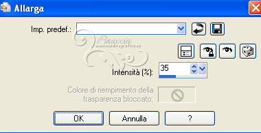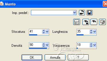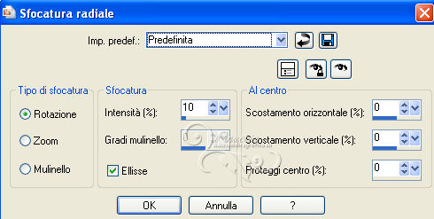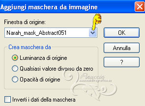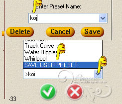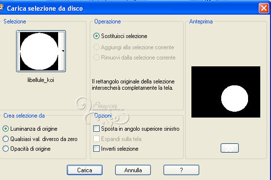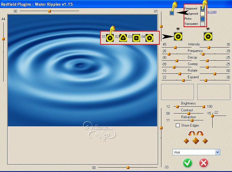 qui puoi trovare qualche risposta ai tuoi dubbi. Se l'argomento che ti interessa non è presente, ti prego di segnalarmelo. Questo tutorial è stato creato con PSP XII, ma può essere eseguito anche con le altre versioni di PSP. Per tradurlo ho usato PSP X. Occorrente. Materiale qui Il tube dei pesci è di Libellule. Una maschera è di Narah. Un frattale viene dal sito Freehqimage Il resto del materiale è di Libellule. Filtri: Redfield qui ![]() Ti servirà il preset Emboss 3 da mettere nella cartella Impostazioni predefinite. Se non hai questo preset prendilo qui Metti la selezione nella cartella Selezioni. Apri la maschera in PSP e minimizzala con il resto del materiale. Colori usati in questa tag: colore di primo piano #f5f0c5 colore di sfondo #236bae. ![]() Puoi cambiare la tinta dominante, ma conserva sempre lo stesso colore come sfondo o come primo piano. 1. Apri una nuova immagine trasparente 800 x 600 pixels, e riempila con il colore di sfondo.Effetti>Plugins>Redfield - Water Ripples, attenzione a impostare correttamente tutti i settaggi. attenzione anche a non toccare i tre bottoni sopra il menu delle impostazioni, altrimenti dovrai ricominciare da capo ![]() Se vuoi salvare i settaggi, apri il menu delle impostazioni, seleziona SAVE USER PRESET, assegna un nome ai settaggi, e clicca Save per salvare. ![]() Immagine>Ridimensiona, al 120%, tutti i livelli non selezionato. 2. Passa il colore di primo piano a Gradiente, stile Radiale. ![]() Livelli>Nuovo livello raster. Riempi il livello con il gradiente.Regola>Sfocatura>Sfocatura gaussiana - raggio 20. ![]() 3. Se non lo hai ancora fatto, apri il frattale fractals-image-hq-wallpapers-freehqimage.com.jpg e minimizzalo. Livelli>Nuovo livello maschera>Da immagine. Apri il menu sotto la finestra di origine e seleziona il frattale nella lista dei files aperti. ![]() Livelli>Unisci>Unisci gruppo. Effetti>Filtro definito dall'utente Seleziona il preset Emboss3 e ok. ![]() 4. Imposta il colore di primo piano con un colore pastello. Per l'esempio ho scelto il blu chiaro #a7d3eb. Livelli>Nuovo livello raster. Riempi il livello con questo colore.Se non lo hai ancora fatto, apri la maschera Narah_mask_Abstract051 e minimizzala. Livelli>Nuovo livello maschera>Da immagine. Apri il menu sotto la finestra di origine e seleziona la maschera nella lista dei files aperti. ![]() Livelli>Unisci>Unisci gruppo. 5. Livelli>Nuovo livello raster. Selezione>Seleziona tutto. Apri l'immagine Dreams_pt__2_by_19mona90.jpg e vai a Modifica>Copia. Torna al tuo lavoro e vai a Modifica>Incolla nella selezione. Selezione>Deseleziona. Cambia la modalità di miscelatura di questo livello in Sovrapponi. 6. Selezione>Carica/Salva selezione>Carica selezione da disco. Cerca e carica la selezione libellule-koi. ![]() Livello>Nuovo livello raster. Apri il tube libellulegraphisme_animaux27.png e vai a Modifica>Copia. Torna al tuo lavoro e vai a Modifica>Incolla nella selezione. Mantieni selezionato. 7. Livelli>Nuovo livello raster. Riempi con il gradiente.Regola>Sfocatura>Sfocatura radiale, con i settaggi standard. ![]() Mantieni sempre selezionato. Effetti>Plugins>Redfield - Lattice Composer. attenzione, anche qui fai molta attenzione ai settaggi, che puoi sempre salvare come spiegato con il filtro precedente. ![]() 8. Effetti>Effetti di distorsione>Allarga (nelle versioni più recenti di PSP, Espansione). ![]() Modifica>Ripeti Allarga. Effetti>Effetti geometrici>Sfera. ![]() Abbassa l'opacità di questo livello al 20%. Effetti>Effetti di bordo>Aumenta. Mantieni ancora selezionato. Livelli>Nuovo livello raster. Effetti>Effetti 3D>Ritaglio, con il colore nero. ![]() Livelli>Nuovo livello raster. Effetti>Effetti 3D>Ritaglio, con il colore bianco. ![]() Mantieni ancora selezionato. Livelli>Unisci>Unisci giù. Livelli>Duplica. Regola>Aggiungi/rimuovi disturbo>Aggiungi disturbo. ![]() Livelli>Unisci>Unisci giù. Selezione>Inverti. Livelli>Nuovo livello raster. Effetti>Effetti 3D>Sfalsa ombra, con il colore #124976. ![]() Ripeti l'Effetto Sfalsa ombra, cambiando verticale e orizzontale con -4. Selezione>Deseleziona. 9. Apri il tube SNEUGLEBUBBLES.png e vai a Modifica>Copia. Torna al tuo lavoro e vai a Modifica>Incolla come nuovo livello. Spostalo in alto a sinistra.(vedi l'esempio finale). Cambia la modalità di miscelatura di questo livello in Luminanza, e abbassa l'opacità all'80%. 11. La cornice: Riporta il colore di primo al colore iniziale. Imposta il colore di primo piano con il Gradiente iniziale. ![]() Immagine>Aggiungi bordatura, 2 pixels, simmetriche, con il colore di sfondo. Immagine>Aggiungi bordatura, 1 pixel, simmetriche, con il colore di primo piano. Immagine>Aggiungi bordatura, 20 pixels, simmetriche, con il colore di sfondo. Attiva lo strumento Bacchetta magica ![]() ![]() Clicca nel bordo da 20 pixels per selezionarlo. Riempi la selezione con il gradiente.Effetti>Effetti di trama>Manto. ![]() Regola>Messa a fuoco>Accentua messa a fuoco. Selezione>Innalza selezione a livello. Effetti>Plugins>Redfield - Sketch Master. Seleziona il preset Water colors e ok. ![]() Selezione>Deseleziona. Cambia la modalità di miscelatura di questo livello in Luminanza, o come preferisci. 12. Immagine>Aggiungi bordatura, 2 pixels, simmetriche, con il colore di sfondo. Immagine>Aggiungi bordatura, 1 pixel, simmetriche, con il colore di primo piano. Regola>Messa a fuoco>Metti a fuoco. Firma il tuo lavoro e salva in formato jpg. ![]() Se hai problemi o dubbi, o trovi un link non funzionante, o anche soltanto per un saluto, scrivimi. 23 Aprile 2013 |