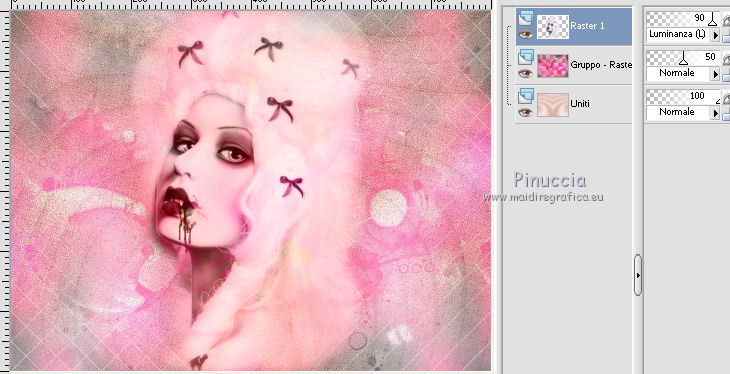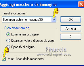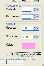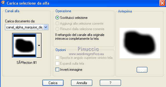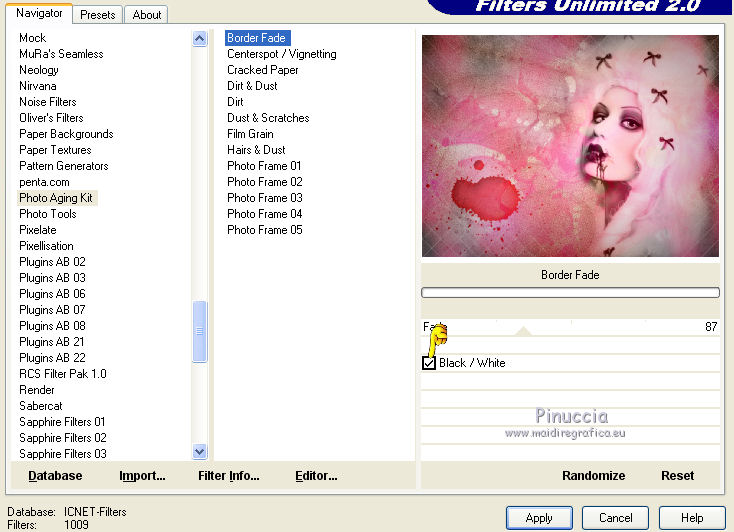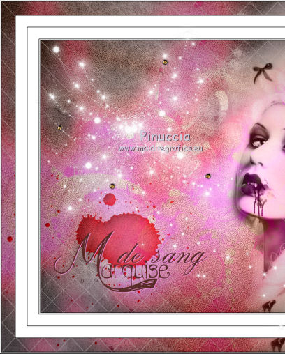 qui puoi trovare qualche risposta ai tuoi dubbi. Se l'argomento che ti interessa non è presente, ti prego di segnalarmelo. Questo tutorial è stato creato da Libellule con X12, ma può essere eseguito con tutte le versioni di PSP Dalla versione X4, il comando Immagine>Rifletti è stato sostituito con Immagine>Capovolgi in orizzontale, e il comando Immagine>Capovolgi con Immagine>Capovolgi in verticale. Nelle versioni X5 e X6, le funzioni sono state migliorate rendendo disponibile il menu Oggetti. Con la nuova versione X7, sono tornati i comandi Rifletti e Capovolgi, ma con nuove differenze. Vedi la scheda sull'argomento qui Per tradurre questo tutorial ho usato PSP X. Occorrente. Materiale qui E' vietato utilizzare il materiale per i vostri tutorial, o distribuirli in gruppi e/o forum. Filtri in caso di dubbi, ricorda di consultare la mia sezione filtri qui Filters Unlimited 2.0 qui &<Bkg Designer sf10I> - (da importare in Unlimited) qui Tramages - Pool Shadow qui AP 01 [Innovations] - Lines SilverLining qui I filtri Tramages si possono usare da soli o importati in Filters Unlimited (come fare vedi qui) Se un filtro fornito appare con questa icona ![]() Nota: se cambi l'immagine principale, scegli un misted. Secondo i tubes e i colori scelti, gli effetti potrebbero essere differenti. Puoi giocare con le modalità di miscelatura e le opacità dei livelli Nelle ultime versioni di PSP non ci sono tutti i gradienti delle versioni precedenti, tra i quelli quello di primo piano/sfondo (Corel_06_029) Trovi i gradienti delle versioni precedenti qui Apri la maschera in PSP e minimizzala con il resto del materiale. 1. Imposta il colore di primo piano con #b37a5d, e il colore di sfondo con #e0d9e1. ![]() Passa il colore di primo piano a Gradiente di primo piano/sfondo (Corel_06_029), stile Sprazzo di luce. ![]() Apri canal_alpha_marquise_de_sang.pspimages. Finestra>Duplica, o sulla tastiera maiuscolo+D per fare una copia. ![]() Chiudi l'originale. La copia, che sarà la base del tuo lavoro, non è vuota, ma contiene una selezione salvata sul canale alfa. Riempi l'immagine trasparente con il gradiente.3. Regola>Sfocatura>Sfocatura gaussiana - raggio 25. ![]() 4. Effetti>Plugins>Filters Unlimited 2.0 - &<Bkg Designer sf10I> - Corner Right Wrap. ![]() Livelli>Duplica. 5. Effetti>Plugins>Filters Unlimited 2.0 - &<Bkg Designer sf10I> - Ballons. ![]() 6. Cambia la modalità di miscelatura di questo livello in Luminanza (esistente) e abbassa l'opacità al 75%. ![]() 7. Regola>Messa a fuoco>Metti a fuoco. Regola>Messa a fuoco>Accentua messa a fuoco. Livelli>Unisci>Unisci visibile. 8. Imposta il colore di primo piano con il colore rosso #880c31. ![]() Livelli>Nuovo livello raster. Riempi il livello con il colore rosso.9. Livelli>Nuovo livello maschera>Da immagine. Apri il menu sotto la finestra di origine e vedrai la lista dei files aperti. Seleziona la maschera libellulegraphisme_masque35.jpg, con i seguenti settaggi. ![]() Livelli>Unisci>Unisci gruppo. 10. Abbassa l'opacità di questo livello al 50%. ![]() 11. Effetti>Plugins>Tramages>Pool Shadow - 2 volte. ![]() 12. Selezione>Carica/Salva selezione>Carica selezione da canale alfa. La selezione sélection#1 è subito disponibile. Devi soltanto cliccare Carica. ![]() 13. Effetti>Plugins>AP 01 [Innovations] - Lines SilverLining. ![]() Selezione>Deselezoina. 14. Apri il misted libellulegraphisme_libertine_by_autonoe.png, cancella il watermark, e vai a Modifica>Copia. Torna al tuo lavoro e vai a Modifica>Incolla come nuovo livello. 15. Immagine>Ridimensiona, all'85%, dimensione ottimale, tutti i livelli non selezionato. Cambia la modalità di miscelatura di questo livello in Luminanza (esistente) e abbassa l'opacità al 90%. ![]() 16. Effetti>Effetti di immagine>Scostamento. ![]() 17. Apri il tube PK-BW-DROP.png Edition, e vai a Modifica>Copia. Torna al tuo lavoro e vai a Modifica>Incolla come nuovo livello. 18. Immagine>Ridimensiona, al 40%, dimensione ottimale, tutti i livelli non selezionato. 19. Spostalo in basso a sinistra.Cambia la modalità di miscelatura di questo livello in Luce netta, e abbassa l'opacità al 70%. ![]() 20. Livelli>Unisci>Unisci visibile. 21. Effetti>Plugins>Filters Unlimited 2.0 - Photo Aging Kit - Border Fade. Attenzione Black/White deve essere selezionato, altrimenti avrai un bordo bianco sfumato. ![]() 22. Immagine>Aggiungi bordatura, 1 pixel, simmetriche, colore nero. Immagine>Aggiungi bordatura, 2 pixels, simmetriche, colore bianco. Immagine>Aggiungi bordatura, 1 pixels, simmetriche, colore nero. 23. Modifica>Copia. 24. Immagine>Aggiungi bordatura, 25 pixels, simmetriche, colore bianco. Immagine>Aggiungi bordatura, 1 pixels, simmetriche, colore nero. Immagine>Aggiungi bordatura, 25 pixels, simmetriche, colore bianco. Immagine>Aggiungi bordatura, 1 pixels, simmetriche, colore nero. 25. Selezione>Seleziona tutto. Immagine>Aggiungi bordatura, 35 pixels, simmetriche, colore bianco. 26. Selezione>Inverti. Modifica>Incolla nella selezione. Selezione>Deseleziona. 27. Apri il wordart marquise_de_sang_mot_art.png, e vai a Modifica>Copia. Torna al tuo lavoro e vai a Modifica>Incolla come nuovo livello. 28. Spostalo in basso a sinistra, sulla macchia di sangue.![]() 29. Effetti>Effetti 3D>Sfalsa ombra, colore #fb9fef. ![]() 30. Apri il tube constellation.png. e vai a Modifica>Copia. Torna al tuo lavoro e vai a Modifica>Incolla come nuovo livello. 31. Immagine>Ridimensiona, al 95%, dimensione ottimale, tutti i livelli non selezionato. 32. Effetti>Effetti di immagine>Scostamento. ![]() 33. Regola>Messa a fuoco>Metti a fuoco. 34. Firma il tuo lavoro. Livelli>Unisci>Unisci tutto. Salva in formato jpg. Per questo esempio ho usato un tube di Criss. ![]() ![]() Le vostre versioni. Grazie ![]() Olimpia ![]() Puoi scrivermi per qualsiasi problema, o dubbio se trovi un link che non funziona, o anche soltanto per un saluto 13 Settembre 2015 |