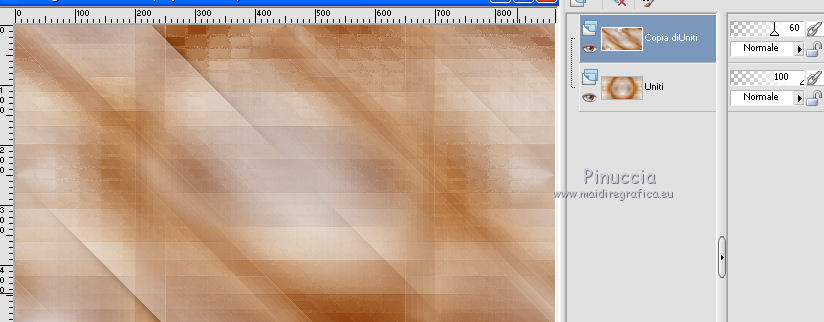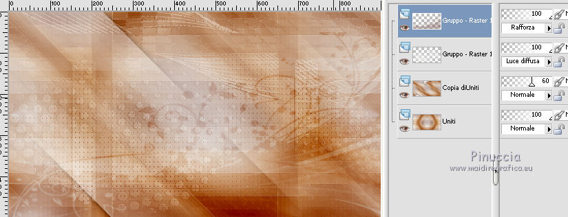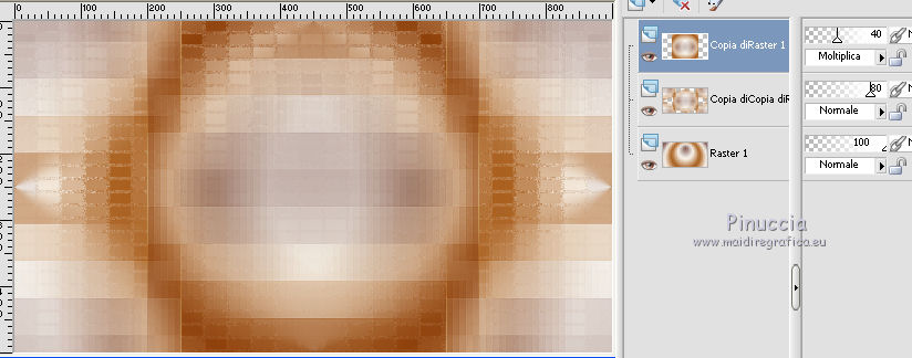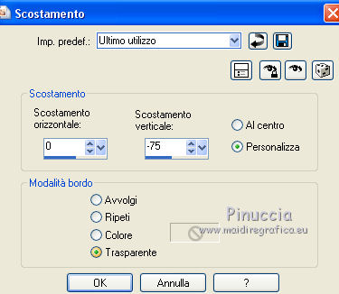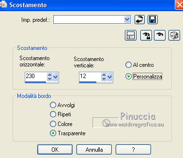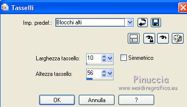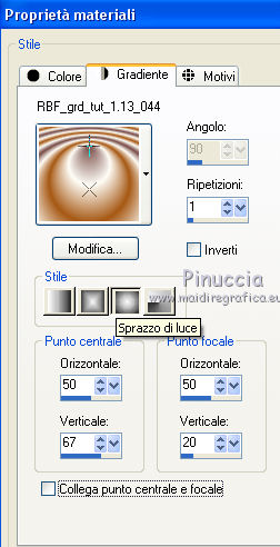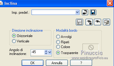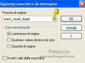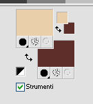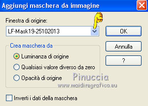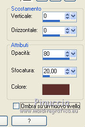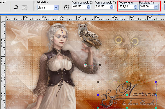 qui puoi trovare qualche risposta ai tuoi dubbi. Se l'argomento che ti interessa non è presente, ti prego di segnalarmelo. Questo tutorial è stato creato da Libellule con X19 e tradotto con CorelX, ma può essere eseguito con tutte le versioni di PSP Dalla versione X4, il comando Immagine>Rifletti è stato sostituito con Immagine>Capovolgi in orizzontale, e il comando Immagine>Capovolgi con Immagine>Capovolgi in verticale. Nelle versioni X5 e X6, le funzioni sono state migliorate rendendo disponibile il menu Oggetti. Con la nuova versione X7, sono tornati i comandi Rifletti e Capovolgi, ma con nuove differenze. Vedi la scheda sull'argomento qui Occorrente. Materiale qui Questo tutorial è dedicato a Martine, che condivide i suoi tubes con lo pseudo Lecture 33 (in questa pagina trovi i links ai loro siti). Filtri in caso di dubbi, ricorda di consultare la mia sezione filtri qui Filters Unlimited 2.0 qui Simple - 4Way Average qui I filtri Simple si possono usare da soli o importati in Filters Unlimited (come fare vedi qui) Se un filtro fornito appare con questa icona ![]() non esitare a cambiare modalità di miscelatura e opacità secondo i colori utilizzati. Metti il pennello di Linda LF-Brush-Stars-22112013 nella cartella Pennelli. Attenzione, il pennello si compone di due files che non devono essere separati. Vedi gli appunti sui pennelli qui Metti il preset Emboss 3 nella cartella Impostazioni predefinite. Metti il gradiente RBF_grd_tut.1.13.044 nella cartella Gradienti. (nello zip trovi altri gradiente dello stesso tipo, che potrai cambiare se usi altri colori) Apri le maschere in PSP e minimizzale con il resto del materiale. 1. Imposta il colore di primo piano con il colore 1 #eacfab e il colore di sfondo con il colore 2 #5e302b. ![]() Passa il colore di primo piano a Gradiente, e seleziona il gradiente RBF_grd_tut.1.13_044, stile Sprazzo di luce. ![]() 2. Apri una nuova immagine trasparente 900 x 500 pixels, e riempila con il gradiente.3. Livelli>Duplica. 4. Effetti>Plugins>Simple - 4 Way Average. 5. Immagine>Ruota per gradi - 90 gradi a sinistra. ![]() 6. Attiva il livello inferiore. Effetti>Effetti di trama>Mosaico antico. ![]() 7. Selezione>Seleziona tutto. Immagine>Ritaglia la selezione. 8. Attiva il livello superiore. Livelli>Duplica. 9. Effetti>Effetti di distorsione>Tasselli. ![]() Effetti>Effetti di bordo>Aumenta. 10. Effetti>Effetti di immagine>Motivo unico, con i settaggi standard. ![]() 11. Livelli>Disponi>Sposta giù. Abbassa l'opacità di questo livello all'80%. ![]() 12. Attiva il livello superiore. Cambia la modalità di miscelatura di questo livello in Moltiplica, e abbassa l'opacità al 40%. ![]() 13. Livelli>Unisci>Unisci visibile. 14. Livelli>Duplica. Effetti>Effetti geometrici>Inclina. ![]() Regola>Messa a fuoco>Metti a fuoco. 15. Effetti>Effetti 3D>Sfalsa ombra, colore nero. ![]() 16. Effetti>Effetti di immagine>Motivo unico, Fianco a fianco. ![]() 17. Effetti>Effetti 3D>Sfalsa ombra, colore di sfondo #5e302b. ![]() 18. Abbassa l'opacità di questo livello al 60%. ![]() 19. Imposta il colore di primo piano con il colore bianco. Livelli>Nuovo livello raster. Riempi il livello con il colore bianco.20. Effetti>Effetti di trama>Intessitura colore intessitura #eacfab; colore spazio #5e302b. ![]() 21. Livelli>Nuovo livello maschera>Da immagine. Apri il menu sotto la finestra di origine e vedrai la lista dei files aperti. Seleziona la maschera mask_narah_dupla.jpg. ![]() Livelli>Unisci>Unisci gruppo. 22. Immagine>Ridimensiona - 900 x 590 pixels, tutti i livelli e mantieni proporzioni non selezionato ![]() Effetti>Effetti di bordo>Aumenta. 23. Cambia la modalità di miscelatura di questo livello in Luce diffusa. ![]() 24. Livelli>Nuovo livello raster. Abbassa l'opacità dello strumento Riempimento a 40% ![]() Riempi con il colore di sfondo #5e302b.25. Livelli>Nuovo livello maschera>Da immagine. Apri il menu sotto la finestra di origine e seleziona la maschera LF-Mask19-25102013.psp. ![]() Livelli>Unisci>Unisci gruppo. 26. Immagine>Ridimensiona, al 110%, tutti i livelli non selezionato, mantieni proporzioni selezionato. 27. Immagine>Rifletti. Effetti>Effetti di immagine>Scostamento. ![]() 28. Cambia la modalità di miscelatura di questo livello in Rafforza. ![]() 29. Livelli>Nuovo livello raster. Selezione>Seleziona tutto. 30. Apri il tube etoiles.png e vai a Modifica>Copia. Torna al tuo lavoro e vai a Modifica>Incolla nella selezione. Selezione>Deseleziona. 31. Abbassa l'opacità di questo livello al 60%. 32. Livelli>Nuovo livello raster. Attiva lo strumento Pennello ![]() cerca e seleziona il pennello di Linda ![]() Applica il pennello in alto a sinistra, cliccando con il tasto sinistro del mouse, per usare il colore bianco di primo piano. ![]() 33. Apri il misted KAT_2007_020390.pspimage e vai a Modifica>Copia. Torna al tuo lavoro e vai a Modifica>Incolla come nuovo livello. Immagine>Capovolgi>Capovolgi orizzontalmente. Si il tuo PSP non dispone di questo comando, passa al punto 34. 34. Effetti>Effetti di immagine>Scostamento. ![]() 35. Effetti>Filtro definito dall'utente - seleziona il preset Emboss 3 e ok. ![]() 36. Abbassa l'opacità di questo livello al 25%. Colorizza il tuo tube se trovi una grande differenza con i tuoi colori, o cambia la modalità di miscelatura del livello in Luminanza (esistente). 37. Apri il tube di Cibi Lady_and_owl_by_CibiBijoux.png e vai a Modifica>Copia. Torna al tuo lavoro e vai a Modifica>Incolla come nuovo livello. Cancella il watermark. Immagine>Ridimensiona, all'80%, tutti i livelli non selezionato. Immagine>Rifletti. Regola>Messa a fuoco>Metti a fuoco. Sposta il tube a sinistra.38. Livelli>Duplica. Regola>Sfocatura>Sfocatura gaussiana - raggio 10. ![]() 39. Livelli>Disponi>Sposta giù. Cambia la modalità di miscelatura di questo livello in Moltiplica, e abbassa l'opacità al 62%. 40. Attiva il livello superiore. Apri il testo martine_titre_libellule.png e vai a Modifica>Copia. Torna al tuo lavoro e vai a Modifica>Incolla come nu