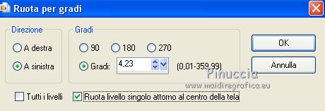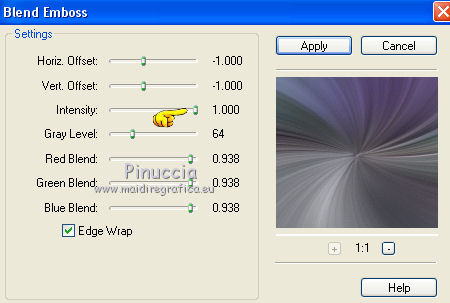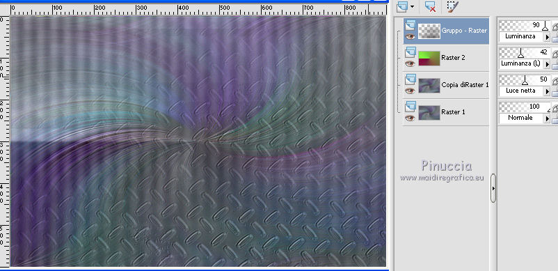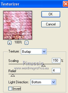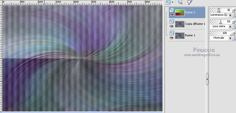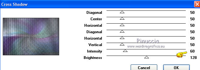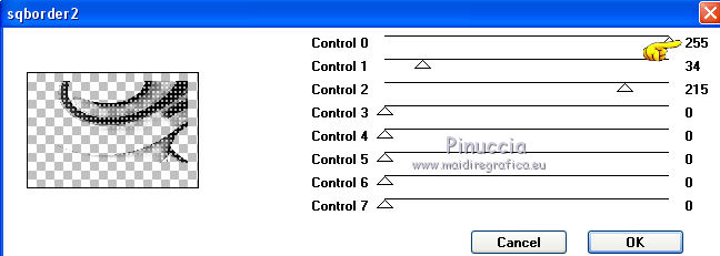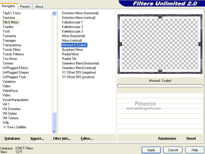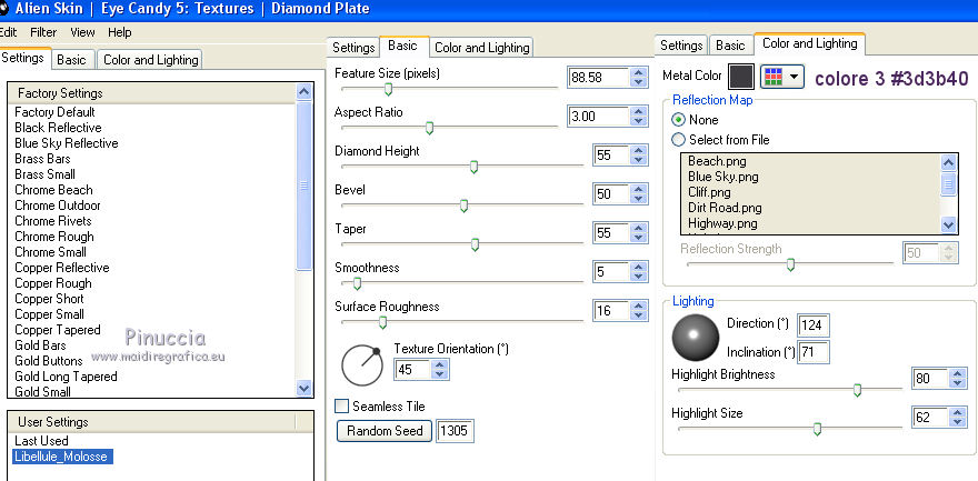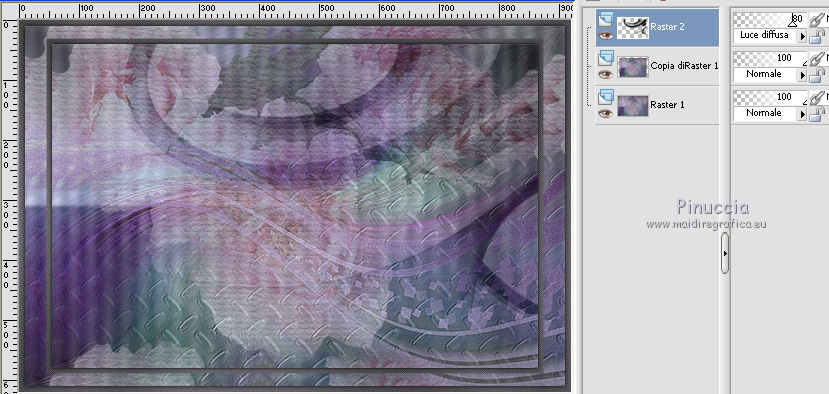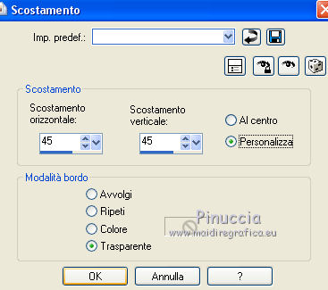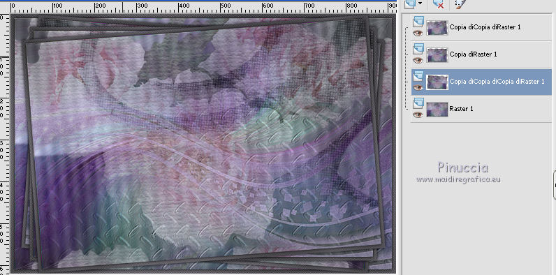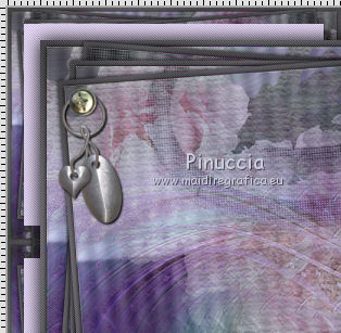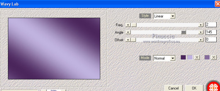 qui puoi trovare qualche risposta ai tuoi dubbi. Se l'argomento che ti interessa non è presente, ti prego di segnalarmelo. Questo tutorial è stato creato da Libellule con X17, ma può essere eseguito con tutte le versioni di PSP Dalla versione X4, il comando Immagine>Rifletti è stato sostituito con Immagine>Capovolgi in orizzontale, e il comando Immagine>Capovolgi con Immagine>Capovolgi in verticale. Nelle versioni X5 e X6, le funzioni sono state migliorate rendendo disponibile il menu Oggetti. Con la nuova versione X7, sono tornati i comandi Rifletti e Capovolgi, ma con nuove differenze. Vedi la scheda sull'argomento qui Per tradurre questo tutorial ho usato PSP X. Occorrente. Materiale qui Filtri in caso di dubbi, ricorda di consultare la mia sezione filtri qui Filters Unlimited 2.0 qui AFS IMPORT - sqborder2 qui Alien Skin Eye Candy 5 Texture qui Tronds Patterns qui Graphics Plus - Cross Shadow qui Mehdi - Wavy Lab qui Penta.com - Jeans qui FM Tile Tools - Blend Emboss qui I filtri Graphics Plus, Tronds, Penta.com e AFS IMPORT si possono usare da soli o importati in Filters Unlimited (come fare vedi qui) Se un filtro fornito appare con questa icona ![]() non esitare a cambiare modalità di miscelatura e opacità secondo i colori utilizzati. Metti il preset Cliccando sul file una o due volte (a seconda delle tue impostazioni), automaticamente il preset si installerà nella cartella corretta. perchè uno o due clic vedi qui Apri le maschere in PSP e minimizzale con il resto del materiale. Paletta dei colori utilizzati ![]() 1. Imposta il colore di primo piano con #c0b3df (colore 1), e il colore di sfondo con #4b265c (colore 2). ![]() Apri una nuova immagine trasparente 900 x 600 pixels, e riempila con il colore di primo piano (colore 1).2. Selezione>Seleziona tutto. Apri il tube libellulegraphisme_chien_aux_fleurs9.png, cancella il watermark. Modifica>Copia. Torna al tuo lavoro e vai a Modifica>Incolla nella selezione. Selezione>Deseleziona. 3. Effetti>Effetti di immagine>Motivo unico, con i settaggi standard. ![]() 4. Regola>Sfocatura>Sfocatura radiale. ![]() 5. Effetti>Plugins>FM Tile Tools - Blend Emboss. ![]() Ripeti il filtro una seconda volta. 6. Livelli>Duplica. Di nuovo effetti>Effetti di immagine>Motivo unico, con i settaggi standard. 7. Cambia la modalità di miscelatura di questo livello in Luce netta, e abbassa l'opacità al 50%. ![]() 8. Livelli>Nuovo livello raster. Riempi il livello con il colore di primo piano (colore 1).9. Effetti>Plugins>Trond Patterns - Crazy one, con i settaggi standard. ![]() 10. Regola>Sfocatura>Sfocatura. 11. Regola>Sfocatura>Accentua sfocatura. 12. Cambia la modalità di miscelatura di questo livello in Luminanza (esistente), e abbassa l'opacità al 42%. ![]() 13. Livelli>Nuovo livello raster. Riempi il livello con il colore di primo piano (colore 1).14. Effetti>Plugins>Alien Skin Eye Candy 5 Textures - Diamond Plate. Seleziona il preset Libellule_diamond_plate e ok. Questi i settaggi, in caso di problemi con il preset. ![]() 15. Livelli>Nuovo livello maschera>Da immagine. Apri il menu sotto la finestra di origine e vedrai la lista dei files aperti. Seleziona la maschera Narah_mask_0902. ![]() Livelli>Unisci>Unisci gruppo. 16. Effetti>Filtro definito dall'utente, seleziona il preset Emboss 3 e ok. ![]() 17. Cambia la modalità di miscelatura di questo livello in Luminanza, e abbassa l'opacità al 90%. ![]() 18. Livelli>Unisci>Unisci visibile. 19. Effetti>Plugins>Graphics Plus - Cross Shadow. ![]() 20. Livelli>Nuovo livello raster. Selezione>Seleziona tutto. Apri il tube fleurs priss_haiku_el10.png Edition, e vai a Modifica>Copia. Torna al tuo lavoro e vai a Modifica>Incolla nella selezione. Selezione>Deseleziona. 22. Effetti>Effetti di immagine>Motivo unico, intermittente diagonale. ![]() 23. Effetti>Plugins>Texture - Texturizer. ![]() 24. Abbassa l'opacità di questo livello al 40%. 25. Regola>Messa a fuoco>Metti a fuoco. 26. Livelli>Nuovo livello raster. Effetti>Plugins>Mehdi - Wavy Lab. questo filtro lavora con i colori della paletta; il primo è il colore di sfondo, il secondo quello di primo piano; mantieni il terzo colore creato dal filtro. ![]() 27. Regola>Sfocatura>Sfocatura gaussiana - raggio 50. ![]() 28. Livelli>Nuovo livello maschera>Da immagine. Apri il menu sotto la finestra di origine e seleziona la maschera LF-Mask-215. ![]() Livelli>Unisci>Unisci gruppo. Effetti>Effetti di bordo>Aumenta. 29. Regola>Aggiungi/Rimuovi disturbo>Aggiungi disturbo. ![]() 30. Effetti>Effetti di distorsione>Onda. ![]() 31. Effetti>Effetti di immagine>Scostamento. ![]() 32. Abbassa l'opacità di questo livello al 70%. 33. Seleziona tutto. Immagine>Aggiungi bordatura, 10 pixels, simmetriche, colore 3 #3d3b40. 34. Selezione>Inverti. 35. Effetti>Plugins>Penta.com - Jeans, con i settaggi standard. ![]() 36. Di nuovo Selezione>Inverti. Effetti>Effetti 3D>Sfalsa ombra, colore nero. ![]() Selezione>Deseleziona. 37. Livelli>Duplica. Immagine>Ridimensiona, al 90%, bicubica, tutti i livelli non selezionato. 38. Apri il pennello LF-Brush-54.png, cancella il watermark e vai a Modifica>Copia. Torna al tuo lavoro e vai a Modifica>Incolla come nuovo livello. 39. Effetti>Effetti di immagine>Scostamento. ![]() 40. Cambia la modalità di miscelatura di questo livello in Luce diffusa, e abbassa l'opacità all'80%. ![]() 41. Effetti>Plugins>AFS IMPORT - sqborder2. ![]() 42. Livelli>Unisci>Unisci giù. 43. Effetti>Effetti 3D>Sfalsa ombra, con i settaggi precedenti. ![]() 44. Livelli>Duplica. Immagine>Ruota per gradi - 4,23 gradi a sinistra Attenzione: mettere una virgola, non un punto ![]() 45. Livelli>Duplica. Immagine>Rifletti. Livelli>Disponi>Sposta giù - 2 volte. ![]() 46. Livelli>Unisci>Unisci visibile. 47. Seleziona tutto. Modifica>Copia. 48. Immagine>Aggiungi bordatura, 50 pixels, simmetriche, colore bianco. Selezione>Inverti. 49. Livelli>Nuovo livello raster. Modifica>Incolla nella selezione. 50. Effetti>Plugins>Filters Unlimited 2.0 - Tile &Mirror - Mirrored &Sca