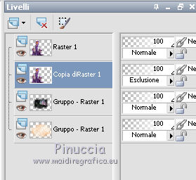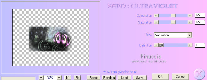 qui puoi trovare qualche risposta ai tuoi dubbi. Se l'argomento che ti interessa non è presente, ti prego di segnalarmelo. Questo tutorial è stato creato da Libellule con X12, ma può essere eseguito con tutte le versioni di PSP Dalla versione X4, il comando Immagine>Rifletti è stato sostituito con Immagine>Capovolgi in orizzontale, e il comando Immagine>Capovolgi con Immagine>Capovolgi in verticale. Nelle versioni X5 e X6, le funzioni sono state migliorate rendendo disponibile il menu Oggetti. Con la nuova versione X7, sono tornati i comandi Rifletti e Capovolgi, ma con nuove differenze. Vedi la scheda sull'argomento qui Per tradurre questo tutorial ho usato PSP X. Occorrente. Materiale qui E' vietato utilizzare il materiale per i vostri tutorial, o distribuirli in gruppi e/o forum. Filtri in caso di dubbi, ricorda di consultare la mia sezione filtri qui Filters Unlimited 2.0 qui Graphics Plus - Cross Shadow qui Xero - Ultraviolet qui I filtri Graphics Plus si possono usare da soli o importati in Filters Unlimited (come fare vedi qui) Se un filtro fornito appare con questa icona ![]() Metti il tube psptubez_insct_019 nella cartella Ornamenti. Apri le maschere in PSP e minimizzale con il resto del materiale. 1. Imposta il colore di primo piano con il colore nero #000000. 2. Apri canal_alpha_Moon witch.pspimage. Finestra>Duplica e chiudi l'originale. La copia, che sarà la base del tuo lavoro, non è vuota, ma contiene una selezione salvata sul canale alfa. 3. Riempi l'immagine trasparente con il colore nero.4. Livelli>Nuovo livello maschera>Da immagine. Apri il menu sotto la finestra di origine e vedrai la lista dei files aperti. Seleziona la maschera halloween_masque5. ![]() Livelli>Unisci>Unisci gruppo. 5. Immagine>Ridimensiona, all'80%, tutti i livelli non selezionato. 6. Effetti>Effetti di immagine>Scostamento. ![]() 7. Livelli>Nuovo livello raster. Selezione>Seleziona tutto. Apri la trama libellulegraphisme_papier_halloween5, e vai a Modifica>Copia. Torna al tuo lavoro e vai a Modifica>Incolla nella selezione. Selezione>Deseleziona. 8. Livelli>Disponi>Sposta giù. Livelli>Nuovo livello maschera>Da immagine. Apri il menu sotto la finestra di origine e seleziona la maschera leemonca8. ![]() Livelli>Unisci>Unisci gruppo. 9. Immagine>Ridimensiona, al 110%, dimensione ottimale, tutti i livelli non selezionato. Regola>Messa a fuoco>Metti a fuoco. 10. Attiva il livello superiore. Apri il mist libellulegraphisme_cinderella Finestra>Duplica, e chiudi l'originale. Sulla copia: Immagine>Rifletti. Immagine>Ridimensiona, al 60%, tutti i livelli non selezionato. 11. Modifica>Copia. Torna al tuo lavoro e vai a Modifica>Incolla come nuovo livello. 12. Effetti>Effetti di immagine>Scostamento. ![]() 13. Selezione>Carica/Salva selezione>Carica selezione da canale alfa. La selezione sélection#1 è subito disponibile. Devi soltanto cliccare Carica. ![]() Premi sulla tastiera il tasto CANC ![]() Selezione>Deseleziona. 14. Effetti>Plugins>Xero - Ultraviolet. ![]() 15. Livelli>Unisci>Unisci giù. 16. Effetti>Plugins>Graphics Plus - Cross Shadow. ![]() 17. Apri il tube di Lila 772967069194a0, cancella il watermark, e vai a Modifica>Copia. Torna al tuo lavoro e vai a Modifica>Incolla come nuovo livello. 18. Immagine>Rifletti. Sposta il tube a sinistra:attenzione a non nascondere la luna. ![]() 19. Effetti>Effetti 3D>Sfalsa ombra. ![]() 20. Livelli>Duplica. Regola>Sfocatura>Sfocatura gaussiana - raggio 5. ![]() 21. Livelli>Disponi>Sposta giù. Cambia la modalità di miscelatura di questo livello in Esclusione (questo darà un'ombra verde intorno al tube, che può cambiare secondo il tube utilizzato). ![]() 22. Attiva il livello superiore. Apri il tube libellulegaphisme_chauvesouris, e vai a Modifica>Copia. Torna al tuo lavoro e vai a Modifica>Incolla come nuovo livello. 23. Immagine>Ridimensiona, al 40%, tutti i livelli non selezionato. Sposta il tube in alto a destra.24. Apri il tube EL3, e vai a Modifica>Copia. Torna al tuo lavoro e vai a Modifica>Incolla come nuovo livello. 25. Effetti>Effetti di immagine>Scostamento. ![]() 26. Dovresti avere questo. ![]() 27. Attiva il livello Gruppo-Raster 1. ![]() 28. Apri il tube HighFour_BOO_Element53, e vai a Modifica>Copia. Torna al tuo lavoro e vai a Modifica>Incolla come nuovo livello. Spostalo a sinistra.![]() 29. Attiva il livello superiore. Apri il tube Achtergrond, e vai a Modifica>Copia. Torna al tuo lavoro e vai a Modifica>Incolla come nuovo livello. 30. Immagine>Ridimensiona, all'80%, tutti i livelli non selezionato. Sposta il tube in basso a destra.31. Attiva lo strumento Gomma o, se preferisci, selezione a mano libera ![]() e cancella i bottoni sul gatto. ![]() 32. Livelli>Nuovo livello raster. Attiva lo strumento Ornamento ![]() cerca e seleziona l'ornamento psptubez_insct_019, scala 10 ![]() e applicalo in basso a destra. Per il mio esempio: Immagine>Rifletti. ![]() 33. Firma il tuo lavoro. Livelli>Unisci>Unisci visibile e salva in formato png, se vuoi mantenere lo sfondo trasparente. Se non vuoi conservare lo sfondo trasparente: Livelli>Unisci>Unisci tutto e salva in formato jpg per avere lo sfondo bianco. Per questo esempio ho usato un tube di Krys. ![]() ![]() Puoi scrivermi per qualsiasi problema, o dubbio se trovi un link che non funziona, o anche soltanto per un saluto 29 Settembre 2015 |
