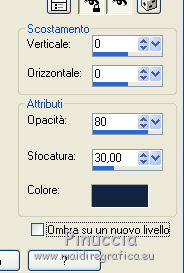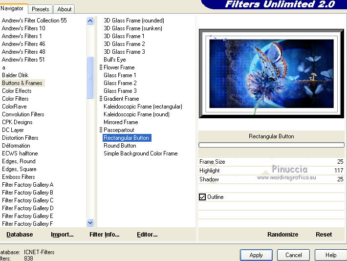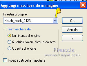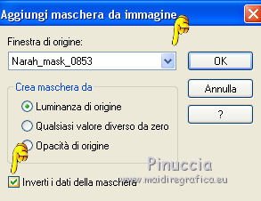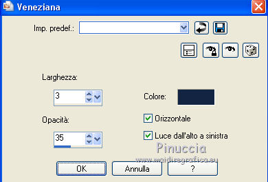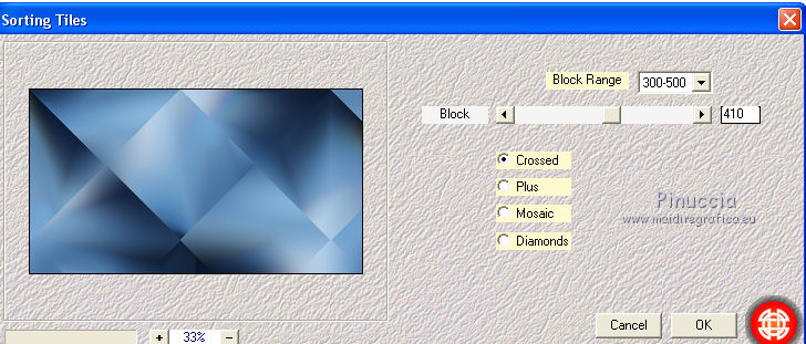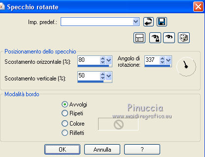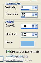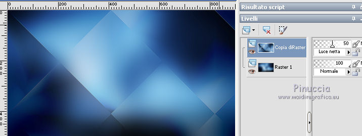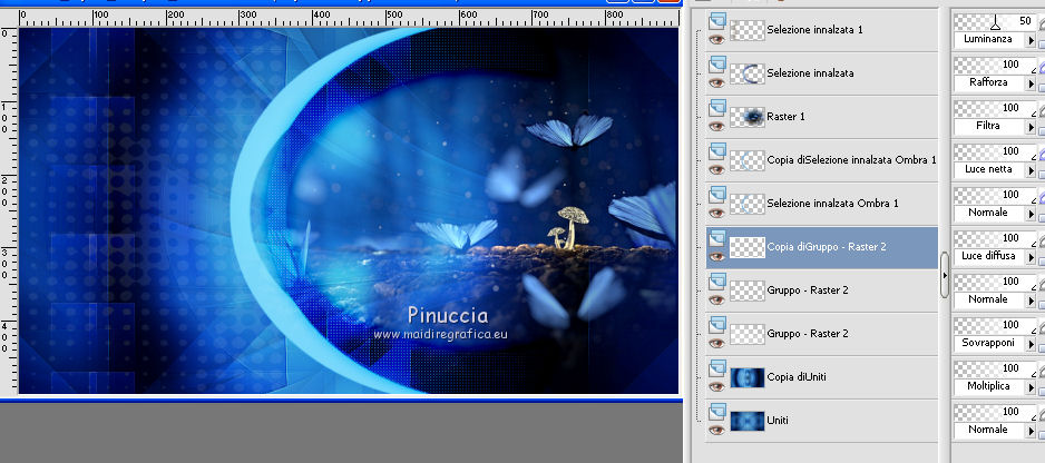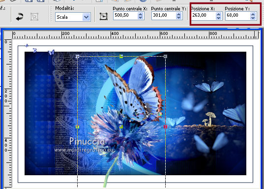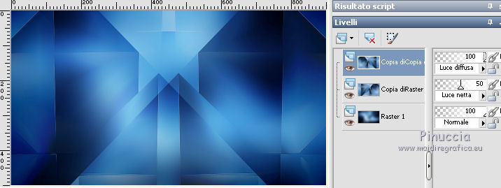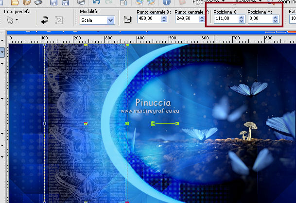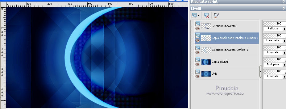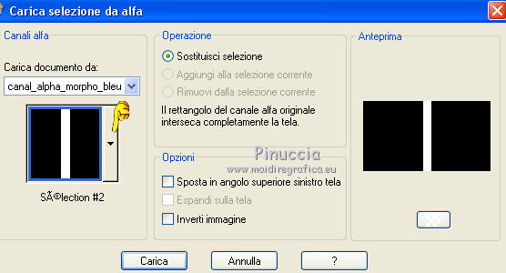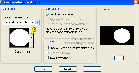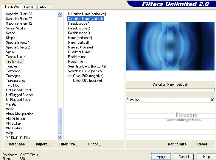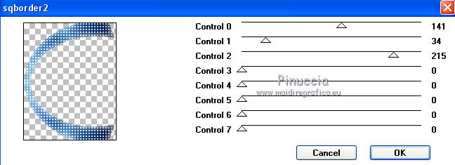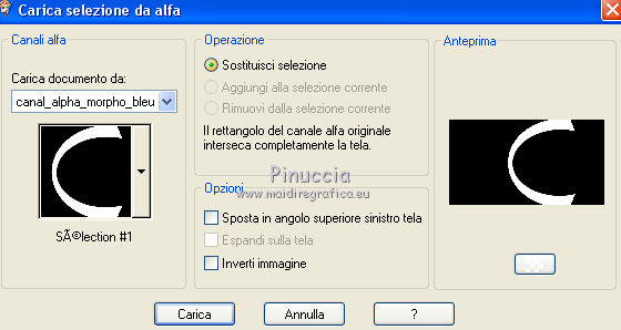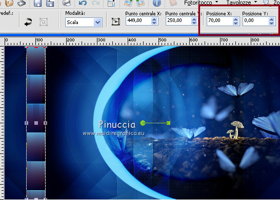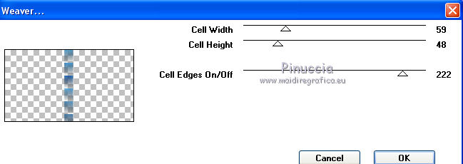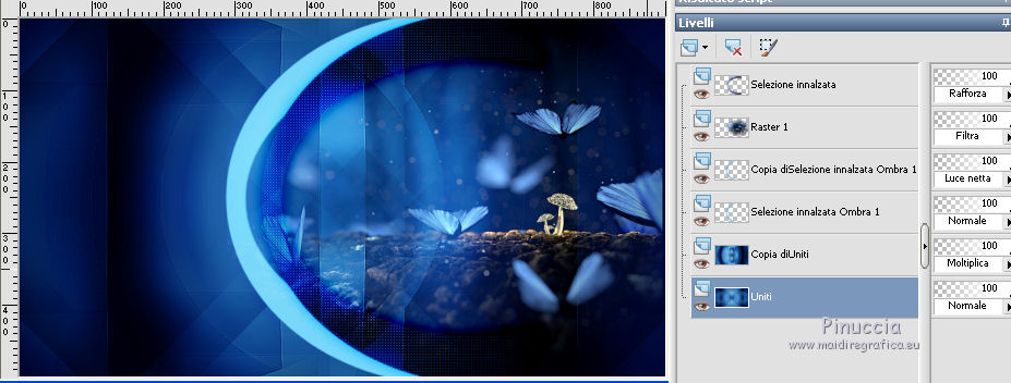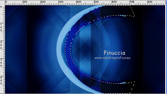 qui puoi trovare qualche risposta ai tuoi dubbi. Se l'argomento che ti interessa non è presente, ti prego di segnalarmelo. Questo tutorial è stato creato da Libellule con X19 e tradotto con CorelX, CorelX17 e CorelX19, ma può essere eseguito con tutte le versioni di PSP Dalla versione X4, il comando Immagine>Rifletti è stato sostituito con Immagine>Capovolgi in orizzontale, e il comando Immagine>Capovolgi con Immagine>Capovolgi in verticale. Nelle versioni X5 e X6, le funzioni sono state migliorate rendendo disponibile il menu Oggetti. Con la nuova versione X7, sono tornati i comandi Rifletti e Capovolgi, ma con nuove differenze. Vedi la scheda sull'argomento qui Occorrente. Materiale qui I tubes sono di Libellule Le maschere sono di Narah e CreationTine Filtri in caso di dubbi, ricorda di consultare la mia sezione filtri qui Filters Unlimited 2.0 qui Mehdi - Sorting Tiles qui FM Tile Tools - Blend Emboss qui Simple - 4Way Average qui Toadies - Weaver, What are you qui AFS IMPORT - sqborder2 qui I filtri Toadies e Simple si possono usare da soli o importati in Filters Unlimited (come fare vedi qui) Se un filtro fornito appare con questa icona ![]() non esitare a cambiare modalità di miscelatura e opacità secondo i colori utilizzati. Apri le maschere in PSP e minimizzale con il resto del materiale. Colori utilizzati ![]() 1. Apri canal_alpha_morphobleu.pspimage. Finestra>Duplica, o sulla tastiera maiuscola+D, per fare una copia. Chiudi l'originale. La copia, che sarà la base del tuo lavoro, non è vuota, ma contiene le selezioni salvate sul canale alfa. 2. Selezione>Seleziona tutto. Apri l'immagine fond_morpho_bleu.jpg e vai a Modifica>Copia. Torna al tuo lavoro e vai a Modifica>Incolla nella selezione. Selezione>Deseleziona. 3. Regola>Sfocatura>Sfocatura gaussiana - raggio 50. ![]() 4. Livelli>Duplica. 5. Effetti>Effetti di immagine>Motivo unico, con i settaggi standard. ![]() 6. Effetti>Plugins>Mehdi - Sorting Tiles. ![]() 7. Effetti>Effetti di bordo>Aumenta. 8. Cambia la modalità di miscelatura di questo livello in Luce netta, e abbassa l'opacità al 50%. ![]() 9. Effetti>Effetti di riflesso>Specchio rotante. ![]() 10. Livelli>Duplica. Immagine>Rifletti. 11. Cambia la modalità di miscelatura di questo livello in Luce diffusa, e riporta l'opacità a 100. ![]() 12. Regola>Messa a fuoco>Accentua messa a fuoco. 13. Livelli>Unisci>Unisci visibile. 14. Livelli>Duplica. 15. Attiva il livello di sfondo, Uniti. 16. Effetti>Plugins>Simple - 4Way Average. 17. Attiva il livello superiore, Copia di Uniti. 18. Effetti>Plugins>Filters Unlimited 2.0 - Tile &Mirror - Distortion Mirror (vertical), con i settaggi standard. ![]() 19. Cambia la modalità di miscelatura di questo livello in Moltiplica. 20. Regola>Messa a fuoco>Accentua messa a fuoco. 21. Selezione>Carica/Salva selezione>Carica selezione da canale alfa. La selezione sélection#1 è subito disponibile. Devi soltanto cliccare Carica. ![]() Selezione>Innalza selezione a livello. Mantieni selezionato. 22. Regola>Sfocatura>Sfocatura gaussiana - raggio 15. ![]() 23. Cambia la modalità di miscelatura di questo livello in Rafforza. Mantieni ancora selezionato. 24. Effetti>Plugins>AFS IMPORT - sqborder2, con i settaggi standard. ![]() 25. Effetti>Effetti di bordo>Aumenta. 26. Effetti>Effetti 3D>Sfalsa ombra, colore 4 #152443. ![]() 27. Di nuovo Effetti>Effetti 3D>Sfalsa ombra, colore 2 #7cb7e3, ombra su nuovo livello selezionato. ![]() Avrai questo: ![]() Selezione>Deseleziona. 28. Rimani posizionato sul livello dell'ombra. Effetti>Effetti di trama>Veneziana - colore 4 #152443. ![]() 29. Attiva lo strumento Selezione ![]() eventualmente, per vedere meglio, lascia visibile soltanto questo livello: Livelli>Visualizza>Solo Corrente e selezione i piccoli segni visibili a destra ![]() Premi sulla tastiera il tasto CANC ![]() Selezione>Deseleziona. Livelli>Visualizza>Tutto. 30. Livelli>Duplica. Cambia la modalità di miscelatura di questo livello in Luce netta. ![]() 31. Apri il mist libellulegraphisme_morpho_bleu2.png e vai a Modifica>Copia. Torna al tuo lavoro e vai a Modifica>Incolla come nuovo livello. Spostalo a destra.Se stai usando una versione più recente, che dispone del menu Oggetti: Oggetti>Allinea>Destra ![]() 32. Cambia la modalità di miscelatura di questo livello in Filtra. Regola>Messa a fuoco>Metti a fuoco. 33. Attiva il livello inferiore ![]() 34. Selezione>Carica/Salva selezione>Carica selezione da canale alfa. Apri il menu delle selezioni e carica la selezione sélection#2. ![]() Selezione>Innalza selezione a livello. Selezione>Deseleziona. 35. Livelli>Disponi>Porta in alto. 36. Effetti>Plugins>Toadies - Weaver, con i settaggi standard. ![]() 37. Effetti>Effetti di bordo>Aumenta. 38. Tasto K per attivare lo strumento Puntatore ![]() e imposta Posizione X: 70,00 e Posizione Y: 0,00 ![]() Tasto M per deselezionare lo strumento. 39. Effetti>Plugins>Toadies - What are you. ![]() 40. Cambia la modalità di miscelatura di questo livello in Luminanza, e abbassa l'opacità al 50% (non preoccuparti se l'immagine ti sembra troppo scura. Si schiarirà dopo le maschere). 41. Attiva il livello inferiore. Selezione>Carica/Salva selezione>Carica selezione da canale alfa. Apri il menu delle selezioni e carica la selezione sélection#4. ![]() 42. Regola>Sfocatura>Sfocatura gaussiana - raggio 10. Mantieni selezionato. Attiva il livello soprastante, copia di Uniti. Modifica>Ripeti Sfocatura gaussiana. Selezione>Deseleziona. 43. Livelli>Nuovo livello raster. Imposta il colore di primo piano con il colore bianco #ffffff. Abbassa l'opacità dello strumento Riempimento a 50. Riempi con il colore bianco.44. Livelli>Nuovo livello maschera>Da immagine. Apri il menu sotto la finestra di origine e vedrai la lista dei files aperti. Seleziona la maschera Narah_mask_0423.jpg. ![]() Livelli>Unisci>Unisci gruppo. 45. Immagine>Rifletti. Cambia la modalità di miscelatura di questo livello in Sovrapponi. 46. Livelli>Nuovo livello raster. Riporta l'opacità del