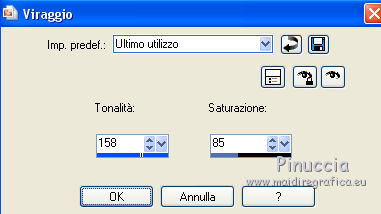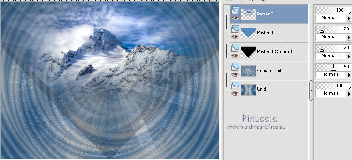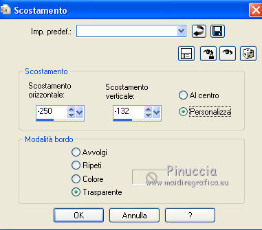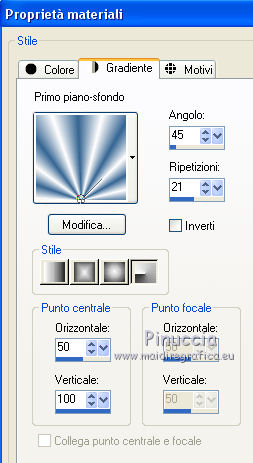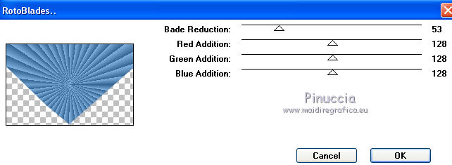 qui puoi trovare qualche risposta ai tuoi dubbi. Se l'argomento che ti interessa non è presente, ti prego di segnalarmelo. Questo tutorial è stato creato da Libellule con X12, ma può essere eseguito con tutte le versioni di PSP Dalla versione X4, il comando Immagine>Rifletti è stato sostituito con Immagine>Capovolgi in orizzontale, e il comando Immagine>Capovolgi con Immagine>Capovolgi in verticale. Nelle versioni X5 e X6, le funzioni sono state migliorate rendendo disponibile il menu Oggetti. Vedi la scheda sull'argomento qui Per tradurre questo tutorial ho usato PSP X. Occorrente. Materiale qui I tubes della donna e del paesaggio sono di Libellule. Il tube dei visi e della "terra" sono di Guismo. E' proibito utilizzare il materiale per altri tutorial o distribuirli in gruppi e/o forum. Filtri in caso di dubbi, ricorda di consultare la mia sezione filtri qui Filters Unlimited 2.0 qui Two Moon - Rotoblades qui VanDerLee - Unplugged-X qui Simple - Top Left Mirror qui I filtri Simple e Two Moon si possono usare da soli o importati in Filters Unlimited (come fare vedi qui) Se un filtro fornito appare con questa icona ![]() Metti le selezioni nella cartella Selezioni. 1. I colori indicati nel tutorial originale sono: colore di primo piano #fffefd, colore di sfondo #2c4349. Per il mio esempio ho cambiato il colore di sfondo con #356593. ![]() Passa il colore di primo piano a Gradiente di primo piano/sfondo, stile Radiale. ![]() 2. Apri una nuova immagine trasparente 900 x 650 pixels, e riempila con il gradiente.Regola>Sfocatura>Sfocatura gaussiana - raggio 30. ![]() 3. Effetti>Plugins>Simple - Top Left Mirror. ![]() Livelli>Nuovo livello raster. Selezione>Seleziona tutto. Apri il frattale Alice Kelley [35].jpg, e vai a Modifica>Copia. Torna al tuo lavoro e vai a Modifica>Incolla nella selezione. Cambia la modalità di miscelatura di questo livello in Luminanza (esistente) (o secondo i tuoi colori), e abbassa l'opacità al 30%. ![]() Selezione>Deseleziona. 4. Livelli>Unisci>Unisci visibile. Regola>Messa a fuoco>Metti a fuoco. Regola>Messa a fuoco>Accentua messa a fuoco. 5. Livelli>Duplica. Effetti>Plugins>VanDerLee - Unplugged-X - Radial Waver. ![]() Effetti>Effetti di bordo>Aumenta. Abbassa l'opacità di questo livello al 50%. ![]() 6. Livelli>Nuovo livello raster. Selezione>Carica/Salva selezione>Carica selezione da disco. Cerca e carica la selezione libellule_mysterious. ![]() Riempi con il colore scuro di sfondo.Effetti>Plugins>Two Moon - Rotoblades, con i settaggi standard. ![]() Selezione>Deseleziona. 7. Effetti>Effetti 3D>Sfalsa ombra, colore nero, e ombra su nuovo livello selezionato. 8. Rimani posizionato sul livello dell'ombra. Attiva lo strumento Puntatore ![]() se stai usando PSP 9 lo strumento Deformazione ![]() in modalità Scala, tira i nodi centrali dell'ombra in alto e in basso fino ai bordi. ![]() Abbassa l'opacità di entrambi i livelli al 20%. ![]() 9. Attiva il livello superiore. Apri il tube libellulegraphisme_paysage2.png, e vai a Modifica>Copia. Torna al tuo lavoro e vai a Modifica>Incolla come nuovo livello. Ridimensiona, se necessario. Sposta il mist in alto.Cambia la modalità di miscelatura di questo livello in Luminanza (esistente), o come preferisci. ![]() Per il mio esempio ho preferito lasciare la modalità Normale. ![]() 10. Selezione>Carica/Salva selezione>Carica selezione da disco. Carica nuovamente la selezione libellule_mysterious. ![]() Selezione>Inverti. Premi sulla tastiera il tasto CANC ![]() Selezione>Deseleziona. 11. Apri il tube calguisbengoossens25012012.pspimages. Attiva il livello Raster 1 (la parte sinistra del tube) e vai a Modifica>Copia. Torna al tuo lavoro e vai a Modifica>Incolla come nuovo livello. 12. Effetti>Effetti di immagine>Scostamento. ![]() Regola>Tonalità e saturazione>viraggio, o come preferisci. ![]() Per il mio esempio ho usato questi settaggi. ![]() Effetti>Effetti 3D>Sfalsa ombra, con i settaggi precedenti. ![]() Attiva il livello del tube. Livelli>Unisci>Unisci giù. Livelli>Duplica. Immagine>Rifletti. Livelli>Unisci>Unisci giù. 13. Modifica>Incolla come nuovo livello (il tube calguisbengoossens25012012 è ancora in memoria). Immagine>Ridimensiona, all'80%, tutti i livelli non selezionato. Effetti>Effetti di immagine>Scostamento. ![]() Livelli>Duplica. Immagine>Rifletti. Livelli>Unisci>Unisci giù. Cambia la modalità di miscelatura di questo livello in Luminanza (esistente). Livelli>Disponi>Sposta giù. ![]() 14. Livelli>Nuovo livello raster. Imposta il colore di primo piano con il colore bianco. Selezione>Carica/Salva selezione>Carica selezione da disco. Cerca e carica la selezione libellule_mysterious2. ![]() Effetti>Effetti di trama>Veneziana. ![]() Selezione>Deseleziona. Abbassa l'opacità di questo livello al 35%. Livelli>Disponi>Sposta giù. ![]() 15. Attiva il livello superiore. Apri il tube libellulegraphisme_femme43, e vai a Modifica>Copia. Torna al tuo lavoro e vai a Modifica>Incolla come nuovo livello. Immagine>Ridimensiona, al 60%, tutti i livelli non selezionato. Per il mio esempio ho ridimensionato al 70% Regola>Tonalità e saturazione>Viraggio. ![]() Abbassa l'opacità di questo livello all'85%. 16. Porta questo livello sotto i livelli dei due tubes dei visi (se il tuo tube è un mist, altrimenti lascialo in cima alla paletta). ![]() 17. Assicurati di essere posizionato sul livello superiore. Apri il tube calguisterre22012012.pspimage (livello del tube, non del mist). Modifica>Copia. Torna al tuo lavoro e vai a Modifica>Incolla come nuovo livello. Immagine>Ridimensiona, al 30%; tutti i livelli non selezionato. Sposta il tube in alto a sinistra.Livelli>Duplica. Regola>Sfocatura>Sfocatura gaussiana - raggio 20. ![]() Livelli>Disponi>Sposta giù. Attiva il livello superiore e abbassa l'opacità al 60%. 18. Apri il wordart e vai a Modifica>Copia. Torna al tuo lavoro e vai a Modifica>Incolla come nuovo livello. Spostalo in alto a destra, o dove preferisci.Si stai utilizzando altri colori, colorizza il wordart