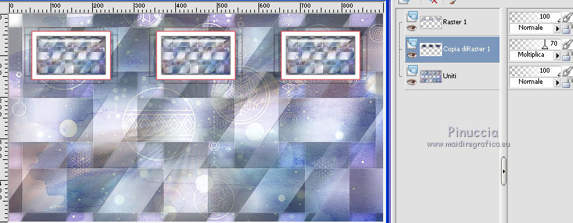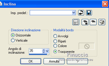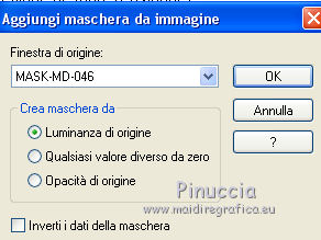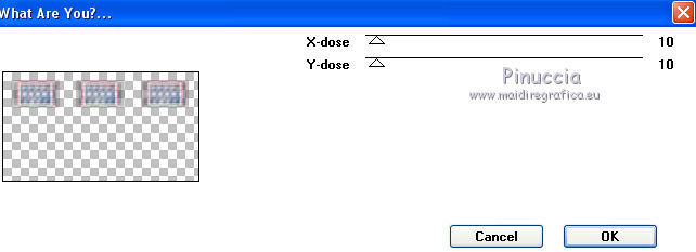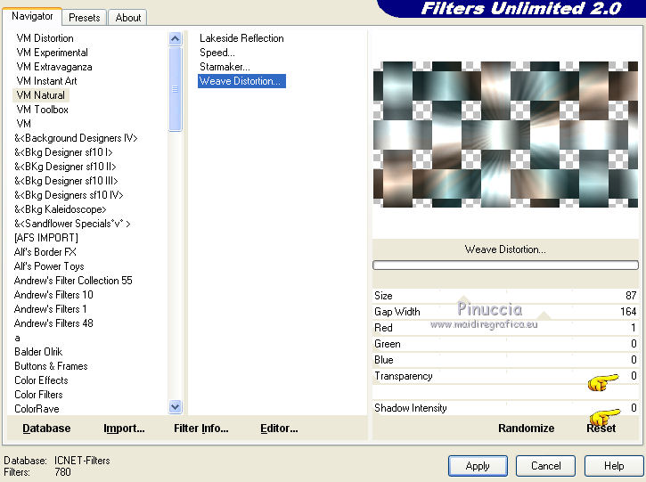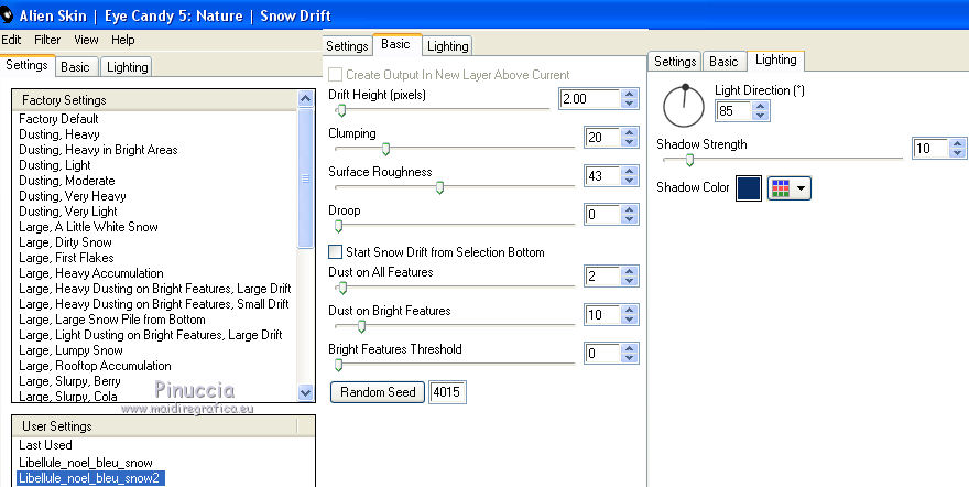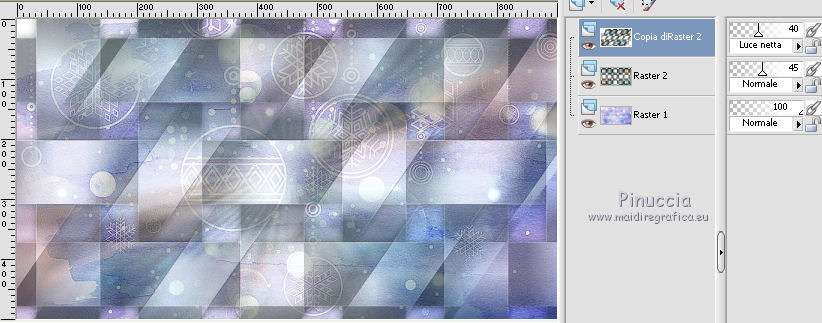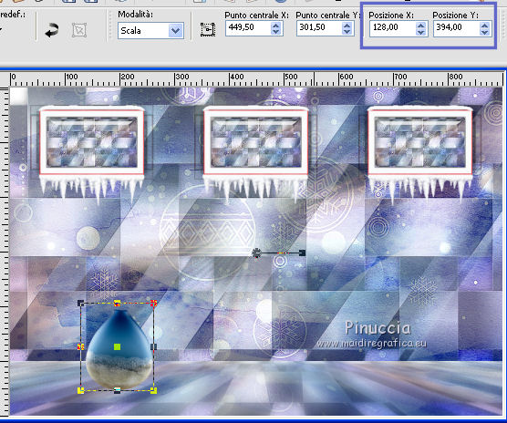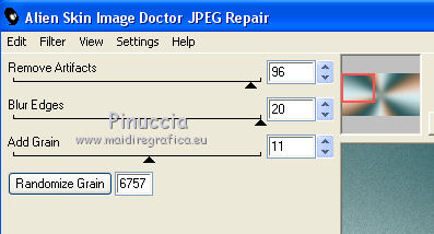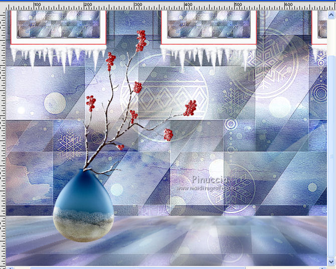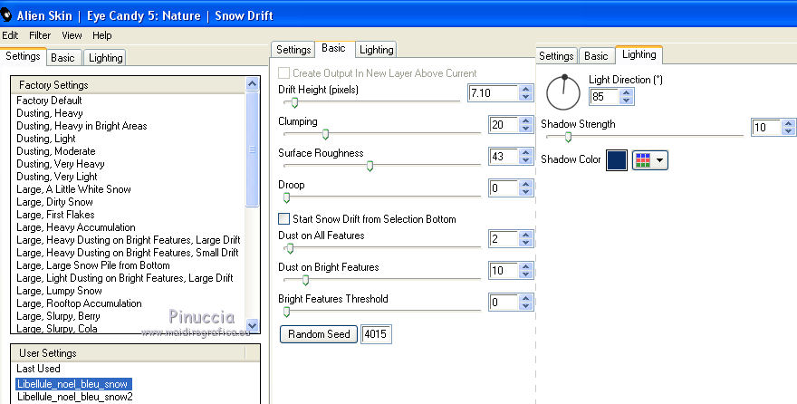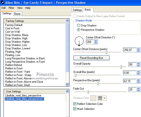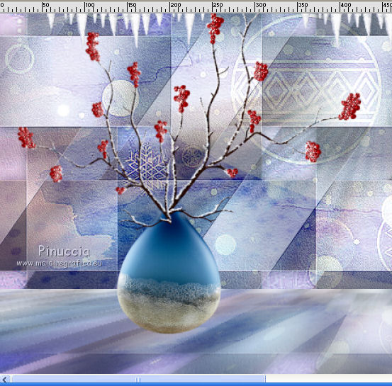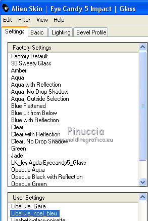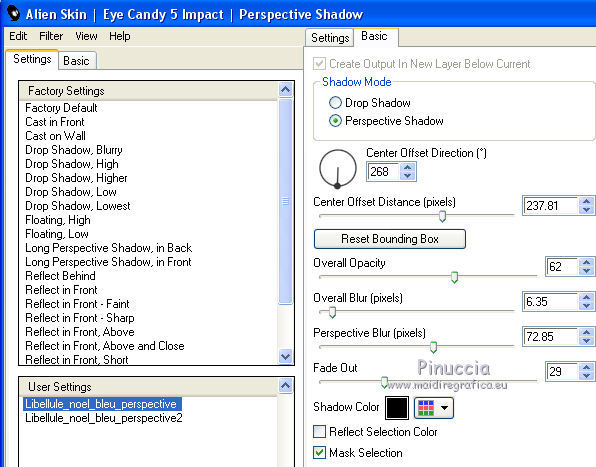qui puoi trovare qualche risposta ai tuoi dubbi. Se l'argomento che ti interessa non è presente, ti prego di segnalarmelo. Questo tutorial è stato creato da Libellule con X19 e tradotto con CorelX, ma può essere eseguito con tutte le versioni di PSP Dalla versione X4, il comando Immagine>Rifletti è stato sostituito con Immagine>Capovolgi in orizzontale, e il comando Immagine>Capovolgi con Immagine>Capovolgi in verticale. Nelle versioni X5 e X6, le funzioni sono state migliorate rendendo disponibile il menu Oggetti. Con la nuova versione X7, sono tornati i comandi Rifletti e Capovolgi, ma con nuove differenze. Vedi la scheda sull'argomento qui ![]() Le vostre versioni qui Occorrente. Materiale qui Per i tubes grazie Maryse e Cal (in questa pagina trovi i links ai loro siti). Filtri in caso di dubbi, ricorda di consultare la mia sezione filtri qui Filters Unlimited 2.0 qui Mehdi - Wavy Lab 1.1 qui &<Bkg Designers sf10IV> - @Crumple (da importare in Unlimited) qui VM Natural - Weave Distortion qui Alien Skin Eye Candy 5 Impact - Glass, Perspective Shadow qui Alien Skin Eye Candy 5 Nature - Snow Drift qui Alien Skin Eye Candy Image Doctor - JPEG Repair qui Graphics Plus - Cross shadow qui Mura's Meister - Copies qui Mura's Meister - Perspective Tiling qui Toadies - What are you qui Simple - 4Way Average qui I filtri Simple, Graphics Plus e Toadies si possono usare da soli o importati in Filters Unlimited (come fare vedi qui) Se un filtro fornito appare con questa icona ![]() non esitare a cambiare modalità di miscelatura e opacità secondo i colori utilizzati. Metti i presets Cliccando sul file una o due volte (a seconda delle tue impostazioni), automaticamente il preset si installerà nella cartella corretta. perchè uno o due clic vedi qui Se preferisci, puoi importare direttamente il preset nel corso del tutorial Come fare vedi la scheda del filtro Eye Candy qui Apri la maschera in PSP e minimizzala con il resto del materiale. colori utilizzati ![]() Se vuoi cambiare colori, conserva soltanto gli ultimi due. 1. Imposta il colore di primo piano con il colore 2 #2a5556, e il colore di sfondo con il colore 1 #dcedef. ![]() 2. Apri una nuova immagine trasparente 900 x 500 pixels. 3. Selezione>Seleziona tutto. Apri l'immagine di sfondo noel_bleu_fond.jpg e vai a Modifica>Copia. Torna al tuo lavoro e vai a Modifica>Incolla nella selezione. se vuoi cambiare colori, su questa immagine puoi utilizzare il filtro Adjust-Variations Selezione>Deseleziona. 4. Effetti>Effetti di bordo>Aumenta. 5. Livelli>Nuovo livello raster. Effetti>Plugins>Mehdi - Wavy Lab 1.1 Questo filtro lavora con i colori della paletta: il primo è il colore di sfondo, il secondo quello di primo piano; cambia gli ultimi due colori creati dal filtro: il terzo con il colore 5 #b68e70 e il quarto con il colore 3 #83a1a5 .![]() 6. Regola>Sfocatura>Sfocatura gaussiana - raggio 30. ![]() 7. Effetti>Plugins>Alien Skin Image Doctor - JPG Repair. ![]() Se non riesci a digitare le 4 cifre, clicca su Randomize Grain per avere comunque un risultato casuale. 8. Effetti>Plugins>Filters Unlimited 2.0 - &<Bkg Designers sf10IV> - @Crumple. ![]() 9. Effetti>Plugins>Graphics Plus - Cross Shadow. ![]() 10. Effetti>Plugins>Filters Unlimited 2.0 - VM Natural - Weave Distortion. ![]() 11. Effetti>Effetti di bordo>Aumenta. 12. Abbassa l'opacità di questo livello al 45%. 13. Effetti>Effetti 3D>Sfalsa ombra, colore nero. ![]() 14. Livelli>Duplica. 15. Effetti>Effetti geometrici>Inclina. ![]() 16. Cambia la modalità di miscelatura di questo livello in Luce netta, e abbassa l'opacità al 40%. ![]() 17. Effetti>Effetti 3D>Sfalsa ombra, colore 1 #dcedef (colore di sfondo).![]() 18. Livelli>Unisci>Unisci visibile. 19. Modifica>Copia. Modifica>Incolla come nuova immagine, e lavora su questa copia. 20. Immagine>Ridimensiona, al 25%, bicubica, tutti i livelli selezionato. 21. Effetti>Plugins>Alien Skin Eye Candy 5 Impact - Glass. Seleziona il preset Libellule_noel_bleu e ok. ![]() Questi i settaggi, in caso di problemi con il preset. ![]() 22. Immagine>Aggiungi bordatura, 1 pixel, simmetriche, colore nero. Immagine>Aggiungi bordatura, 15 pixels, simmetriche, colore bianco. Immagine>Aggiungi bordatura, 2 pixels, simmetriche, colore 6 #cf373a .23. Modifica>Copia. 24. Torna al tuo lavoro e vai a Modifica>Incolla come nuovo livello. Immagine>Ridimensiona, al 73%, bicubica, tutti i livelli non selezionato. Regola>Messa a fuoco>Metti a fuoco. 25. Effetti>Plugins>Mura's Meister - Copies. ![]() 26. Effetti>Effetti di immagine>Scostamento. ![]() 27. Livelli>Duplica. 28. Effetti>Plugins>Toadies - What are you. ![]() 29. Effetti>Effetti di bordo>Aumenta. Effetti>Effetti di bordo>Erodi. 30. Livelli>Disponi>Sposta giù. Cambia la modalità di miscelatura di questo livello in Moltiplica, e abbassa l'opacità al 70%. ![]() 31. Ritorna sul livello superiore. Effetti>Effetti 3D>Sfalsa ombra, colore nero. ![]() 32. Apri il tube decor1_noel_bleu_libellule.png e vai a Modifica>Copia. Torna al tuo lavoro e vai a Modifica>Incolla come nuovo livello. 33. Effetti>Effetti di immagine>Scostamento. ![]() 34. Livelli>Unisci>Unisci giù. 35. Effetti>Plugins>Alien Skin Eye Candy 5 Nature - Snow Drift. Seleziona il preset Libellule_noel_bleu_snow e ok. Questi i settaggi, in caso di problemi con il preset. ![]() 36. Attiva il livello di sfondo (Uniti). Livelli>Nuovo livello raster. Imposta il colore di primo piano con il colore 4 #6167c8. ![]() Riempi il livello con il colore 4.37. Livelli>Nuovo livello maschera>Da immagine. Apri il menu sotto la finestra di origine e vedrai la lista dei files aperti. Seleziona la maschera MASK-MD-046.jpg. ![]() Livelli>Unisci>Unisci gruppo. 38. Cambia la modalità di miscelatura di questo livello in Rafforza. 39. Livelli>Unisci>Unisci giù. 40. Livelli>Duplica. 41. Effetti>Plugins>Mura's Meister - Perspective Tiling. ![]() 42. Modifica>Taglia (questo comando, oltre a tagliare, tiene anche in memoria). 43. Selezione>Seleziona tutto. Immagine>Dimensioni t