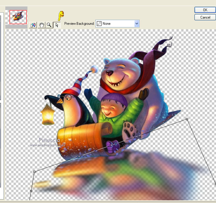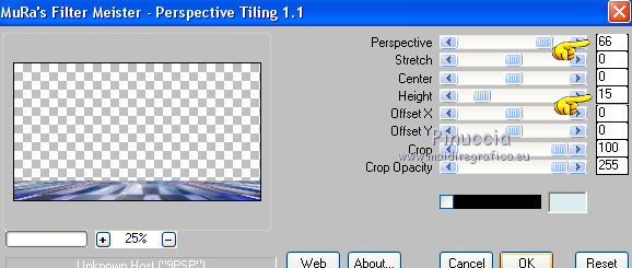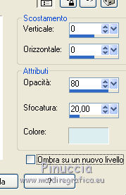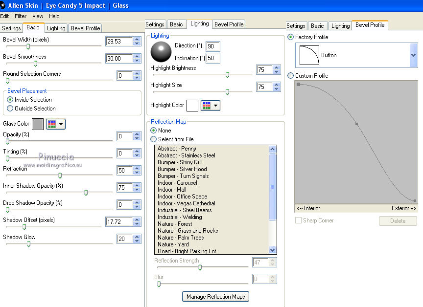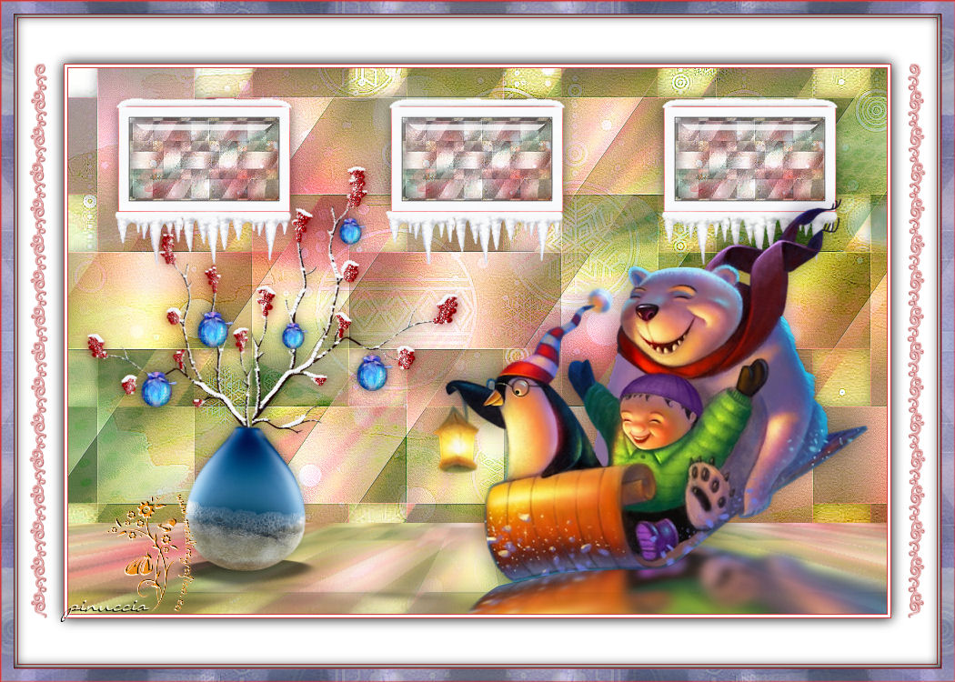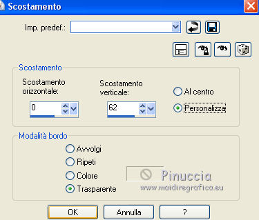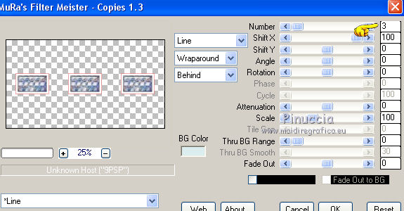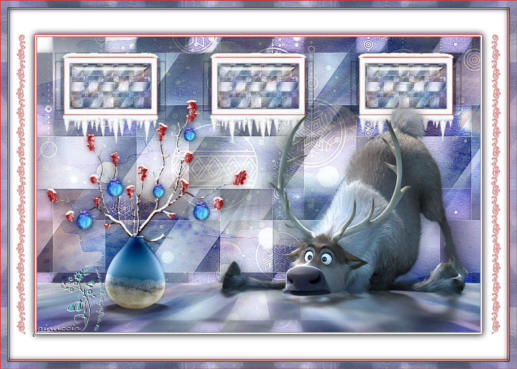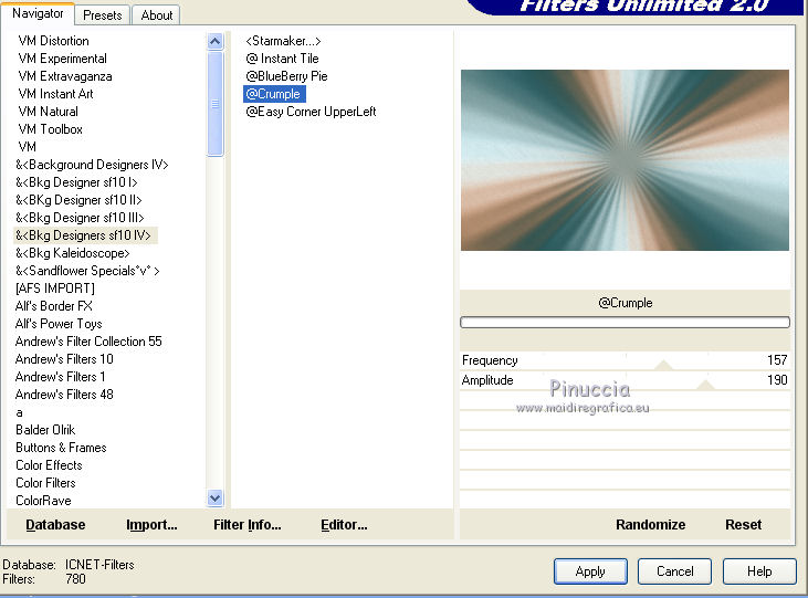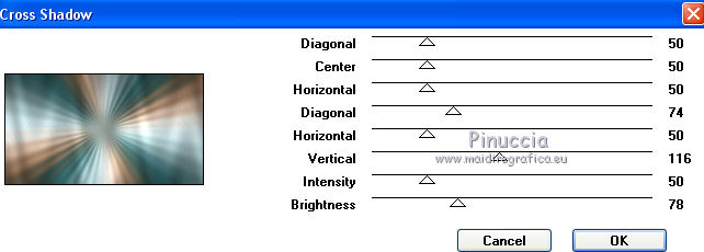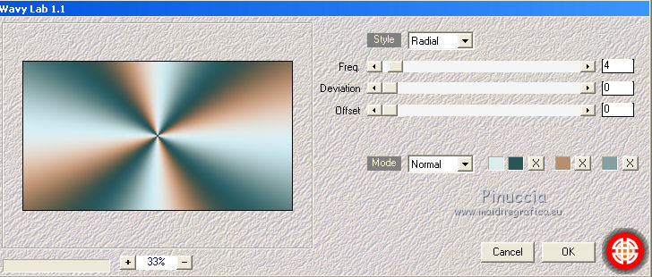 qui puoi trovare qualche risposta ai tuoi dubbi. Se l'argomento che ti interessa non è presente, ti prego di segnalarmelo. Questo tutorial è stato creato da Libellule con X19 e tradotto con CorelX, ma può essere eseguito con tutte le versioni di PSP Dalla versione X4, il comando Immagine>Rifletti è stato sostituito con Immagine>Capovolgi in orizzontale, e il comando Immagine>Capovolgi con Immagine>Capovolgi in verticale. Nelle versioni X5 e X6, le funzioni sono state migliorate rendendo disponibile il menu Oggetti. Con la nuova versione X7, sono tornati i comandi Rifletti e Capovolgi, ma con nuove differenze. Vedi la scheda sull'argomento qui ![]() Le vostre versioni qui Occorrente. Materiale qui Per i tubes grazie Maryse e Cal (in questa pagina trovi i links ai loro siti). Filtri in caso di dubbi, ricorda di consultare la mia sezione filtri qui Filters Unlimited 2.0 qui Mehdi - Wavy Lab 1.1 qui &<Bkg Designers sf10IV> - @Crumple (da importare in Unlimited) qui VM Natural - Weave Distortion qui Alien Skin Eye Candy 5 Impact - Glass, Perspective Shadow qui Alien Skin Eye Candy 5 Nature - Snow Drift qui Alien Skin Eye Candy Image Doctor - JPEG Repair qui Graphics Plus - Cross shadow qui Mura's Meister - Copies qui Mura's Meister - Perspective Tiling qui Toadies - What are you qui Simple - 4Way Average qui I filtri Simple, Graphics Plus e Toadies si possono usare da soli o importati in Filters Unlimited (come fare vedi qui) Se un filtro fornito appare con questa icona ![]() non esitare a cambiare modalità di miscelatura e opacità secondo i colori utilizzati. Metti i presets Cliccando sul file una o due volte (a seconda delle tue impostazioni), automaticamente il preset si installerà nella cartella corretta. perchè uno o due clic vedi qui Se preferisci, puoi importare direttamente il preset nel corso del tutorial Come fare vedi la scheda del filtro Eye Candy qui Apri la maschera in PSP e minimizzala con il resto del materiale. colori utilizzati ![]() Se vuoi cambiare colori, conserva soltanto gli ultimi due. 1. Imposta il colore di primo piano con il colore 2 #2a5556, e il colore di sfondo con il colore 1 #dcedef. ![]() 2. Apri una nuova immagine trasparente 900 x 500 pixels. 3. Selezione>Seleziona tutto. Apri l'immagine di sfondo noel_bleu_fond.jpg e vai a Modifica>Copia. Torna al tuo lavoro e vai a Modifica>Incolla nella selezione. se vuoi cambiare colori, su questa immagine puoi utilizzare il filtro Adjust-Variations Selezione>Deseleziona. 4. Effetti>Effetti di bordo>Aumenta. 5. Livelli>Nuovo livello raster. Effetti>Plugins>Mehdi - Wavy Lab 1.1 Questo filtro lavora con i colori della paletta: il primo è il colore di sfondo, il secondo quello di primo piano; cambia gli ultimi due colori creati dal filtro: il terzo con il colore 5 #b68e70 e il quarto con il colore 3 #83a1a5 .![]() 6. Regola>Sfocatura>Sfocatura gaussiana - raggio 30. ![]() 7. Effetti>Plugins>Alien Skin Image Doctor - JPG Repair. ![]() Se non riesci a digitare le 4 cifre, clicca su Randomize Grain per avere comunque un risultato casuale. 8. Effetti>Plugins>Filters Unlimited 2.0 - &<Bkg Designers sf10IV> - @Crumple. ![]() 9. Effetti>Plugins>Graphics Plus - Cross Shadow. ![]() 10. Effetti>Plugins>Filters Unlimited 2.0 - VM Natural - Weave Distortion. ![]() 11. Effetti>Effetti di bordo>Aumenta. 12. Abbassa l'opacità di questo livello al 45%. 13. Effetti>Effetti 3D>Sfalsa ombra, colore nero. ![]() 14. Livelli>Duplica. 15. Effetti>Effetti geometrici>Inclina. ![]() 16. Cambia la modalità di miscelatura di questo livello in Luce netta, e abbassa l'opacità al 40%. ![]() 17. Effetti>Effetti 3D>Sfalsa ombra, colore 1 #dcedef (colore di sfondo).![]() 18. Livelli>Unisci>Unisci visibile. 19. Modifica>Copia. Modifica>Incolla come nuova immagine, e lavora su questa copia. 20. Immagine>Ridimensiona, al 25%, bicubica, tutti i livelli selezionato. 21. Effetti>Plugins>Alien Skin Eye Candy 5 Impact - Glass. Seleziona il preset Libellule_noel_bleu e ok. ![]() Questi i settaggi, in caso di problemi con il preset. ![]() 22. Immagine>Aggiungi bordatura, 1 pixel, simmetriche, colore nero. Immagine>Aggiungi bordatura, 15 pixels, simmetriche, colore bianco. Immagine>Aggiungi bordatura, 2 pixels, simmetriche, colore 6 #cf373a .23. Modifica>Copia. 24. Torna al tuo lavoro e vai a Modifica>Incolla come nuovo livello. Immagine>Ridimensiona, al 73%, bicubica, tutti i livelli non selezionato. Regola>Messa a fuoco>Metti a fuoco. 25. Effetti>Plugins>Mura's Meister - Copies. ![]() 26. Effetti>Effetti di immagine>Scostamento. ![]() 27. Livelli>Duplica. 28. Effetti>Plugins>Toadies - What are you. ![]() 29. Effetti>Effetti di bordo>Aumenta. Effetti>Effetti di bordo>Erodi. 30. Livelli>Disponi>Sposta giù. Cambia la modalità di miscelatura di questo livello in Moltiplica, e abbassa l'opacità al 70%. ![]() 31. Ritorna sul livello superiore. Effetti>Effetti 3D>Sfalsa ombra, colore nero. ![]() 32. Apri il tube decor1_noel_bleu_libellule.png e vai a Modifica>Copia. Torna al tuo lavoro e vai a Modifica>Incolla come nuovo livello. 33. Effetti>Effetti di immagine>Scostamento. ![]() 34. Livelli>Unisci>Unisci giù. 35. Effetti>Plugins>Alien Skin Eye Candy 5 Nature - Snow Drift. Seleziona il preset Libellule_noel_bleu_snow e ok. Questi i settaggi, in caso di problemi con il preset. ![]() 36. Attiva il livello di sfondo (Uniti). Livelli>Nuovo livello raster. Imposta il colore di primo piano con il colore 4 #6167c8. ![]() Riempi il livello con il colore 4.37. Livelli>Nuovo livello maschera>Da immagine. Apri il menu sotto la finestra di origine e vedrai la lista dei files aperti. Seleziona la maschera MASK-MD-046.jpg. ![]() Livelli>Unisci>Unisci gruppo. 38. Cambia la modalità di miscelatura di questo livello in Rafforza. 39. Livelli>Unisci>Unisci giù. 40. Livelli>Duplica. 41. Effetti>Plugins>Mura's Meister - Perspective Tiling. ![]() 42. Modifica>Taglia (questo comando, oltre a tagliare, tiene anche in memoria). 43. Selezione>Seleziona tutto. Immagine>Dimensioni t