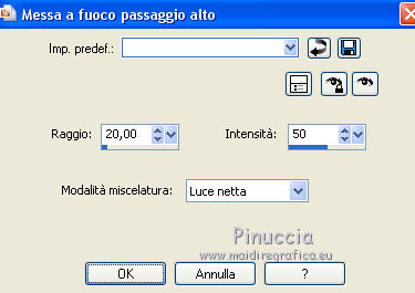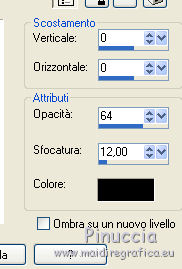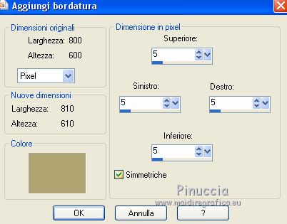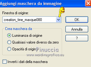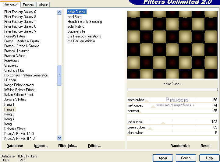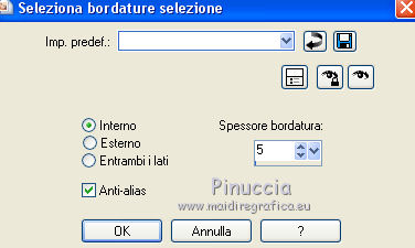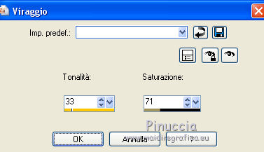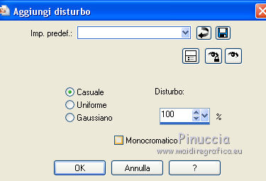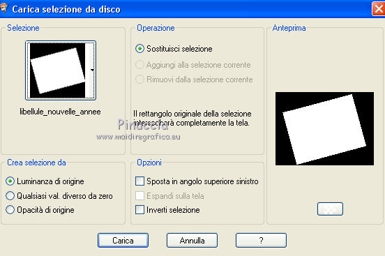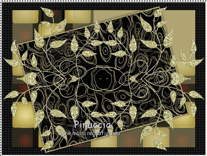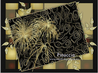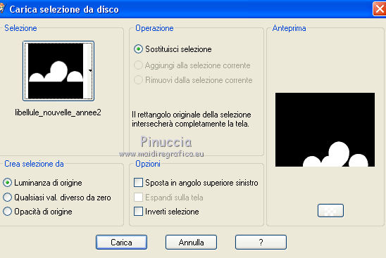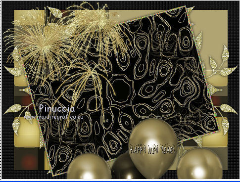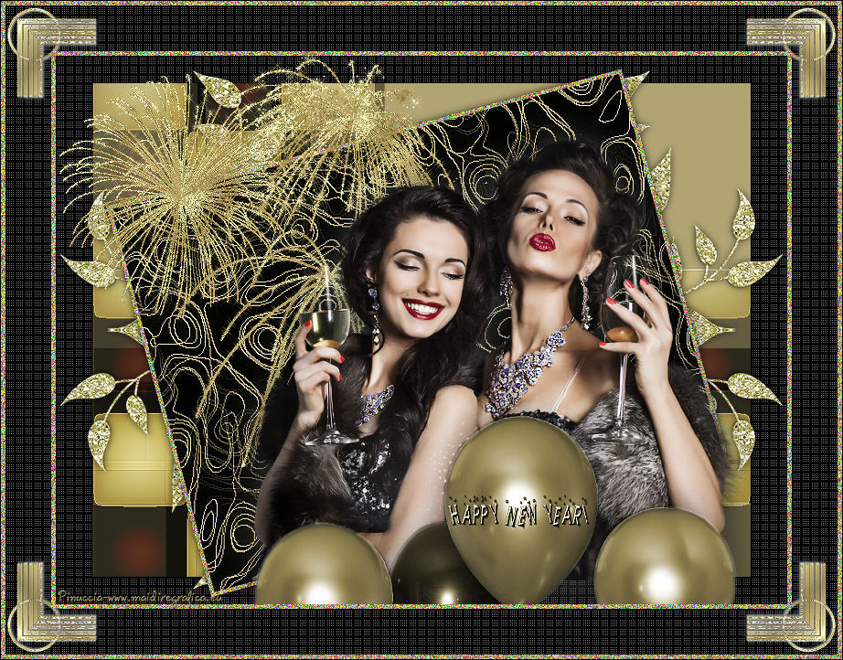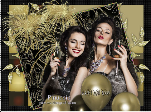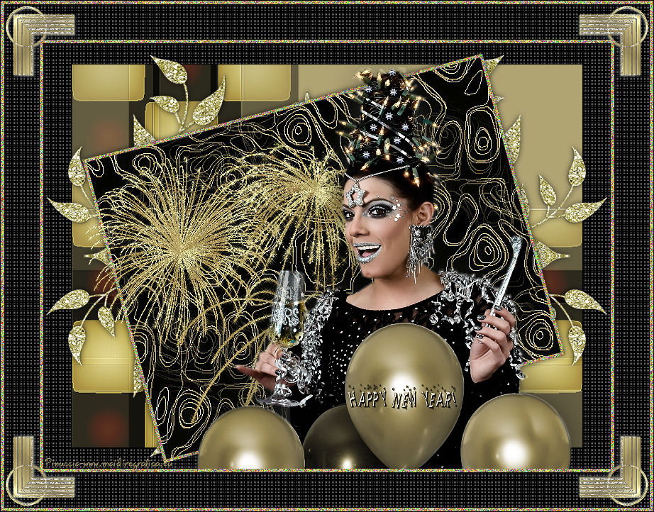 qui puoi trovare qualche risposta ai tuoi dubbi. Se l'argomento che ti interessa non è presente, ti prego di segnalarmelo. Questo tutorial è stato creato da Libellule con X12, ma può essere eseguito con tutte le versioni di PSP Dalla versione X4, il comando Immagine>Rifletti è stato sostituito con Immagine>Capovolgi in orizzontale, e il comando Immagine>Capovolgi con Immagine>Capovolgi in verticale. Nelle versioni X5 e X6, le funzioni sono state migliorate rendendo disponibile il menu Oggetti. Con la nuova versione X7, sono tornati i comandi Rifletti e Capovolgi, ma con nuove differenze. Vedi la scheda sull'argomento qui Per tradurre questo tutorial ho usato PSP X. Occorrente. Materiale qui Il tube della donna è di Guismo. La maschera è di Tine. Il resto del materiale è di Libellule. Filtri in caso di dubbi, ricorda di consultare la mia sezione filtri qui Penta.com - Dot and Cross qui Filters Unlimited 2.0 qui Kang 2 - qui Simple - Top Left Mirror qui I filtri Simple, Kang e Penta.com si possono usare da soli o importati in Filters Unlimited (come fare vedi qui) Se un filtro fornito appare con questa icona ![]() Metti le selezioni nella cartella Selezioni. Apri la maschera in PSP e minimizzala con il resto del materiale. 1. Imposta il colore di primo piano con b0a473, e il colore di sfondo con il colore nero #000000. ![]() Apri una nuova immagine trasparente 800 x 600 pixels, e riempila con il colore di primo piano.Livelli>Duplica. 2. Effetti>Plugins>Filters Unlimited 2.0 - Kang 2 - Color Cubes. Se usi un altro colore, dovrai probabilmente cambiare le impostazioni del filtro ![]() 3. Livelli>Nuovo livello maschera>Da immagine. Apri il menu sotto la finestra di origine e vedrai la lista dei files aperti. Seleziona la maschera masque_tine_masque080, con i seguenti settaggi. ![]() Livelli>Unisci>Unisci gruppo. Effetti>Effetti di bordo>Aumenta. 4. Cambia la modalità di miscelatura di questo livello in Luce netta, o secondo i tuoi colori. ![]() Livelli>Unisci>Unisci visibile. 5. Immagine>Ridimensiona, al 90%, tutti i livelli non selezionato. 6. Effetti>Effetti 3D>Sfalsa ombra. ![]() 7. Livelli>Nuovo livello raster. Riempi con il colore nero di sfondo.8. Effetti>Plugins>Penta.com - Dot and Cross, con i settaggi standard. ![]() Regola>Messa a fuoco>Metti a fuoco. Livelli>Disponi>Sposta giù. 9. Attiva il livello superiore. Livelli>Nuovo livello raster. 10. Selezione>Carica/Salva selezione>Carica selezione da disco. Cerca e carica la selezione libellule_nouvelle_annee. ![]() Apri la carta papier_nouvelle_annee.jpg, e vai a Modifica>Copia. Torna al tuo lavoro e vai a Modifica>Incolla nella selezione. Effetti>Effetti di bordo>Aumenta. 11. Selezione>Modifica>Seleziona bordature selezione. ![]() Riempi la selezione con il colore di primo piano.12. Regola>Aggiungi/Rimuovi disturbo>Aggiungi disturbo. ![]() Selezione>Deseleziona. 13. Effetti>Effetti 3D>Sfalsa ombra, con i settaggi precedenti. ![]() 14. Apri il tube JIT_flair.png, e vai a Modifica>Copia. Torna al tuo lavoro e vai a Modifica>Incolla come nuovo livello. Effetti>Effetti di immagine>Scostamento. ![]() 15. Effetti>Plugins>Simple - Top Left Mirror. Risultato: ![]() 16. Effetti>Effetti 3D>Sfalsa ombra, con i settaggi precedenti. ![]() Livelli>Disponi>Sposta giù. 17. Attiva il livello superiore. Apri il tube JIT_fireworks.png, e vai a Modifica>Copia. Torna al tuo lavoro e vai a Modifica>Incolla come nuovo livello. Regola>Messa a fuoco>Metti a fuoco. Spostalo a sinistra.![]() 18. Apri il tube calguisnewyear02122011.png, e vai a Modifica>Copia. Torna al tuo lavoro e vai a Modifica>Incolla come nuovo livello. Se stai usando il tube fornito: Effetti>Effetti di immagine>Scostamento. ![]() 19. Se stai usando il tube proposto: Selezione>Carica/Salva selezione>Carica selezione da disco. Cerca e carica la selezione libellule_nouvelle_annee2. ![]() se stai usando un altro tube e vuoi utilizzare i palloncini del tube fornito, prima di incollare il tuo tube, copia il tube fornito - punti 18 e 19. Dopo la selezione e prima del Viraggio: Selezione>Inverti. Premi sulla tastiera il tasto CANC ![]() Di nuovo Selezione>Inverti Regola>Tonalità e saturazione>Viraggio. ![]() Selezione>Deseleziona. Risultato. ![]() Copia e incolla il tuo tube e porta il livello sotto il livello dei palloncini. Attiva il livello superiore dei palloncini. Livelli>Unisci>Unisci giù. ![]() 20. Regola>Messa a fuoco>Messa a fuoco passaggio alto. ![]() 21. Selezione>Seleziona tutto. Immagine>Aggiungi bordatura, 5 pixels, simmetriche, con il colore di primo piano. ![]() Selezione>Inverti. 22. Regola>Aggiungi/Rimuovi disturbo>Aggiungi disturbo, con i settaggi precedenti. ![]() 23. Di nuovo Selezione>Seleziona tutto. Immagine>Aggiungi bordatura, 50 pixels, simmetriche, con il colore nero. Selezione>Inverti. 24. Effetti>Plugins>Penta.com - Dot and Cross, con i settaggi standard. ![]() Regola>Messa a fuoco>Metti a fuoco. 25. Mantieni selezionato. Apri il tube deco libellule_coins.png (Colorizza, se necessario). Modifica>Copia. Torna al tuo lavoro e vai a Modifica>Incolla nella selezione. 26. Ancora Selezione>Seleziona tutto. Immagine>Aggiungi bordatura, 5 pixels, simmetriche, con il colore di primo piano. Selezione>Inverti. 27. Regola>Aggiungi/Rimuovi disturbo>Aggiungi disturbo, con i settaggi precedenti. ![]() Selezione>Deseleziona. 28. Immagine>Aggiungi bordatura, 1 pixel, simmetriche, con il colore nero. 29. Firma il tuo lavoro. Livelli>Unisci>Unisci tutto e salva in formato jpg. Per questo esempio ho usato un tube di Maryse ![]() ![]() Se hai problemi o dubbi, o trovi un link non funzionante, o anche soltanto per un saluto, scrivimi. 24 Dicembre 2014 |
