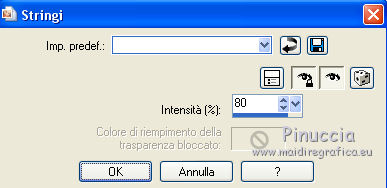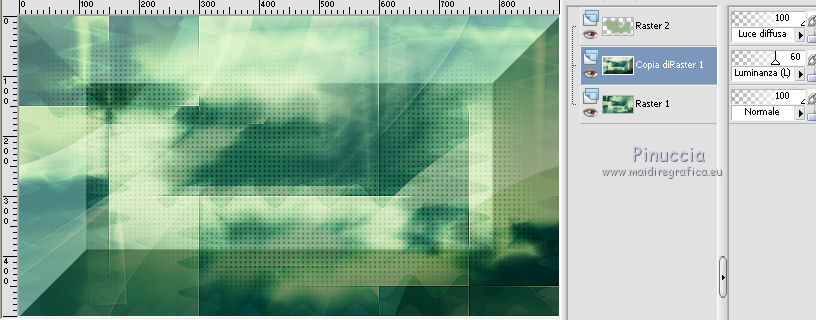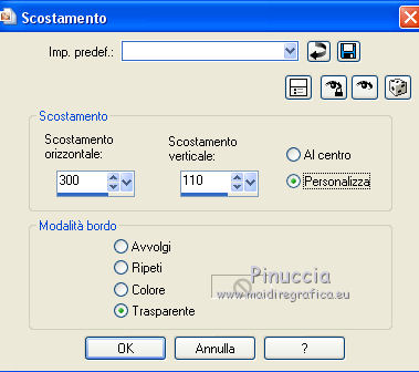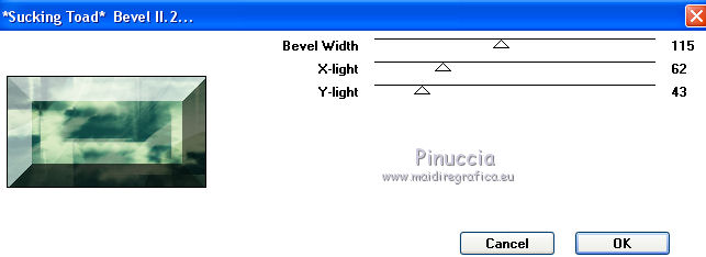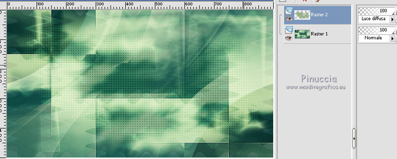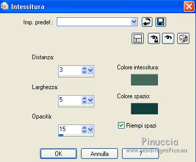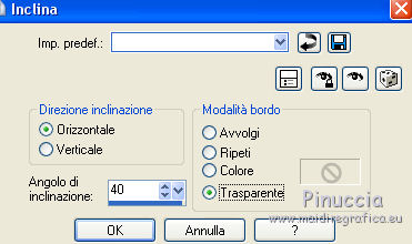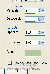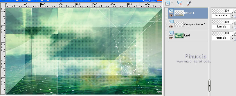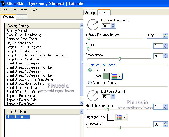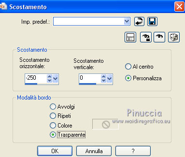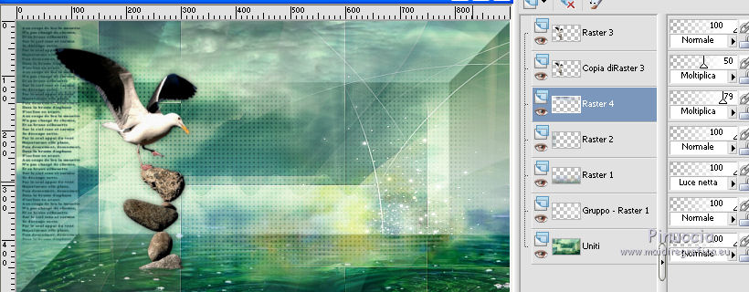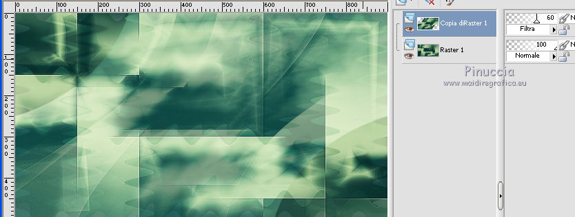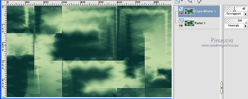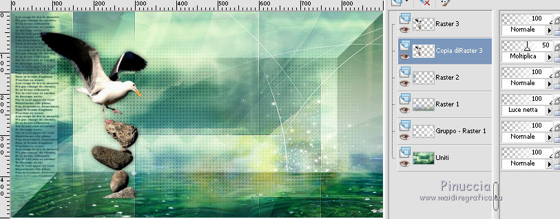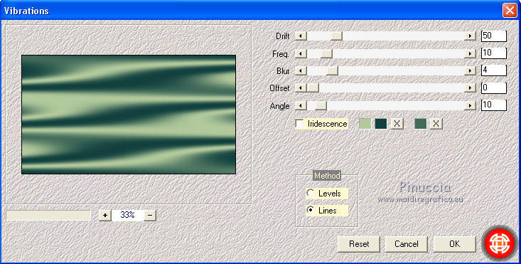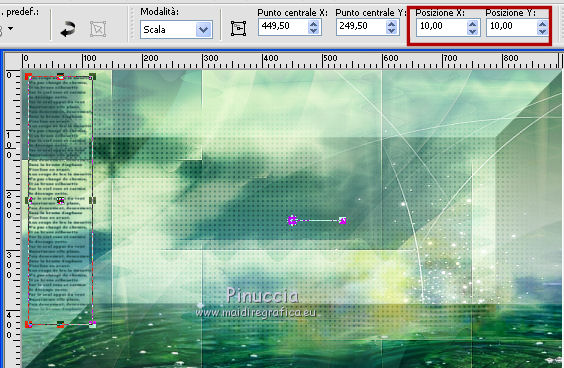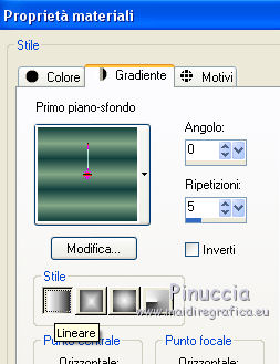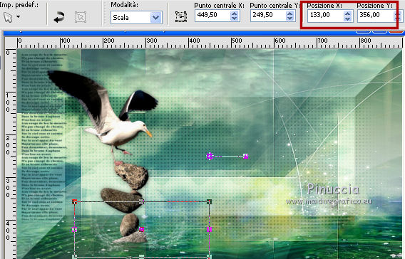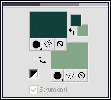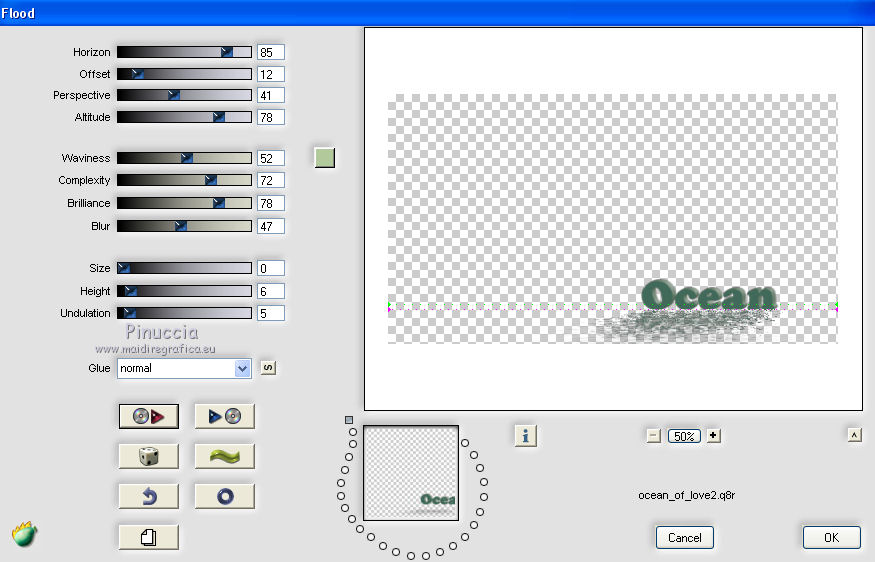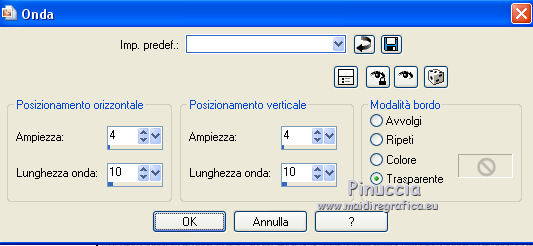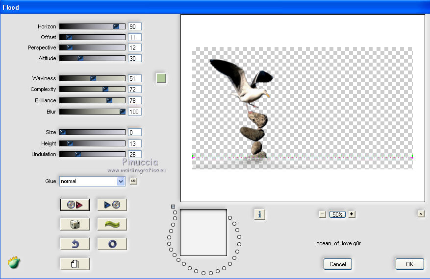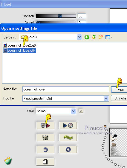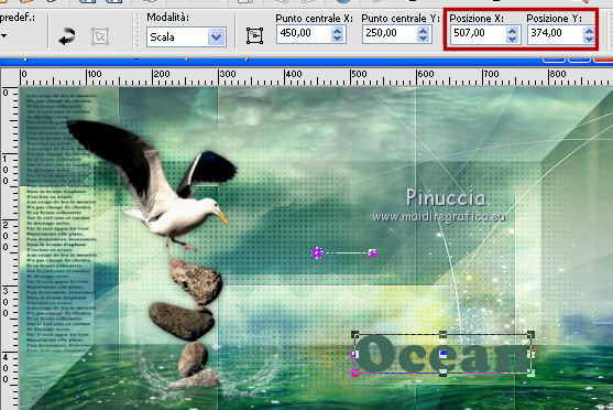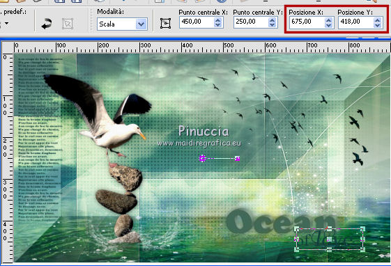 qui puoi trovare qualche risposta ai tuoi dubbi. Se l'argomento che ti interessa non è presente, ti prego di segnalarmelo. Questo tutorial è stato creato da Libellule con X19 e tradotto con CorelX e CorelX17, ma può essere eseguito con tutte le versioni di PSP Dalla versione X4, il comando Immagine>Rifletti è stato sostituito con Immagine>Capovolgi in orizzontale, e il comando Immagine>Capovolgi con Immagine>Capovolgi in verticale. Nelle versioni X5 e X6, le funzioni sono state migliorate rendendo disponibile il menu Oggetti. Con la nuova versione X7, sono tornati i comandi Rifletti e Capovolgi, ma con nuove differenze. Vedi la scheda sull'argomento qui Occorrente. Materiale qui I tubes sono di Libellule e Guismo Filtri in caso di dubbi, ricorda di consultare la mia sezione filtri qui Filters Unlimited 2.0 qui Mehdi - Vibrations, Sorting Tiles qui Toadies - Sucking Toad Bevel II.2 qui Flaming Pear - Flood qui Alien Skin Eye Candy 5 Impact - Extrude qui I filtri Toadies si possono usare da soli o importati in Filters Unlimited (come fare vedi qui) Se un filtro fornito appare con questa icona ![]() non esitare a cambiare modalità di miscelatura e opacità secondo i colori utilizzati. Nelle ultime versioni di PSP non c'è il gradiente di primo piano/sfondo (Corel_06_029) Puoi usare i gradienti delle versioni precedenti. Trovi qui i gradienti Corel X. Metti il preset Cliccando sul file una o due volte (a seconda delle tue impostazioni), automaticamente il preset si installerà nella cartella corretta. perchè uno o due clic vedi qui Se preferisci, puoi importare direttamente il preset nel corso del tutorial Come fare vedi la scheda del filtro Eye Candy qui Metti i preset per Flood in una cartella a scelta. Da questa cartella li importerai quando ti serviranno. Apri la maschera in PSP e minimizzala con il resto del materiale. Colori utilizzati ![]() 1. Imposta il colore di primo piano con il colore 1 #12403d e il colore di sfondo con il colore 3 #84a788. ![]() Passa il colore di primo piano a Gradiente di primo piano/sfondo, stile Lineare. ![]() 2. Apri canal_alpha_ocean_of_love.pspimage. Finestra>Duplica, o sulla tastiera maiuscola+D, per fare una copia. Chiudi l'originale. La copia, che sarà la base del tuo lavoro, non è vuota, ma contiene una selezione salvata sul canale alfa. 3. Riempi l'immagine trasparente con il gradiente.4. Regola>Sfocatura>Sfocatura gaussiana - raggio 15. ![]() 5. Effetti>Plugins>Mehdi - Vibrations colori 4 1 e 2 ![]() ![]() 6. Effetti>Plugins>Mehdi - Sorting Tiles. ![]() 7. Effetti>Effetti di bordo>Aumenta di più. 8. Livelli>Duplica. Effetti>Effetti di distorsione>Onda. ![]() 9. Cambia la modalità di miscelatura di questo livello in Sovrapponi, e abbassa l'opacità al 45%. ![]() 10. Livelli>Unisci>Unisci giù. Regola>Messa a fuoco>Metti a fuoco. 11. Livelli>Duplica. Effetti>Effetti geometrici>Inclina. ![]() 12. Effetti>Effetti di distorsione>Stringi (nelle versioni più recenti è diventato Compressione). ![]() 13. Cambia la modalità di miscelatura di questo livello in Filtra, e abbassa l'opacità al 60%. ![]() 14. Livelli>Unisci>Unisci giù. 15. Livelli>Nuovo livello raster. Selezione>Carica/Salva selezione>Carica selezione da canale alfa. La selezione sélection#1 è subito disponibile. Devi soltanto cliccare Carica. ![]() 16. Imposta il colore di primo piano con il colore 4 ![]() e riempi la selezione con questo colore.Selezione>Deseleziona. 17. Effetti>Effetti di trama>Intessitura colore intessitura: colore 2 ![]() colore spazio: colore 1 ![]() ![]() 18. Cambia la modalità di miscelatura di questo livello in Luce diffusa. ![]() 19. Attiva il livello di sfondo. Livelli>Duplica. 20. Effetti>Plugins>Toadies - Sucking Toad Bevel II.2, con i settaggi standard. ![]() 21. Cambia la modalità di miscelatura di questo livello in Luminanza (esistente), e abbassa l'opacità al 60%. ![]() 22. Livelli>Unisci>Unisci visibile. 23. Livelli>Nuovo livello raster. Imposta il colore di primo piano con il colore bianco Riempi il livello con il colore bianco.24. Livelli>Nuovo livello maschera>Da immagine. Apri il menu sotto la finestra di origine e vedrai la lista dei files aperti. Seleziona la maschera Narah_Mask_1159.jpg ![]() Effetti>Effetti di bordo>Aumenta di più. Livelli>Unisci>Unisci gruppo. 25. Immagine>Capovolgi. Effetti>Effetti di immagine>Scostamento. ![]() 26. Apri il tube ocean_decor1.png e vai a Modifica>Copia. Torna al tuo lavoro e vai a Modifica>Incolla come nuovo livello. 27. Oggetti>Allinea>Inferiore Se stai lavorando con una versione precedente che non dispone del menu Oggetti, attiva lo strumento Spostamento ![]() per spostare il tube in basso. 28. Cambia la modalità di miscelatura di questo livello in Luce netta. ![]() 29. Apri il testo ocean_texte1.png e vai a Modifica>Copia. Torna al tuo lavoro e vai a Modifica>Incolla come nuovo livello. 30. Tasto K per attivare lo strumento Puntatore ![]() o D per attivare lo strumento Deformazione ![]() e imposta Posizione X: 10,00 e Posizione Y: 10,00 ![]() Tasto M per deselezionare lo strumento. 31. Apri il tube libellulegraphisme_mouette.png, cancella il watermark, e vai a Modifica>Copia. Torna al tuo lavoro e vai a Modifica>Incolla come nuovo livello. Immagine>Ridimensiona, al 60%, dimensione ottimale, tutti i livelli non selezionato. Regola>Messa a fuoco>Metti a fuoco. 32. Effetti>Effetti di immagine>Scostamento. ![]() 33. Livelli>Duplica. Regola>Sfocatura>Sfocatura gaussiana - raggio 5. ![]() 34. Livelli>Disponi>Sposta giù. Cambia la modalità di miscelatura di questo livello in Moltiplica, e abbassa l'opacità al 50%. ![]() 34. Attiva il livello superiore. Effetti>Plugins>Flaming Pear - Flood clicca sul bottone rosso e cerca, nella cartella in cui lo hai salvato, il preset ocean_of_love.q8r ![]() Questi i settaggi, in caso di problemi con il preset colore 4 ![]() se usi un altro tube, regola Horizon in base al tuo tube ![]() 35. Ripeti il filtro una seconda volta. 36. Apri il tube ocean_decor3.png e vai 