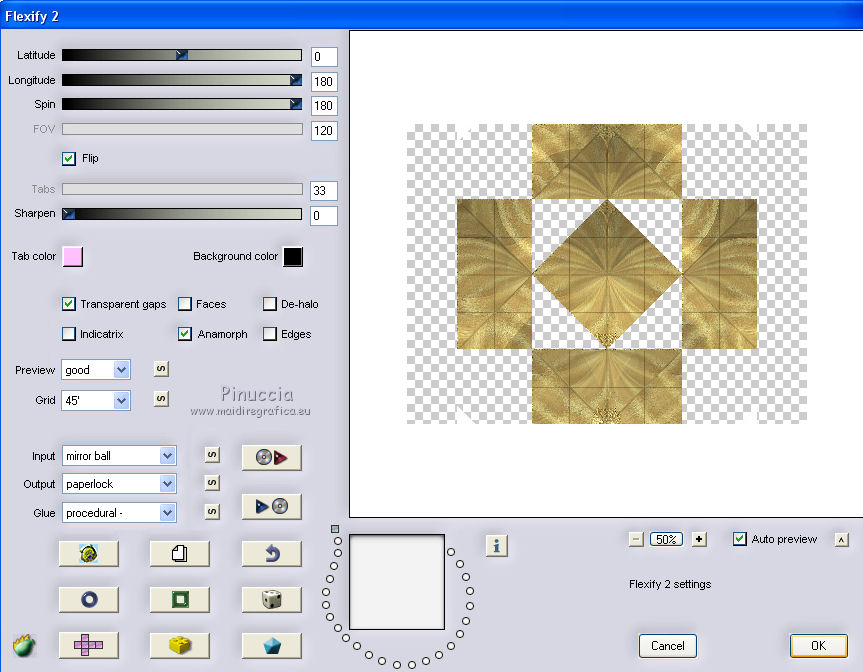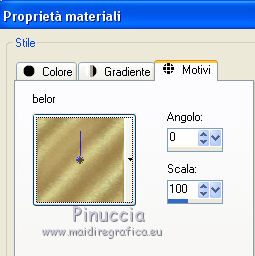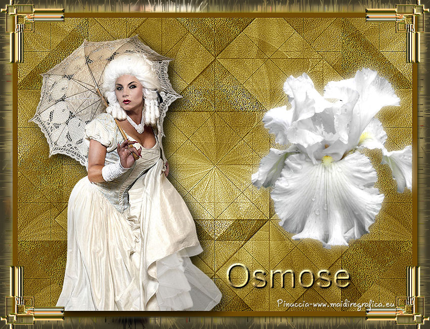 qui puoi trovare qualche risposta ai tuoi dubbi. Se l'argomento che ti interessa non è presente, ti prego di segnalarmelo. Questo tutorial è stato creato con PSP XII, ma può essere eseguito anche con le altre versioni di PSP. Dalla versione X4, il comando Immagine>Rifletti è stato sostituito con Immagine>Capovolgi in orizzontale, e il comando Immagine>Capovolgi con Immagine>Capovolgi in verticale. Nelle versioni X5 e X6, le funzioni sono state migliorate rendendo disponibile il menu Oggetti. Vedi la scheda sull'argomento qui Per tradurre questo tutorial ho usato PSP X. Occorrente. Materiale qui Il tube della donna è di Libellule. La maschera è di Narah. Filtri: se hai problemi con il filtri consulta la mia sezione filtri qui Flaming Pear - Flexify 2.0 qui Nik Software - Color Efex Pro qui ![]() Metti il preset Emboss 3 nella cartella Impostazioni predefinite. Metti il motivo oro Belor nella cartella Motivi. Se preferisci, puoi aprirlo in PSP e minimizzalo. Lo troverai nella lista dei motivi disponibili, quando ti servirà. Apri la maschera in PSP e minimizzala con il resto del materiale. 1. Imposta il colore di primo piano con #403a28. Apri una nuova immagine trasparente 800 x 600 pixels, e riempila con il colore di primo piano.Livelli>Nuovo livello raster. Passa il colore di sfondo a Motivi e seleziona il motivo Belor. ![]() Riempi il livello con il motivo oro (tasto destro del mouse).2. Livelli>Nuovo livello maschera>Da immagine. Apri il menu sotto la finestra di origine e vedrai la lista dei files aperti. Seleziona la maschera Narah_mask_0233, con i seguenti settaggi. ![]() Livelli>Unisci>Unisci gruppo. 3. Livelli>Duplica. Immagine>Rifletti. Livelli>Unisci>Unisci giù. Abbassa l'opacità di questo livello al 75%. 4. Effetti>Filtro definito dall'utente - seleziona il preset Emboss 3 e ok. ![]() Livelli>Unisci>Unisci visibile. 5. Livelli>Duplica. Effetti>Plugins>Flaming Pear - Flexify 2. ![]() 6. Attiva lo strumento Selezione a mano libera ![]() e seleziona i quatro triangolini ai lati. ![]() Premi sulla tastiera il tasto CANC ![]() Selezione>Deseleziona. Se preferisci puoi anche usare lo strumento Gomma ![]() Abbassa l'opacità di questo livello al 60%. Livelli>Duplica, e attiva il livello sottostante. Effetti>Effetti di imagine>Motivo unico, con i settaggi standard. ![]() Attiva nuovamente il livello superiore. Immagine>Ruota per gradi - 45 gradi a destra. ![]() Effetti>Effetti 3D>Sfalsa ombra. ![]() Ripeti l'Effetto Sfalsa ombra, cambiando verticale e orizzontale con -2. 6. Apri il tube "libellulegraphisme_femme3.png", e vai a Modifica>Copia. Torna al tuo lavoro e vai a Modifica>Incolla come nuovo livello. Immagine>Ridimensiona, al 65%, tutti i livelli non selezionato. Spostalo a sinistra.Effetti>Plugins>Nik Software - Color Efex Pro - Brilliance Warmth. ![]() 7. Livelli>Duplica, e attiva il livello sottostante dell'originale. Effetti>Effetti di distorsione>Vento - da destra, intensità 100. ![]() Attiva nuovamente il livello superiore. 8. Livelli>Nuovo livello raster. Riempi con il colore di primo piano #403a28 (o uno di tua scelta).Selezione>Seleziona tutto. Selezione>Modifica>Contrai - 10 pixels. Premi sulla tastiera il tasto CANC ![]() Selezione>Deseleziona. 9. Apri il tube fleur e vai a Modifica>Copia. Torna al tuo lavoro e vai a Modifica>Incolla come nuovo livello. Immagine>Ridimensiona, al 65%, tutti i livelli non selezionato. Spostalo a destra.Livelli>Duplica, e attiva il livello sottostante dell'originale. Regola>Sfocatura>Sfocatura gaussiana - raggio 10. Livelli>Unisci>Unisci tutto. Regola>Messa a fuoco>Metti a fuoco. Modifica>Copia. 10. Immagine>Aggiungi bordatura, 25 pixels, simmetriche, con il colore bianco. Attiva lo strumento Bacchetta magica ![]() e clicca nel bordo bianco per selezionalo. Selezione>Innalza selezione a livello. Modifica>Incolla nella selezione. Effetti>Effetti di trama>Manto. ![]() Selezione>Inverti. Effetti>Effetti 3D>Sfalsa ombra, colore nero. ![]() Ripeti l'Effetto Sfalsa ombra, cambiando verticale e orizzontale con -2. Selezione>Deseleziona. 11. Apri il tube coins.png e vai a Modifica>Copia. Torna al tuo lavoro e vai a Modifica>Incolla come nuovo livello. Lascialo come sta. Apri il tube osmose_texte.png e vai a Modifica>Copia. Torna al tuo lavoro e vai a Modifica>Incolla come nuovo livello. Spostalo in basso a destra.Livelli>Duplica, e attiva il livello sottostante dell'originale. Regola>Sfocatura>Sfocatura gaussiana - raggio 3. ![]() 12. Immagine>Aggiungi bordatura, 2 pixels, simmetriche, con il colore nero. Firma il tuo lavoro e salva in formato jpg. Per questo esempio ho usato tubes di Alies e Nikita. ![]() ![]() Se hai problemi o dubbi, o trovi un link non funzionante, o anche soltanto per un saluto, scrivimi. 11 Aprile 2014 |