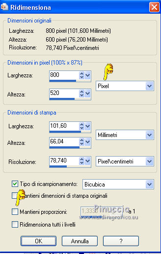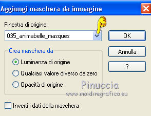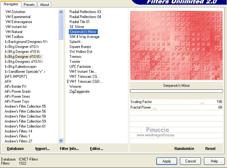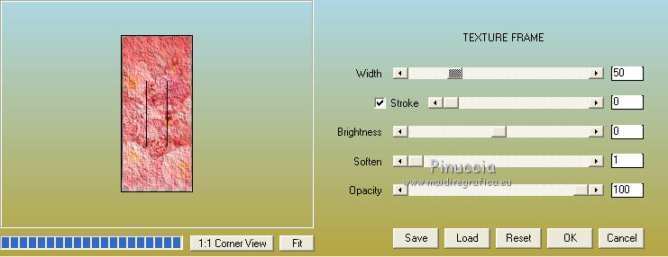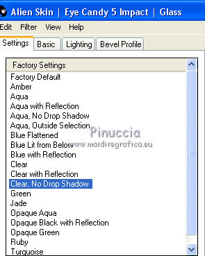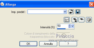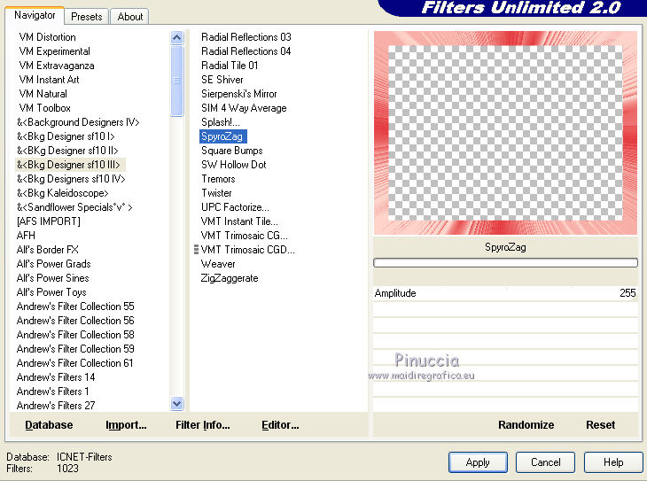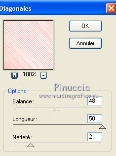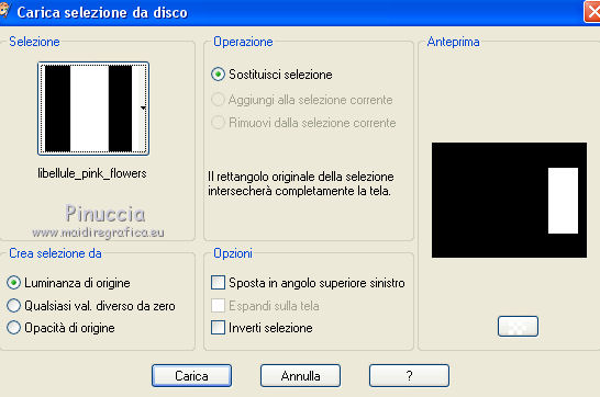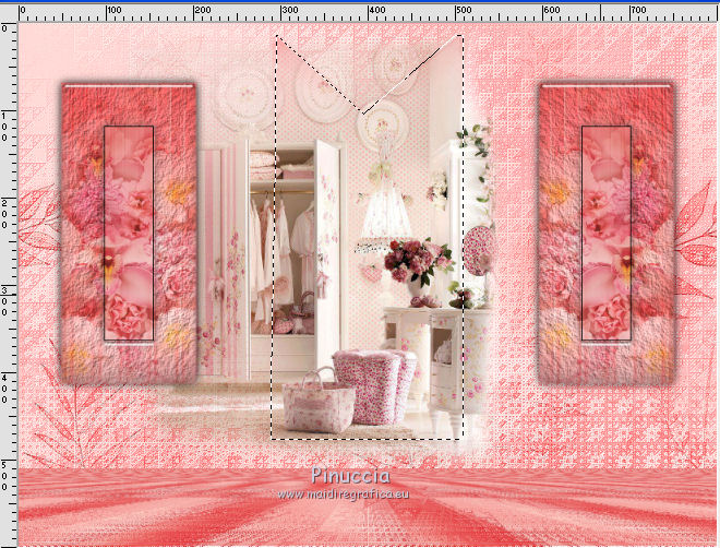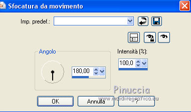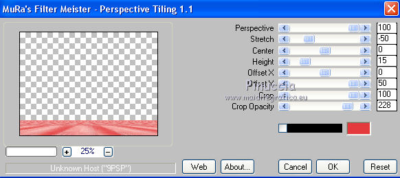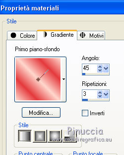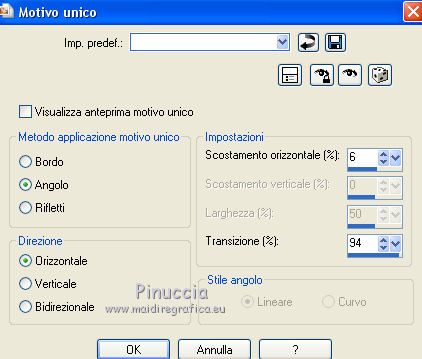 qui puoi trovare qualche risposta ai tuoi dubbi. Se l'argomento che ti interessa non è presente, ti prego di segnalarmelo. Questo tutorial è stato creato con PSP XII, ma può essere eseguito anche con le altre versioni di PSP. Dalla versione X4, il comando Immagine>Rifletti è stato sostituito con Immagine>Capovolgi in orizzontale, e il comando Immagine>Capovolgi con Immagine>Capovolgi in verticale. Nelle versioni X5 e X6, le funzioni sono state migliorate rendendo disponibile il menu Oggetti. Vedi la scheda sull'argomento qui Per tradurre questo tutorial ho usato PSP X. Occorrente. Materiale qui Il tube della donna è di Guismo. La maschera è di Animabelle. Il resto del materiale è di Libellule. Filtri: se hai problemi con il filtri consulta la mia sezione filtri qui Filters Unlimited 2.0 qui &<Bkg Designer sf10III> (da importare in Unlimited) qui AAA Frames - Texture Frame qui Alien Skin Eye Candy 5 Impact - Glass qui Contours - Diagonales qui Mura's Meister - Perspective Tiling qui ![]() Metti le selezioni nella cartella Selezioni. Apri la maschera in PSP e minimizzala con il resto del materiale. Colori utilizzati: #fed6cb, #e43a3e, #ffffff. ![]() 1. Imposta il colore di primo piano con #fed6cb, e il colore di sfondo con #e43a3e. ![]() Passa il colore di primo piano a Gradiente di primo piano/sfondo, stile Lineare. ![]() 2. Apri una nuova immagine trasparente 800 x 600 pixels, e riempila con il gradiente.3. Regola>Sfocatura>Sfocatura gaussiana - raggio 30. 4. Effetti>Plugins>Filters Unlimited 2.0 - &<Bkg Designer sf10III> - Sierpenski's Mirror, con i settaggi standard. ![]() Effetti>Effetti di bordo>Aumenta. 5. Selezione>Carica/Salva selezione>Carica selezione da disco. Cerca e carica la selezione libellule_pink_flowers. ![]() Selezione>Innalza selezione a livello. Regola>Sfocatura>Sfocatura da movimento. ![]() Mantieni selezionato. Livelli>Duplica. Di nuovo Regola>Sfocatura>Sfocatura da movimento, con i seguenti settaggi. ![]() Mantieni ancora selezionato. Livelli>Unisci>Unisci giù. 6. Apri il mist del fiore "libellulegraphisme_fleurs_rose.png". Immagine>Ruota a sinistra. Se stai usando PSP 9: Immagine>Ruota - 90 gradi in senso antiorario (l'altezza dell'immagine deve essere maggiore della larghezza). Immagine>Ridimensiona, al 30%. Modifica>Copia. Torna al tuo lavoro e vai a Modifica>Incolla come nuovo livello. Posiziona il tube nell'area selezionata.Selezione>Inverti. Premi sulla tastiera il tasto CANC ![]() Di nuovo Selezione>Inverti. Abbassa l'opacità di questo livello al 70%. Livelli>Unisci>Unisci giù. 7. Effetti>Plugins>AAA Frames - Texture Frame. ![]() 8. Selezione>Modifica>Seleziona bordature selezione. ![]() Effetti>Plugins>Alien Skin Eye Candy 5 Impact - Glass. Seleziona il preset Clear,NoDrop Shadow e ok. ![]() Selezione>Deseleziona. Effetti>Effetti 3D>Sfalsa ombra. ![]() Livelli>Duplica. Immagine>Rifletti. Livelli>Unisci>Unisci giù. Effetti>Effetti di immagine>Scostamento. ![]() 9. Attiva il livello di sfondo. Livelli>Duplica. Effetti>Plugins>Mura's Meister - Perspective Tiling. ![]() 10. Livelli>Nuovo livello raster. Imposta il colore di primo piano con il colore bianco #ffffff, e riempi il livello con questo colore.Livelli>Nuovo livello maschera>Da immagine. Apri il menu sotto la finestra di origine e vedrai la lista dei files aperti. Seleziona la maschera 035_animabelle_masques, con i seguenti settaggi. ![]() Livelli>Unisci>Unisci gruppo. Immagine>Ridimensiona, 800 x 520 pixels, mantieni proporzioni e tutti i livelli non selezionati. ![]() Livelli>Disponi>Sposta giù. Cambia la modalità di miscelatura di questo livello in Luminanza (esistente), e abbassa l'opacità al 60%. Effetti>Effetti di immagine>Motivo unico. ![]() per il mio esempio ho aggiunto: Effetti>Effetti di bordo>Aumenta Livelli>Unisci>Unisci giù. 11. Rimani posizionato sul livello di sfondo. Selezione>Carica/Salva selezione>Carica selezione da disco. Cerca e carica la selezione libellule_pink_flowers2. ![]() Selezione>Innalza selezione a livello. Effetti>Plugins>Contours - Diagonales. non preoccuparti se, scompattando il filtro trovi le denominazioni degli effetti in lingua inglese. Una volta inserita la cartella nei Percorsi files, li ritroverai in lingua francese. Vedi la scheda del filtro qui ![]() Selezione>Deseleziona. Livelli>Duplica. Immagine>Rifletti. Abbassa l'opacità di questo livello al 50%. Livelli>Unisci>Unisci giù. Selezione>Carica/Salva selezione>Carica selezione da disco. Carica nuovamente la selezione libellule_pink_flowers2. ![]() Effetti>Effetti di distorsione>Allarga (nelle versioni più recenti l'effetto è stato ridenominato Espansione). ![]() 12. Apri il mist libellulegraphisme_chambre_rose. Immagine>Ridimensiona, al 60%, tutti i livelli non selezionato, non dimenticare di rimettere la selezione a Mantieni proporzioni. ![]() Modifica>Copia. Torna al tuo lavoro e vai a Modifica>Incolla come nuovo livello. Posiziona il tube nell'area selezionata,in modo che i fiori siano visibili. ![]() Selezione>Inverti. Premi sulla tastiera il tasto CANC. Selezione>Deseleziona. Cambia la modalità di miscelatura di questo livello in Luce diffusa, o come preferisci. Se il tube nasconde troppo il lavoro sullo sfondo, abbassa l'opacità. 13. Apri il tube décor pink_flowers_deco.png, e vai a Modifica>Copia. Torna al tuo lavoro e vai a Modifica>Incolla come nuovo livello. Effetti>Effetti di immagine>Scostamento. ![]() Cambia la modalità di miscelatura di questo livello in Schiarisci. 14. Attiva il livello superiore. Apri il tube calguispinup23032012.pspimages, e vai a Modifica>Copia. Torna al tuo lavoro e vai a Modifica>Incolla come nuovo livello. Immagine>Ridimensiona, al 90%, tutti i livelli non selezionato. Spostalo in basso, come nel mio esempio.Livelli>Duplica. Regola>Sfocatura>Sfocatura gaussiana - raggio 20. ![]() Livelli>Disponi>Sposta giù. Attiva il livello superiore. Effetti>Effetti 3D>Sfalsa ombra, colore nero. ![]() 19. Immagine>Aggiungi bordatura, 2 pixels, simmetriche, con il 