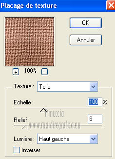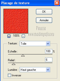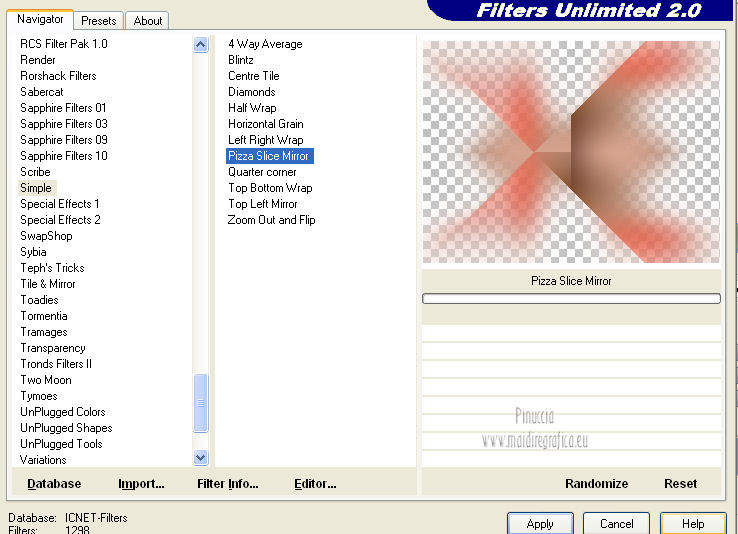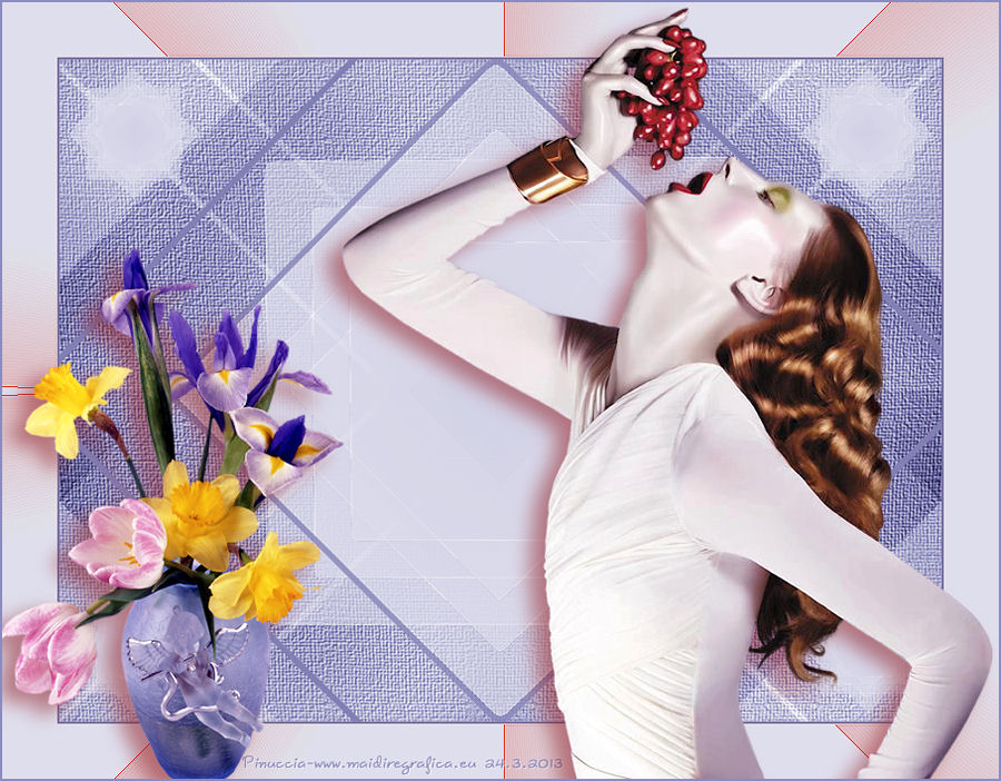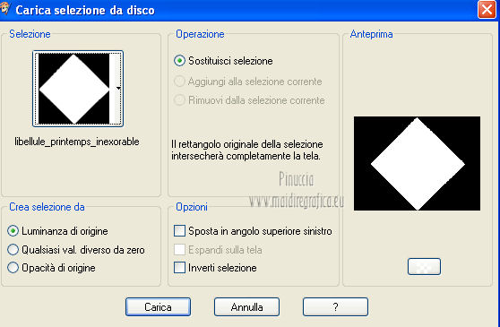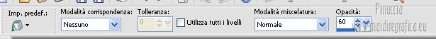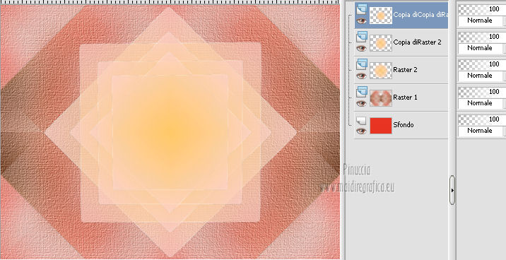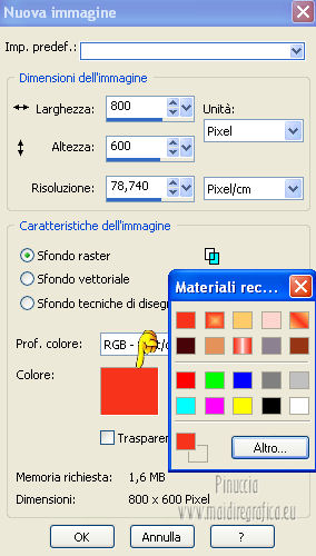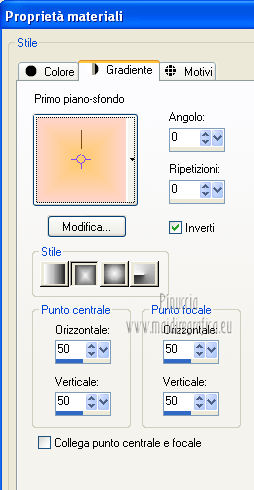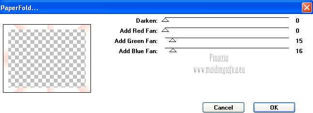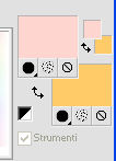 qui puoi trovare qualche risposta ai tuoi dubbi. Se l'argomento che ti interessa non è presente, ti prego di segnalarmelo. Questo tutorial è stato creato con PSP XII, ma può essere eseguito anche con le altre versioni di PSP. Per tradurlo ho usato PSP X. Occorrente. Materiale qui Il tube della donna è di LisaT. Il tube del fiore è di Guismo. Il resto del materiale è di Libellule. Filtri: Two Moon - PaperFold qui Simple - Pizza Slice Mirror qui Filters Unlimited 2.0 qui Textures qui I filtri Two Moon e Simple si possono usare da soli o importati in Filters Unlimited Metti il preset DropShadow_libellule1 nella cartella Impostazioni predefinite. Metti le selezioni nella cartella Selezioni. 1. Imposta il colore di primo piano con #f7331d. Apri una nuova immagine 800 x 600, sfondo colore #f7331d. togli la spunta a trasparente e clicca con il tasto destro del mouse sulla paletta del colore. Avrai la tabellina dei colori recenti. In basso a sinistra trovi sempre i colori e/o gradienti impostati nella tua paletta dei materiali. Gli ultimi due colori della tabella sono sempre il nero e il bianco. Per impostare il colore dello sfondo, clicca sulla palettina corrispondente. Puoi impostare il colore anche cliccando con il tasto sinistro del mouse sulla paletta del colore, e scrivere il codice relativo al colore. ![]() Effetti>Plugins>Textures - Placage de Textures. ![]() Livelli>Nuovo livello raster. Selezione>Seleziona tutto. Apri il tube femmes_0171_lisat.png e vai a Modifica>Copia. non chiuderlo perchè ti servirà ancora Torna al tuo lavoro e vai a Modifica>Incolla nella selezione. Selezione>Deseleziona. Regola>Sfocatura>Sfocatura gaussiana - raggio 50. ![]() 3. Effetti>Plugins>Filters Unlimited 2.0 - Simple - Pizza Slice Mirror. ![]() Effetti>Effetti di bordo>Aumenta. naturalmente, se stai usando un altro tube, il tuo risultato sarà differente 4. Livelli>Duplica. Immagine>Rifletti. Abbassa l'opacità di questo livello al 50%. Livelli>Unisci>Unisci giù. 5. Effetti>Plugins>Textures - Placage de textures, con i settaggi precedenti. ![]() Livelli>Duplica. Effetti>Effetti di immagine>Scostamento. ![]() Livelli>Duplica. Immagine>Rifletti. Livelli>Unisci>Unisci giù - 2 volte. 6. Livelli>Nuovo livello raster. Selezione>Carica/Salva selezione>Carica selezione da disco. Cerca e carica la selezione libellule_printemps_inexorable. ![]() Imposta il colore di primo piano con #fed5cf, e il colore di sfondo con #ffca68. ![]() Passa il colore di primo piano a Gradiente, con i seguenti settaggi. ![]() Imposta l'opacità dello strumento al 60%. ![]() Riempi la selezione con il gradiente.Selezione>Deseleziona. Effetti>Effetti di bordo>Aumenta. 7. Livelli>Duplica. Immagine>Ruota per gradi - 45 gradi a sinistra. ![]() Livelli>Unisci>Unisci giù. 8. Livelli>Duplica. Immagine>Ridimensiona, all'80%, tutti i livelli non selezionato. Di nuovo Livelli>Duplica. Immagine>Ridimensiona, all'80%, tutti i livelli non selezionato. Dovresti avere questo. ![]() 9. Livelli>Unisci>Unisci giù - 2 volte. Livelli>Duplica. Immagine>Ridimensiona, al 20%, tutti i livelli non selezionato. Effetti>Effetti di immagine>Scostamento. ![]() Livelli>Duplica. Immagine>Rifletti. Livelli>Unisci>Unisci giù. Livelli>Duplica. Immagine>Capovolgi. Livelli>Unisci>Unisci giù. 10. Livelli>Nuovo livello raster. Selezione>Carica/Salva selezione>Carica selezione da disco. Cerca e carica la selezione libellule_printemps_inexorable2. ![]() Imposta il colore di primo piano con #f7331d. Riporta l'opacità dello strumento a 100, e riempi la selezione con questo colore.Selezione>Deseleziona. Livelli>Disponi>Sposta giù. 11. Livelli>Duplica. Effetti>Effetti di immagine>Motivo unico. ![]() Cambia la modalità di miscelatura di questo livello in Indebolisci, o secondo i tuoi colori. Livelli>Disponi>Sposta giù. 12. Immagine>Aggiungi bordatura, 2 pixels, simmetriche, con il colore rosso. Immagine>Aggiungi bordatura, 50 pixels, simmetriche, con il colore rosa. Attiva lo strumento Bacchetta magica , sfumatura e tolleranza 0![]() e clicca nel bordo da 50 pixels per selezionarlo. Selezione>Innalza selezione a livello. Effetti>Plugins>Two moon - PaperFold, con i settaggi standard. ![]() Cambia la modalità di miscelatura di questo livello in Moltiplica, o secondo i tuoi colori. Effetti>Effetti di bordo>Aumenta - 2 volte. Selezione>Deseleziona. 14. Attiva nuovamente il tube femmes_0171_lisat e vai a Modifica>Copia. Torna al tuo lavoro e vai a Modifica>Incolla come nuovo livello. Immagine>Ridimensiona, all'80%, tutti i livelli non selezionato. Spostalo a destra.Effetti>Effetti 3D>Sfalsa ombra, apri il menu delle impostazioni e seleziona il preset Libellule_1, se stai usando altri colori, cambia il colore dell'ombra secondo i tuoi colori Cambia il colore dell'ombra, secondo i tuoi colori. ![]() 15. Attiva il livello superiore. Apri il tube calguispoisdesenteur23032012.pspimages e vai a Modifica>Copia. Torna al tuo lavoro e vai a Modifica>Incolla come nuovo livello. Spostalo a sinistra.Effetti>Effetti 3D>Sfalsa ombra, con i settaggi precedenti. 16. Immagine>Aggiungi bordatura, 2 pixels, simmetriche, con il colore rosso #f7331d. 17. Firma il tuo lavoro. Regola>Messa a fuoco>Metti a fuoco. 18. Immagine>Ridimensiona, a 800 pixels di larghezza, o come preferisci, tutti i livelli selezionato. Salva in formato jpg. Per questi esempi ho usato tubes di JHanna e Anna.br ![]() Mary ![]() ![]() Se hai problemi o dubbi, o trovi un link non funzionante, o anche soltanto per un saluto, scrivimi. 25 marzo 2013 |