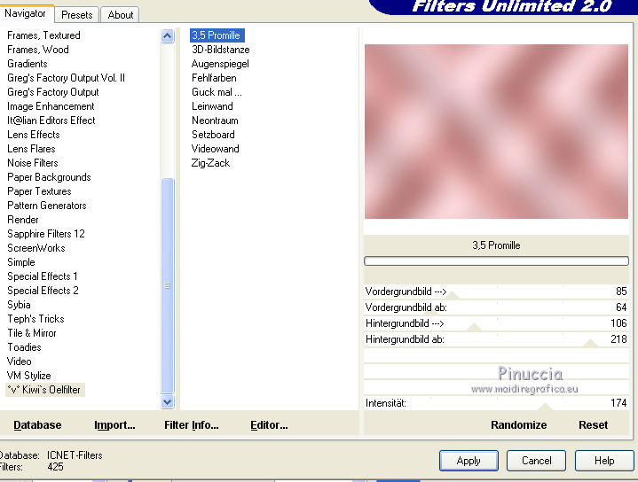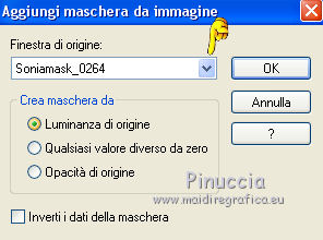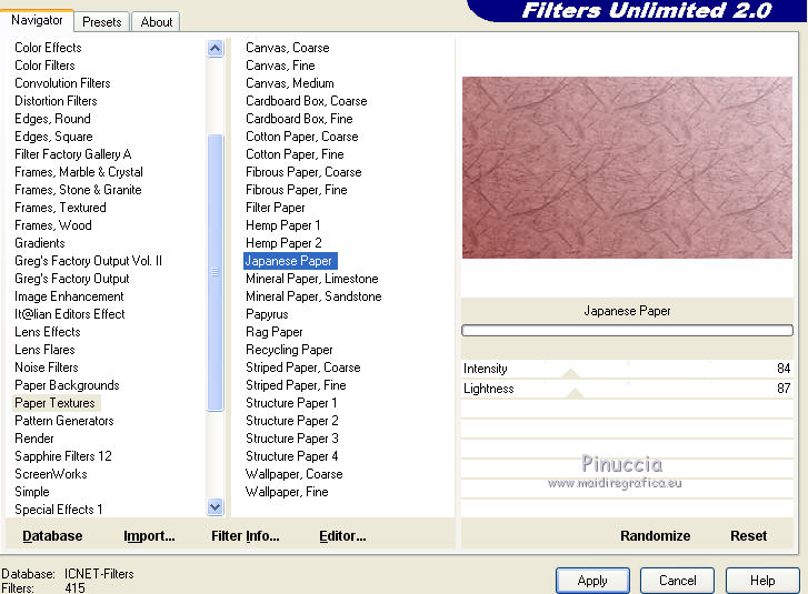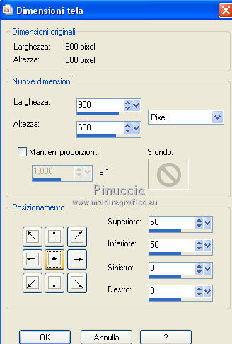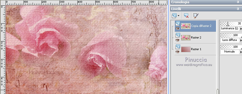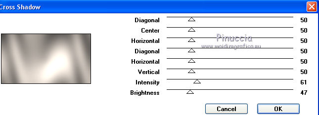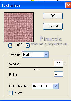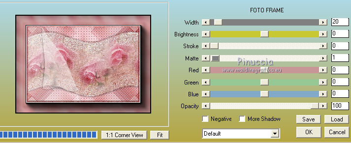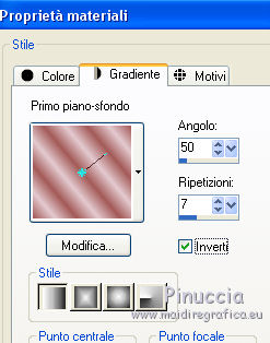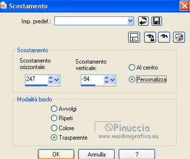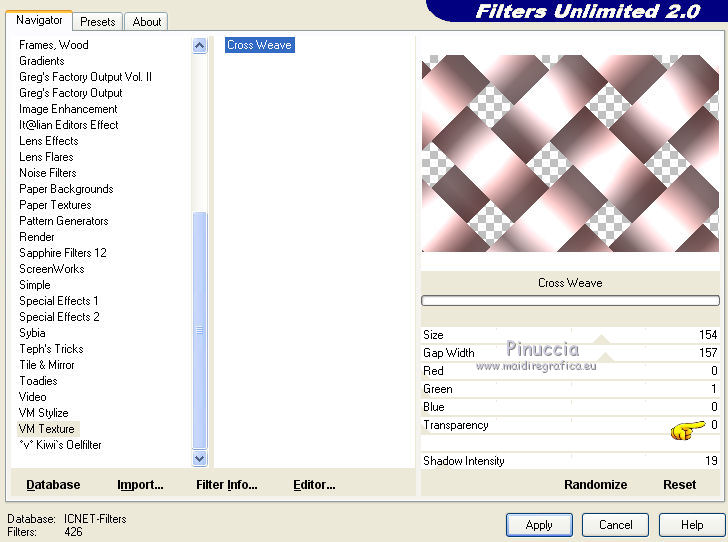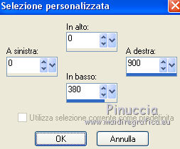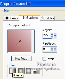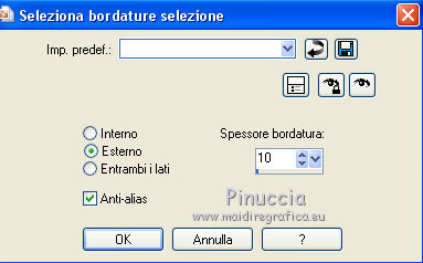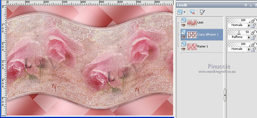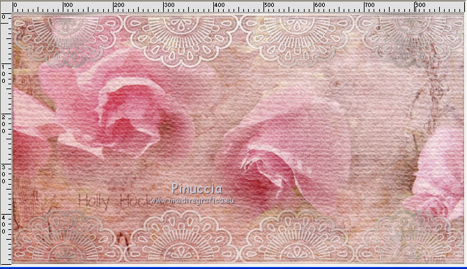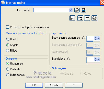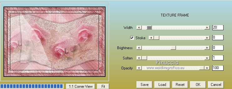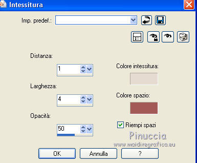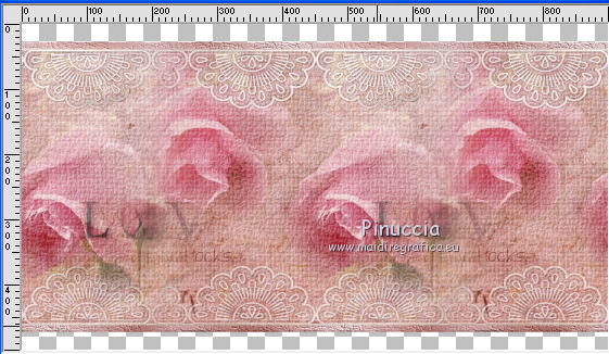 qui puoi trovare qualche risposta ai tuoi dubbi. Se l'argomento che ti interessa non è presente, ti prego di segnalarmelo. Questo tutorial è stato creato da Libellule con X17 e tradotto con CorelX, ma può essere eseguito con tutte le versioni di PSP Dalla versione X4, il comando Immagine>Rifletti è stato sostituito con Immagine>Capovolgi in orizzontale, e il comando Immagine>Capovolgi con Immagine>Capovolgi in verticale. Nelle versioni X5 e X6, le funzioni sono state migliorate rendendo disponibile il menu Oggetti. Con la nuova versione X7, sono tornati i comandi Rifletti e Capovolgi, ma con nuove differenze. Vedi la scheda sull'argomento qui Occorrente. Materiale qui Filtri in caso di dubbi, ricorda di consultare la mia sezione filtri qui Filters Unlimited 2.0 qui Kiwi Oelfilter - 3,5 Promille qui VM Texture - Cross Weave qui Texture - Texturizer qui Graphics Plus - Cross Shadow qui Simple - Top Left Mirror, Centre Tile, 4 Way Average qui AAA Frames - Foto Frame, Texture Frame qui Mura's Meister - Cloud qui I filtri Simple, Graphics Plus, Kiwi e VM Texture si possono usare da soli o importati in Filters Unlimited (come fare vedi qui) Se un filtro fornito appare con questa icona ![]() non esitare a cambiare modalità di miscelatura e opacità secondo i colori utilizzati. Nelle ultime versioni di PSP non c'è il gradiente di primo piano/sfondo (Corel_06_029) Puoi usare i gradienti delle versioni precedenti. Trovi qui i gradienti Corel X. Apri la maschera in PSP e minimizzala con il resto del materiale. Colori utilizzati ![]() 1. Imposta il colore di primo piano con il colore 1 #e3cad0, e il colore di sfondo con il colore 2 #a35a57. ![]() Passa il colore di primo piano a Gradiente di primo piano/sfondo, stile Lineare. ![]() 2. Apri una nuova immagine trasparente 900 x 500 pixels, e riempila con il gradiente.3. Effetti>Plugins>Filters Unlimited 2.0 - Paper Textures - Japanese Paper, con i settaggi standard. ![]() 4. Effetti>Plugins>Texture - Texturizer. ![]() 5. Selezione>Seleziona tutto. Livelli>Nuovo livello raster. 6. Apri l'immagine rose.jpg e vai a Modifica>Copia. Torna al tuo lavoro e vai a Modifica>Incolla nella selezione. Selezione>Deseleziona. 7. Cambia la modalità di miscelatura di questo livello in Luce diffusa. 8. Livelli>Duplica. Cambia la modalità di miscelatura di questo livello in Luminanza (esistente), e abbassa l'opacità al 35%. ![]() 9. Livelli>Unisci>Unisci visibile. 10. Livelli>Nuovo livello raster. Imposta il colore di primo piano con il colore 3 ![]() Riempi il livello con il colore di primo piano.11. Effetti>Plugins>Graphics Plus - Cross Shadow. ![]() 12. Livelli>Nuovo livello maschera>Da immagine. Apri il menu sotto la finestra di origine e vedrai la lista dei files aperti. Seleziona la maschera Soniamask-0264. ![]() Livelli>Unisci>Unisci gruppo. 13. Attiva lo strumento Selezione ![]() (non importa il tipo di selezione impostato, perchè con la selezione personalizzata si ottiene sempre un rettangolo) clicca sull'icona Selezione personalizzata ![]() e imposta i seguenti settaggi. ![]() 14. Premi sulla tastiera il tasto CANC ![]() Selezione>Deseleziona. 15. Effetti>Effetti di bordo>Aumenta. 16. Abbassa l'opacità di questo livello all'80%. 17. Effetti>Effetti di immagine>Scostamento. ![]() 18. Livelli>Duplica. Immagine>Capovolgi. Livelli>Unisci>Unisci giù. 19. Effetti>Effetti 3D>Sfalsa ombra, colore 4 #402a31 .![]() 20. Risultato. ![]() 21. Apri il mist Misted_Love_Letter_Pink_Rose_RM.png e vai a Modifica>Copia. Torna al tuo lavoro e vai a Modifica>Incolla come nuovo livello. 22. Immagine>Ridimensiona, all'85%, dimensione ottimale, tutti i livelli non selezionato. 23. Cambia la modalità di miscelatura di questo livello in Moltiplica, e abbassa l'opacità al 59%. ![]() 24. Effetti>Effetti di immagine>Scostamento. ![]() 25. Livelli>Unisci>Unisci visibile. 26. Immagine>Ridimensiona, all'85%, bicubica, tutti i livelli non selezionato. 27.Imposta nuovamente il colore di primo piano con il colore 1 #e3cad0 (il colore di sfondo è sempre il colore 2 #a35a57. ![]() 28. Passa il colore di primo piano a Gradiente di primo piano/sfondo, stile Lineare. ![]() 29. Selezione>Seleziona tutto. Selezione>Mobile. Selezione>Immobilizza. 30. Selezione>Modifica>Seleziona bordature selezione. ![]() 31. Riempi la selezione con il gradiente.Mantieni selezionato (non è necessario aggiungere un nuovo livello). 32. Effetti>Effetti di trama>Nappa. ![]() 33. Selezione>Deseleziona. 34. Effetti>Effetti di immagine>Motivo unico. ![]() Avrai questo ![]() 35. Immagine>Dimensioni tela - 900 x 600 pixels. ![]() 36. Effetti>Effetti di distorsione>Onda. ![]() 37. Effetti>Effetti 3D>Sfalsa ombra, colore nero. ![]() 38. Livelli>Nuovo livello raster. Livelli>Disponi>Sposta giù. Riempi il livello con il gradiente.39. Regola>Sfocatura>Sfocatura gaussiana - raggio 50. ![]() 40. Effetti>Plugins>Filters Unlimited 2.0 - °v° Kiwi's Oelfilter - 3,5 Promille. ![]() 41. Livelli>Duplica. 42. Effetti>Plugins>Filters Unlimited 2.0 - VM Texture - Cross Weave. ![]() 43. Effetti>Effetti di bordo>Aumenta. Effetti>Effetti di bordo>Aumenta di più. 44. Cambia la modalità di miscelatura di questo livello in Rafforza, e abbassa l'opacità al 50%. ![]() 45. Attiva il livello di sfondo, Raster 1. 46. Effetti>Effetti di trama>Intessitura. Colore intessitura: colore 3 #e5dbd1 Colore spazio: colore 3 (colore di sfondo) #a35a57 ![]() 47. Attiva il livello soprastante, Copia di Raster 1. Livelli>Unisci>Unisci giù. 48. Effetti>Plugins>Simple - Top Left Mirror. ![]() 49. Regola>Messa a fuoco>Metti a fuoco. 50. Attiva il livello superiore. Apri il tube rose_decor1.png Edition, e vai a Modifica>Copia. Torna al tuo lavoro e vai a Modifica>Incolla come nuovo livello. 51. Effetti>Effetti di immagine>Scostamento. ![]() 52. Immagine>Aggiungi bordatura, 1 pixel, simmetriche, colore 4 #402a31 ![]() 53. Selezione>Seleziona tutto. Immagine>Aggiungi bordatura, 10 pixels, simmetriche, colore di sfondo (colore 2 )Selezione>Inverti. 54. 