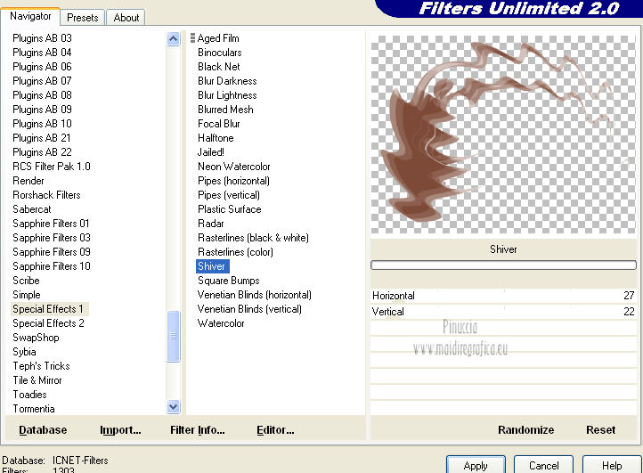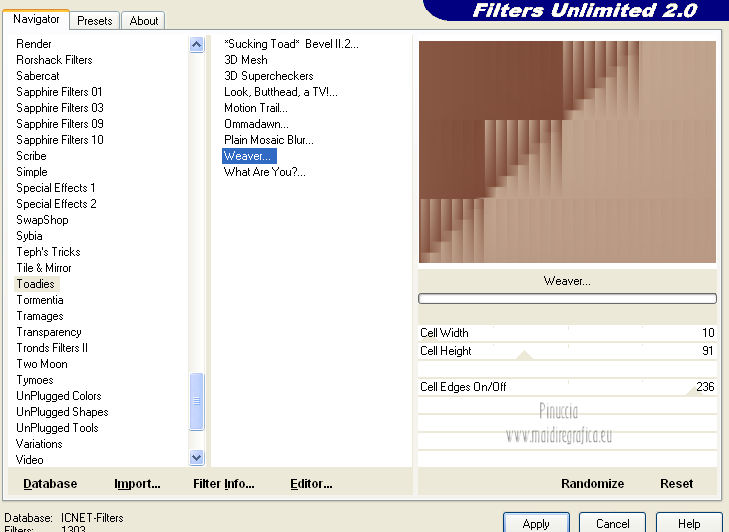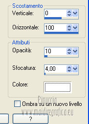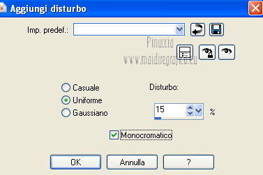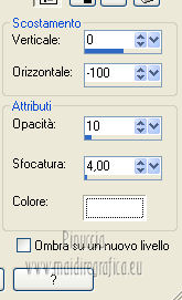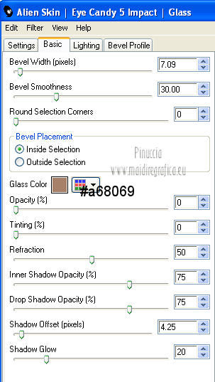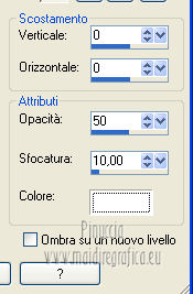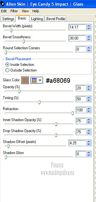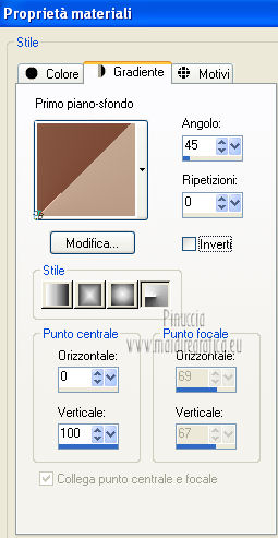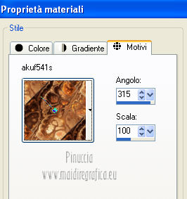 qui puoi trovare qualche risposta ai tuoi dubbi. Se l'argomento che ti interessa non è presente, ti prego di segnalarmelo. Questo tutorial è stato creato con PSP XII, ma può essere eseguito anche con le altre versioni di PSP. Per tradurlo ho usato PSP X. Occorrente. Materiale qui Il tube della donna è di Guismo. I tubes dell'uccello e dei fiori sono di Priss Designs La maschera è di Nikita. La cornice di pizzo è di Cajoline Scrap Il resto del materiale è di Libellule. Filtri: Toadies qui Alien Skin Eye Candy 5 Impact - Glass qui Filters Unlimited 2.0 qui I filtri Toadies si possono usare da soli o importati in Filters Unlimited Metti le selezioni nella cartella Selezioni. Apri la maschera in PSP e minimizzala con il resto del materiale. Colori utilizzati. ![]() 1. Imposta il colore di primo piano con #c3a791, e il colore di sfondo con #7d4a37. ![]() Passa il colore di primo piano a Gradiente, con i seguenti settaggi. ![]() 2. Apri una nuova immagine 800 x 600 pixels, e riempila con il gradiente.3. Effetti>Plugins>Filters Unlimited 2.0 - Toadies - Weaver. ![]() Livelli>Duplica. Immagine>Rifletti. Abbassa l'opacità di questo livello al 50%. Livelli>Unisci>Unisci giù. Ancora Livelli>Duplica. Immagine>Capovolgi. Abbassa l'opacità di questo livello al 50%. Cambia la modalità di miscelatura di questo livello in Luminanza (soltanto il lato destro si mette in luminanza). ![]() Livelli>Unisci>Unisci visibile. 4. Livelli>Duplica. Immagine>Ruota per gradi - 90 gradi a sinistra. ![]() 5. Immagine>Ridimensiona, a 600 pixels di larghezza, tutti i livelli non selezionato. ![]() 6. Effetti>Effetti 3D>Sfalsa ombra, con il colore bianco. ![]() Ripeti l'Effetto Sfalsa ombra in positivo. ![]() 7. Effetti>Plugins>Filters Unlimited 2.0 - Toadies - Ommadawn. ![]() 8. Premi il tasto K per attivare lo strumento Puntatore ![]() se stai usando PSP 9 il tasto D (valido per tutte le versioni) per attivare lo strumento Deformazione ![]() In modalità Scala spingi il nodo centrale sinistro fino a 150 pixels, e il nodo centrale destro fino a 650 pixels. ![]() 9. Livelli>Duplica - 2 volte, e attiva il livello della prima copia. ![]() 10. Effetti>Effetti di distorsione>Vento - da destra, intensità 100. ![]() Ripeti l'Effetto Vento da sinistra. ![]() 11. Attiva il livello superiore. Effetti>Effetti geometrici>Sfera. ![]() Abbassa l'opacità di questo livello al 65%. 12. Livelli>Nuovo livello raster. Riempi con il colore di sfondo #7d4a37.Livelli>Nuovo livello maschera>Da immagine. Apri il menu sotto la finestra di origine e vedrai la lista dei files aperti. Seleziona la maschera 1250181756_nikita_masques, con i seguenti settaggi. ![]() Livelli>Unisci>Unisci gruppo. 13. Immagine>Capovolgi. Effetti>Effetti di distorsione>Increspa. ![]() 14. Effetti>Plugins>Filters Unlimited 2.0 - Special Effects 1 - Shiver. ![]() Regola>Aggiungi/Rimuovi disturbo>Aggiungi disturbo. ![]() Effetti>Effetti di immagine>Scostamento. ![]() Livelli>Duplica. Immagine>Rifletti. Cambia la modalità di miscelatura di questo livello in Luminanza (esistente). (soltanto il lato destro si mette in luminanza). ![]() 15. Livelli>Nuovo livello raster. Selezione>Seleziona tutto. Apri la cornice cajoline_lacestuff_03 e vai a Modifica>Copia. Torna al tuo lavoro e vai a Modifica>Incolla nella selezione. Selezione>Deseleziona. Cambia la modalità di miscelatura di questo livello in Luce diffusa. 16. Quadri con fiori e uccello Livelli>Nuovo livello raster. Selezione>Carica/Salva selezione>Carica selezione da disco. Cerca e carica la selezione libellule_severine. ![]() Imposta il colore di sfondo con il colore verde #706f51. Imposta l'opacità dello strumento Riempimento a 50 ![]() Riempi la selezione con il colore verde.Selezione>Modifica>Seleziona bordature selezione. ![]() 17. Apri il frattale "akuf541s" e minimizzalo. Passa il colore di primo piano a Motivo, cerca il frattale nella categoria Immagini aperte, e selezionalo con i seguenti settaggi. ![]() Livelli>Nuovo livello raster. Riporta l'opacità dello strumento Riempimeno a 100, e riempi la selezione con il motivo.Effetti>Plugins>Alien Skin Eye Candy 5 Impact - Glass. ![]() Selezione>Deseleziona. 18. Apri il tube priss_haiky_el90. Attiva lo strumento Selezione a mano libera , da punto a punto,sfumatura e tolleranza 0, e seleziona il fiore ![]() Modifica>Copia. Torna al tuo lavoro e vai a Modifica>Incolla come nuovo livello. Immagine>Ridimensiona, al 10%, tutti i livelli non selezionato. Posiziona i fiori nel quadro di destra.19. Attiva il livello della cornice. Attiva lo strumento Bacchetta magica , sfumatura e tolleranza 0,antialias non selezionato. ![]() e clicca all'interno del quadro per selezionarlo. Selezione>Modifica>Espandi - 10 pixels. ![]() Selezione>Inverti. Attiva nuovamente il livello dei fiori. Premi sulla tastiera il tasto CANC ![]() Selezione>Deseleziona. Livelli>Duplica. Immagine>Rifletti. Livelli>Unisci>Unisci giù. Regola>Messa a fuoco>Metti a fuoco. Livelli>Disponi>Sposta giù. 20. Attiva il livello superiore. Apri il tube priss_haiku_el91.png e vai a Modifica>Copia. Torna al tuo lavoro e vai a Modifica>Incolla come nuovo livello. Immagine>Ridimensiona, al 25%, tutti i livelli non selezionato. Posiziona il tube nel quadro centrale.21. Attiva il livello delle cornici e clicca all'interno del quadro per selezionarlo con la bacchetta magica ![]() Selezione>Modifica>Espandi - 10 pixels. Selezione>Inverti. Attiva il livello dell'uccello e premi sulla tastiera il tasto CANC. Selezione>Deseleziona. Regola>Messa a fuoco>Metti a fuoco. Livelli>Disponi>Sposta giù. 22. Attiva nuovamente il livello superiore. Livelli>Unisci>Unisci giù 3 volte. E hai unito in un unico livello le cornici, l'uccello, i fiori e lo sfondo delle cornici. 23. Effetti>Effetti di immagine>Scostamento. ![]() 24. Apri il tube calguisIRINA17092012.pspimages e vai a Modifica>Copia. Torna al tuo lavoro e vai a Modifica>Incolla come nuovo livello. Immagine>Rifletti. Immagine>Ridimensiona, al 67%, tutti i livelli non 