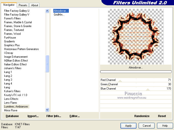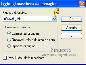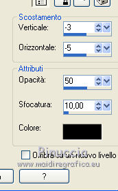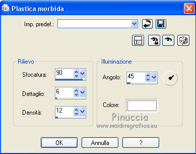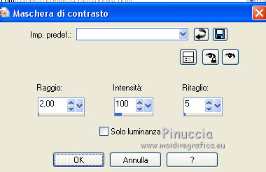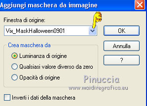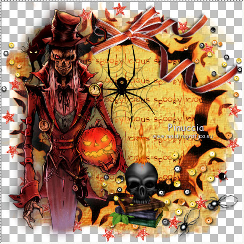 qui puoi trovare qualche risposta ai tuoi dubbi. Se l'argomento che ti interessa non č presente, ti prego di segnalarmelo. Questo tutorial č stato creato da Libellule con X12, ma puň essere eseguito con tutte le versioni di PSP Dalla versione X4, il comando Immagine>Rifletti č stato sostituito con Immagine>Capovolgi in orizzontale, e il comando Immagine>Capovolgi con Immagine>Capovolgi in verticale. Nelle versioni X5 e X6, le funzioni sono state migliorate rendendo disponibile il menu Oggetti. Con la nuova versione X7, sono tornati i comandi Rifletti e Capovolgi, ma con nuove differenze. Vedi la scheda sull'argomento qui Per tradurre questo tutorial ho usato PSP X. Occorrente. Materiale qui Il tube utilizzato č di Libellule. Un carta viene dal kit (http://prelestnayap.blogspot.fr/") Halloween Magic Il nastro č di(http://sekadascrapy.blogspot.fr/") Sekada Designs Una delle maschere č di (http://prelestnayap.blogspot.fr/") Prelestnayap Design La seconda maschera č senza firma. Filtri in caso di dubbi, ricorda di consultare la mia sezione filtri qui Filters Unlimited 2.0 qui FM Tile Tools - Blend Emboss qui Adjust - Variations qui Simple qui Lumičres et Ambiances qui I filtri Simple e Lumičres si possono usare da soli o importati in Filters Unlimited (come fare vedi qui) Se un filtro fornito appare con questa icona ![]() 1. Apri una nuova immagine trasparente 800 x 800 pixels. 2. Selezione>Seleziona tutto. Apri la carta 2 SkyScraps-Halloween-pp2.jpg, e vai a Modifica>Copia. Torna al tuo lavoro e vai a Modifica>Incolla nella selezione. Selezione>Deseleziona. 3. Livelli>Nuovo livello maschera>Da immagine. Apri il menu sotto la finestra di origine e vedrai la lista dei files aperti. Carica la maschera 034msk_tbk, con i seguenti settaggi. ![]() Livelli>Unisci>Unisci gruppo. 4. Effetti>Plugins>FM Tile Tools - Blend Emboss. ![]() 5. Livelli>Nuovo livello raster. Imposta il colore di primo piano con il colore nero, e riempi 6. Livelli>Nuovo livello maschera>Da immagine. Apri il menu sotto la finestra di origine e carica la maschera Vix_MaskHalloween0901.jpg, con i seguenti settaggi. ![]() Livelli>Unisci>Unisci gruppo. 7. Immagine>Ridimensiona, al 110%, tutti i livelli non selezionato. 8. Effetti>Plugins>Filters Unlimited 2.0 - Lumičres Ambiances - Almodovar. ![]() Attenzione, potresti non ottenere lo stesso risultato, se non importi il filtro in Unlimited. Se invece stai usando una versione meno recente di PSP (come nel mio caso, con CorelX) il filtro potrebbe non funzionare e non ottenere alcun risultato. In questo caso, per avere questo risultato ![]() copia e incolla sul tuo lavoro questo file (maschera dopo l'applicazione del filtro), e salta i punti da 5 a 8. 9. Apri il tube LF-Spiders-11092014.png. Attiva lo strumento Selezione a mano libera ![]() e seleziona il ragno in basso a sinistra. (puoi anche scegliere un altro ragno, se vuoi). Modifica>Copia. Torna al tuo lavoro e vai a Modifica>Incolla come nuovo livello. Immagine>Capovolgi. Sposta il tube in alto, sotto la cornice.![]() 10. Livelli>Nuovo livello raster. Selezione>Seleziona tutto. 11. Apri il tube digiscrap.png, e vai a Modifica>Copia. Torna al tuo lavoro e vai a Modifica>Incolla nella selezione. Selezione>Deseleziona. 12. Regola>Tonalitŕ e saturazione>Viraggio. ![]() 13. Apri il tube Achtergrond.png Edition e vai a Modifica>Copia. Torna al tuo lavoro e vai a Modifica>Incolla come nuovo livello. 14. Regola>Messa a fuoco>Metti a fuoco. Effetti>Effetti di immagine>Scostamento. ![]() 15. Livelli>Duplica. Effetti>Plugins>Simple - Diamonds. Livelli>Unisci>Unisci giů. Risultato. ![]() 16. Apri il tube del nastro SekadaDesigns_elements (57)2.png, e vai a Modifica>Copia. Torna al tuo lavoro e vai a Modifica>Incolla come nuovo livello. Immagine>Ridimensiona, all'80%, tutti i livelli non selezionato. Sposta il nastro in alto a destra.17. Effetti>Effetti 3D>Sfalsa ombra. ![]() 18. Apri il tube libellulegraphisme_monstre_a_la_citrouille.png, e vai a Modifica>Copia. Torna al tuo lavoro e vai a Modifica>Incolla come nuovo livello. Immagine>Ridimensiona, al 95%, tutti i livelli non selezionato. Sposta il tube a sinistra.![]() 19. Effetti>Plugins>Adjust - Variations. Un clic su Original per annullare eventuali precedenti settaggi memorizzati dal filtro. Due clic su Darker e ok. adatta i settaggi al tuo tube ![]() 20. Livelli>Duplica. Attiva il livello sottostante dell'originale. 21. Effetti>Effetti di trama>Plastica morbida. ![]() 22. Attiva il livello superiore della copia. Effetti>Effetti 3D>Sfalsa ombra, con i settaggi precedenti. ![]() 23. Apri il tube Spinnen.png, e vai a Modifica>Copia. Torna al tuo lavoro e vai a Modifica>Incolla come nuovo livello. Sposta il tube in basso a destra.![]() 24. Regola>Messa a fuoco>Maschera di contrasto. ![]() 25. Apri il tube AD_HalloweenMagic (42).png, e vai a Modifica>Copia. Torna al tuo lavoro e vai a Modifica>Incolla come nuovo livello. Immagine>Ridimensiona, al 70%, tutti i livelli non selezionato. 26. Effetti>Effetti 3D>Sfalsa ombra, con i settaggi precedenti. 27. Apri il tube SQ_ele2_XX.png, e vai a Modifica>Copia. Torna al tuo lavoro e vai a Modifica>Incolla come nuovo livello. Sposta sul libro.![]() Regola>Messa a fuoco>Metti a fuoco. Effetti>Effetti 3D>Sfalsa ombra, con i settaggi precedenti. ![]() 28. Firma il tuo lavoro. Livelli>Unisci>Unisci visibile (se vuoi conservare lo sfondo trasparente. Salva in formato png. Se non vuoi lo sfondo trasparente: Livelli>Unisci>Unisci tutto (e otterrai lo sfondo bianco) e salva in formato jpg. ![]() ![]() Per questa versione ho usato un tube di Sassydeb ![]() Se hai problemi o dubbi, o trovi un link non funzionante, o anche soltanto per un saluto, scrivimi. 4 Ottobre 2014 |