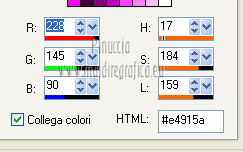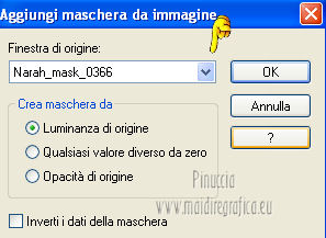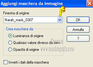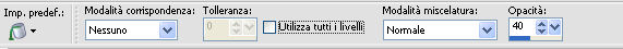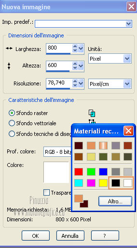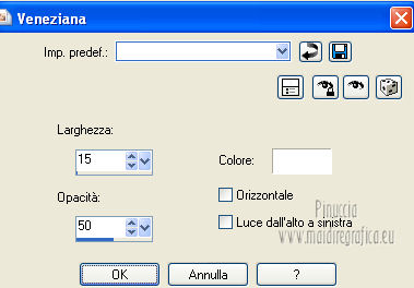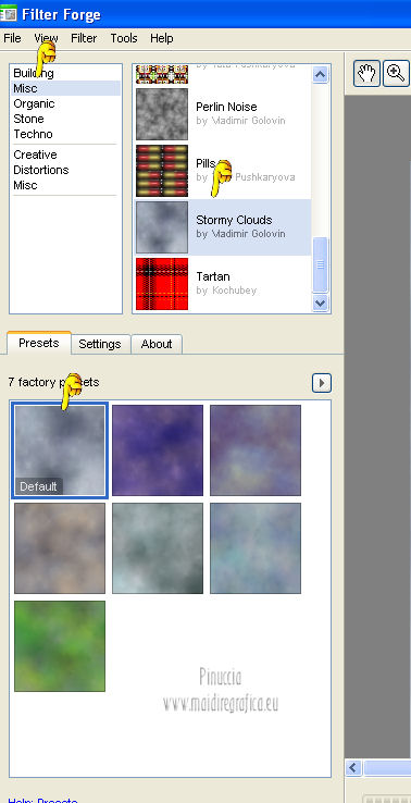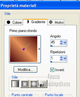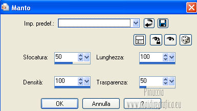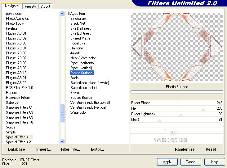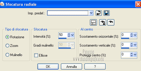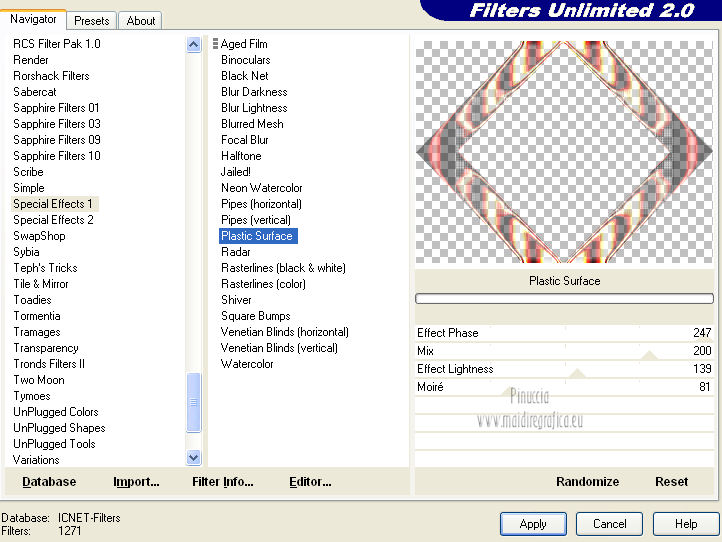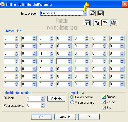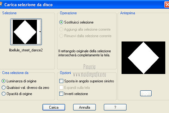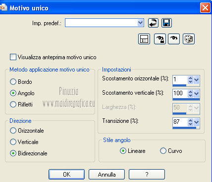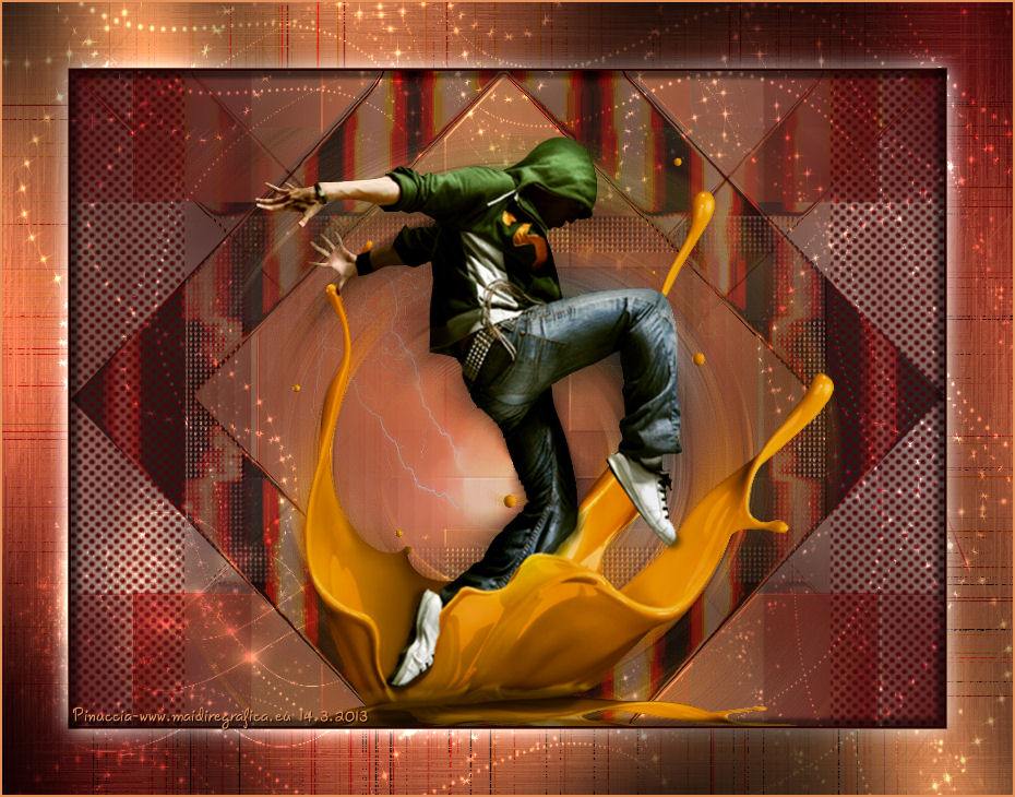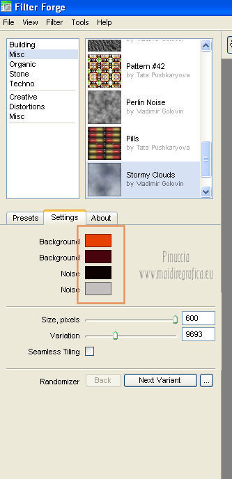 qui puoi trovare qualche risposta ai tuoi dubbi. Se l'argomento che ti interessa non è presente, ti prego di segnalarmelo. Questo tutorial è stato creato con PSP XII, ma può essere eseguito anche con le altre versioni di PSP. Per tradurlo ho usato PSP X. Occorrente. Materiale qui Il tube della donna è di CibiBijoux. Il resto del materiale è di Libellule. Le due maschere sono di Narah. Filtri: Forge qui Tramages - Pool Shadow qui Filters Unlimited 2.0 qui Emboss4 qui Metti Emboss4 nella cartella Impostazioni Predefinite. Metti le selezioni nella cartella Selezioni. Apri le maschere in PSP e minimizzale con il resto del materiale. Imposta il colore di primo piano con #e4915a, e il colore di sfondo con #48040a. ![]() 1. Apri una nuova immagine 800 x 600, sfondo bianco. togli la spunta a trasparente e clicca con il tasto destro del mouse sulla paletta del colore. Avrai la tabellina dei colori recenti. In basso a sinistra trovi sempre i colori e/o gradienti impostati nella tua paletta dei materiali. Gli ultimi due colori della tabella sono sempre il nero e il bianco. Per impostare il colore dello sfondo, clicca sulla palettina corrispondente ![]() Effetti>Plugins>Forge Clicca su Misc e seleziona il motivo Stormy Clouds ![]() con i seguenti settaggi: imposta i tuoi due colori di mese e aggiungi un grigio chiaro e il colore nero in Noise. ti consiglio, prima di applicare il filtro, di prendere nota dei valori corrispondenti ai tuoi colori, ![]() perchè il filtro non dà la possibilità di inserire codici ![]() 2. Passa il colore di primo piano a Gradiente, stile Lineare. ![]() Livelli>Nuovo livello raster. Riempi il livello con il gradiente.3. Livelli>Nuovo livello maschera>Da immagine. Apri il menu sotto la finestra di origine e vedrai la lista dei files aperti. Seleziona la maschera Narah_mask_0307 con i seguenti settaggi. ![]() Livelli>Unisci>Unisci gruppo. Effetti>Filtro definito dall'utente - Emboss 4. ![]() 4. Livelli>Nuovo livello raster. Riempi con il colore di sfondo.Livelli>Nuovo livello maschera>Da immagine. Apri il menu sotto la finestra di origine e seleziona la maschera Narah_mask_0366, con i seguenti settaggi. ![]() Livelli>Unisci>Unisci gruppo. 5. Livelli>Nuovo livello raster. Selezione>Seleziona tutto. Apri il tube starry frame.png e vai a Modifica>Copia. non chiudere il tube perchè ti servirà ancora Torna al tuo lavoro e vai a Modifica>Incolla nella selezione. Selezione>Deseleziona. Cambia la modalità di miscelatura di questo livello in Indebolisci, e abbassa l'opacità al 60%. 6. Attiva il livello gruppo Raster 1 (la prima maschera). Selezione>Carica/Salva selezione>Carica selezione da disco. Cerca e carica la selezione libellule_street_dance. ![]() Selezione>Innalza selezione a livello. Selezione>Deseleziona. 7. Livelli>Duplica. Livelli>Unisci>Unisci giù. 8. Effetti>Plugins>Filters Unlimited 2.0 - Special Effects 1 - Plastic surface. ![]() attenzione, se nella schermata di anteprima ti appare un'immagine diversa, come nell'esempio sotto, ![]() è molto probabile che abbia inserito nei Percorsi una diversa versione di Unlimited. Questa versione in circolazione non necessita di installazione e contiene una lista di effetti in 8bf. Se vuoi ottenere il risultato del tutorial originale, dovrai inserire nei Percorsi file, dopo aver rimosso la versione esistente, il filtro originale. Se vuoi lasciare le cose come stanno, vedi in fondo al tutorial il risultato che otterrai. Cambia la modalità di miscelatura di questo livello in Moltiplica. 9. Livelli>Duplica. Effetti>Effetti di immagine>Motivo unico. ![]() 10. Selezione>Carica/Salva selezione>Carica selezione da disco. Cerca e carica la selezione libellule_street_dance2. ![]() Selezione>Modifica>Espandi - 5 pixels. ![]() Livelli>Nuovo livello raster. Imposta l'opacità dello strumento Riempimento a 40 ![]() e riempi la selezione con il colore di primo piano.11. Effetti>Effetti di trama>Veneziana, colore bianco. ![]() Selezione>Deseleziona. Livelli>Disponi>Sposta giù - 2 volte. Rimani posizionato su questo livello. Selezione>Carica/Salva selezione>Carica selezione da disco. Carica nuovamente la selezione libellule_street_dance2. ![]() 12. Livelli>Nuovo livello raster. Apri il tube paysage logane_misted_ciel eclair_22juin2012.png e vai a Modifica>Copia. Torna al tuo lavoro e vai a Modifica>Incolla nella selezione. Selezione>Deseleziona. 13. Attiva il livello superiore. Apri il tube Man_StreetDance_CibiBijoux.pspimages e vai a Modifica>Copia. Torna al tuo lavoro e vai a Modifica>Incolla come nuovo livello. Regola>Messa a fuoco>Metti a fuoco. Posiziona il tube un po' più in basso, al centro.14. Livelli>Duplica. Regola>Sfocatura>Sfocatura radiale. ![]() Effetti>Effetti di bordo>Aumenta di più. Livelli>Disponi>Sposta giù. 15. Immagine>Aggiungi bordatura, 2 pixels, simmetriche, con il colore di sfondo. Immagine>Aggiungi bordatura, 1 pixel, simmetriche, con il colore di primo piano. Immagine>Aggiungi bordatura, 60 pixels, simmetriche, con il colore bianco. Selezione>Seleziona tutto. Selezione>Modifica>Contrai - 60 pixels. Selezione>Inverti. 16. Cambia i settaggi del gradiente. ![]() Livelli>Nuovo livello raster. Riporta l'opacità dello strumento Riempimento a 100, e riempi la selezione con il gradiente.17. Effetti>Effetti di trama>Manto. ![]() 18. Livelli>Nuovo livello raster. Attiva nuovamente il tube starryframe.png e vai a Modifica>Copia. Torna al tuo lavoro e vai a Modifica>Incolla nella selezione. Cambia la modalità di miscelatura di questo livello in Indebolisci, e abbassa l'opacità al 60%. 19. Selezione>Inverti. Livelli>Nuovo livello raster. Effetti>Effetti 3D>Ritaglio. ![]() Mantieni ancora selezionato. Livelli>Nuovo livello raster. Ripeti l'Effetto Ritaglio, cambiando verticale e orizzontale con -10. Mantieni sempre selezionato. Livelli>Unisci>Unisci visibile. Selezione>Inverti. Effetti>Plugins>Tramages - Pool Shadow, con i settaggi standard. ![]() Selezione>Deseleziona. 20. Immagine>Aggiungi bordatura, 1 pixel, s