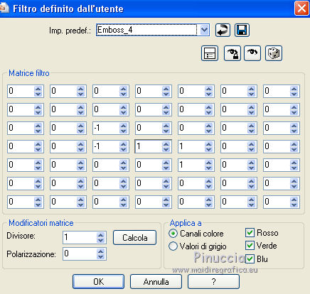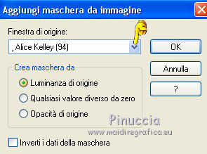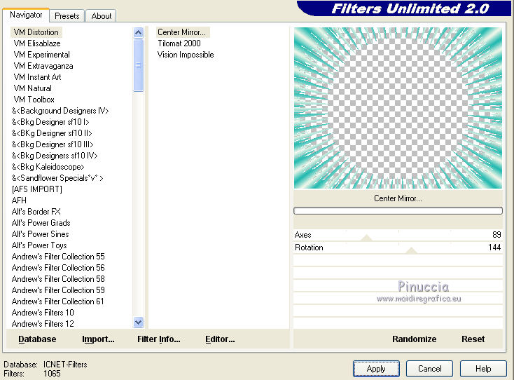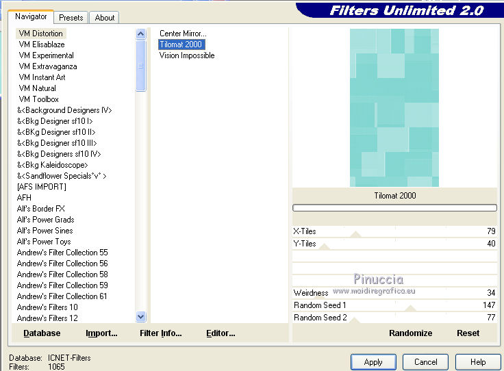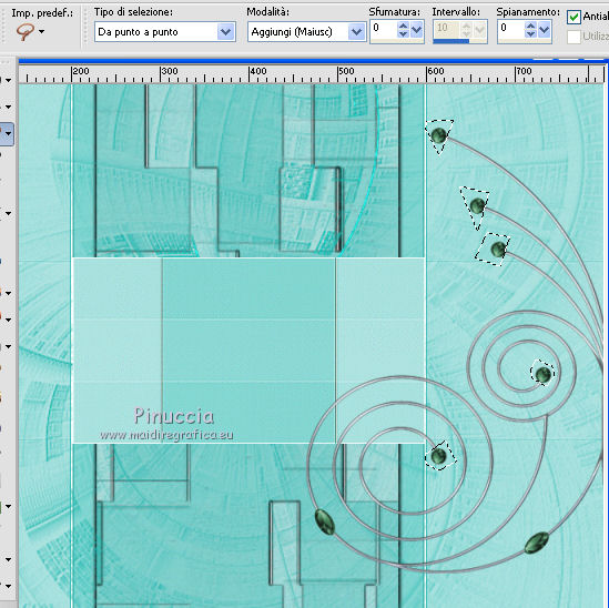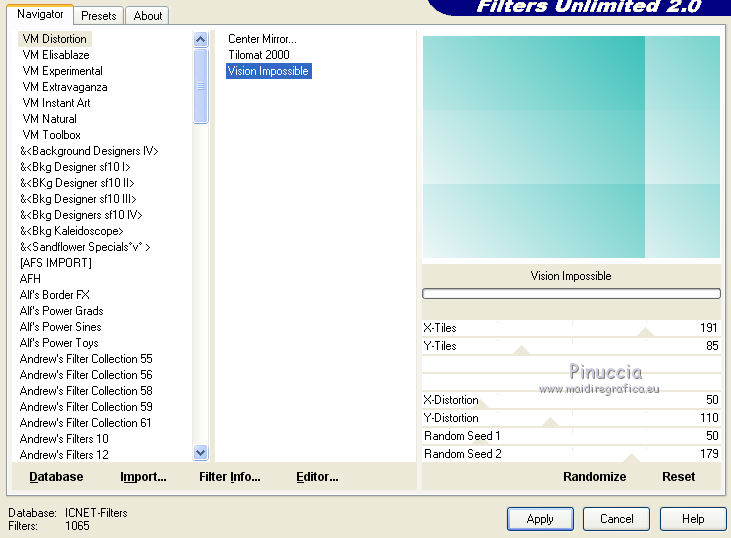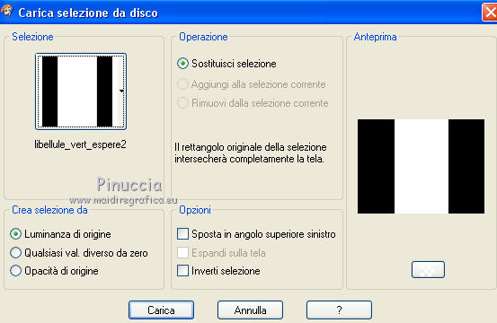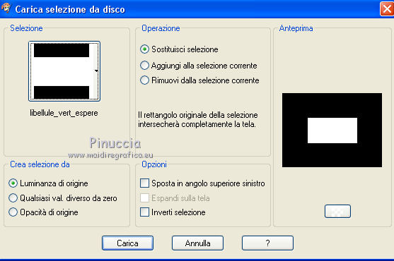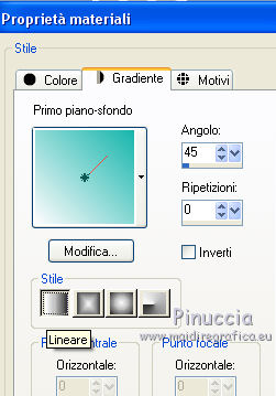 qui puoi trovare qualche risposta ai tuoi dubbi. Se l'argomento che ti interessa non è presente, ti prego di segnalarmelo. Questo tutorial è stato creato da Libellule con X12, ma può essere eseguito con tutte le versioni di PSP Dalla versione X4, il comando Immagine>Rifletti è stato sostituito con Immagine>Capovolgi in orizzontale, e il comando Immagine>Capovolgi con Immagine>Capovolgi in verticale. Nelle versioni X5 e X6, le funzioni sono state migliorate rendendo disponibile il menu Oggetti. Vedi la scheda sull'argomento qui Per tradurre questo tutorial ho usato PSP X. Occorrente. Materiale qui Il tube della donna è di Libellule. L'immagine usata per la maschera è di Alice Kelley. Il tube della farfalla viene da uno scrap di BelVidotti (il suo blog non esiste più). il resto del materiale è di Libellule. E' proibito utilizzare il materiale per altri tutorial o distribuirli in gruppi e/o forum. Filtri in caso di dubbi, ricorda di consultare la mia sezione filtri qui Filters Unlimited 2.0 qui VM Distortion qui I filtri VM Distortion si possono usare da soli o importati in Filters Unlimited (come fare vedi qui) Se un filtro fornito appare con questa icona ![]() Metti i preset Emboss 3 e Emboss 4 nella cartella Impostazioni predefinite. Metti le selezioni nella cartella Selezioni. Apri il frattale di Alice Kelley, che servirà per la maschera, in PSP e minimizzalo con il resto del materiale. 1. Imposta il colore di primo piano con #fdfbfc, e il colore di sfondo con #18b6ad. ![]() Passa il colore di primo piano a Gradiente di primo piano/sfondo, stile Lineare. ![]() 2. Apri una nuova immagine trasparente 800 x 600 pixels, e riempila con il gradiente.Effetti>Plugins>Filters Unlimited 2.0 - VM Distortion - Vision impossible. ![]() Effetti>Filtro definito dall'utente - seleziona il preset Emboss 4 e ok. ![]() Livelli>Duplica. Immagine>Rifletti. Abbassa l'opacità di questo livello al 50%. Livelli>Unisci>Unisci giù. Di nuovo Livelli>Duplica. Immagine>Capovolgi. Abbassa l'opacità di questo livello al 50%. Livelli>Unisci>Unisci giù. Effetti>Effetti di bordo>Aumenta di più. 3. Modifica>Copia (livello Uniti). Livelli>Nuovo livello raster. Selezione>Carica/Salva selezione>Carica selezione da disco. Cerca e carica la selezione libellule_vert_espere. ![]() Modifica>Incolla nella selezione. Dovresti avere questo. ![]() Selezione>Deseleziona. Effetti>Effetti di bordo>Aumenta. 4. Attiva il livello di sfondo. Livelli>Nuovo livello raster. Selezione>Carica/Salva selezione>Carica selezione da disco. Cerca e carica la selezione libellule_vert_espere2. ![]() Modifica>Incolla nella selezione (l'immagine di sfondo è ancora in memoria). Effetti>Plugins>Filters Unlimited 2.0 - VM Distortion - Tilomat 2000. ![]() Mantieni selezionato. 5. Effetti>Effetti artistici>Cera liquida. Selezione>Deseleziona. Effetti>Effetti 3D>Sfalsa ombra. ![]() Ripeti l'Effetto Sfalsa ombra, cambiando verticale e orizzontale con -2. 6. Attiva il livello superiore. Livelli>Nuovo livello raster. Riempi con il colore di sfondo.Livelli>Nuovo livello maschera>Da immagine. Apri il menu sotto la finestra di origine e vedrai la lista dei files aperti. Seleziona il frattale di Alice Kelley, con i seguenti settaggi. ![]() Livelli>Unisci>Unisci gruppo. Effetti>Filtro definito dall'utente - seleziona il preset Emboss 3 e ok. ![]() Livelli>Disponi>Sposta giù. 7. Attiva il livello superiore. Apri il tube acquae18 belvidotti.png, e vai a Modifica>Copia. Torna al tuo lavoro e vai a Modifica>Incolla come nuovo livello. Effetti>Effetti di immagine>Scostamento. ![]() Attiva lo strumento Selezione a mano libera ![]() sfumatura e tolleranza 0, modalità Aggiungi, e seleziona le piccole perle ![]() Regola>Tonalità e saturazione>Viraggio, con i valori di Tonalità (H) e Saturazione (S) del tuo colore di sfondo. Per l'esempio: