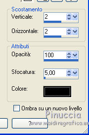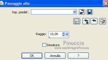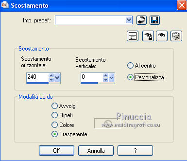 ![]() Selezione>Deseleziona. Livelli>Duplica. Immagine>Rifletti. Livelli>Unisci>Unisci giù. Regola>Messa a fuoco>Metti a fuoco. 8. Apri il tuo tube e vai a Modifica>Copia. Torna al tuo lavoro e vai a Modifica>Incolla come nuovo livello. Immagine>Ridimensiona, se e quanto necessario, tutti i livelli non selezionato. (per l'esempio ho ridimensionato al 90%). Regola>Messa a fuoco>Metti a fuoco. Posiziona il tube al centro.Regola>Messa a fuoco>Messa a fuoco passaggio alto. ![]() 9. Immagine>Aggiungi bordatura, 2 pixels, simmetriche, con il colore di sfondo. Immagine>Aggiungi bordatura, 50 pixels, simmetriche, con il colore bianco. attiva lo strumento Bacchetta magica , sfumatura e tolleranza 0,e clicca nel bordo da 50 pixels per selezionarlo. Riempi la selezione con il gradiente iniziale.![]() Selezione>Innalza selezione a livello. Effetti>Plugins>Filters Unlimited 2.0 - VM Distortion - Center Mirror. ![]() 10. Effetti>Effetti di bordo>Passaggio alto. ![]() Selezione>Inverti. Selezione>Modifica>Contrai - 2 pixels. Di nuovo Selezione>Inverti. Effetti>Effetti 3D>Smusso a incasso. ![]() Selezione>Deseleziona. 11. Immagine>Aggiungi bordatura, 2 pixels, simmetriche, con il colore grigio chiaro #c0c0c0. Immagine>Aggiungi bordatura, 1 pixel , simmetriche, con il colore di sfondo. Regola>Messa a fuoco>Metti a fuoco. 12. apri il tube libellulegraphisme_cadre.png, e vai a Modifica>Copia. Torna al tuo lavoro e vai a Modifica>Incolla come nuovo livello. Non spostarlo. Colorizza, se necessario. ![]() 13. Apri il wordart libellulegraphisme_wordart.png, e vai a Modifica>Copia. Torna al tuo lavoro e vai a Modifica>Incolla come nuovo livello. Colorizza se necessario. Posiziona il tube dove preferisci,o vedi il mio esempio. Livelli>Duplica. Effetti>Effetti di distorsione>Vento - da destra, intensità 100. ![]() Livelli>Disponi>Sposta giù. Livelli>Duplica. Immagine>Rifletti. Posiziona correttamente se necessario.Deve avere più o meno la stessa distanza tra il testo e la fine della distorsione. Livelli>Unisci>Unisci giù. Regola>Messa a fuoco>metti a fuoco. 14. Firma il tuo lavoro. Livelli>Unisci>Unisci tutto e salva in formato jpg. Per questo esempio ho usato un tube di Animabelle. ![]() ![]() Le vostre versioni Grazie Olimpia ![]() Grazie Robby ![]() ![]() Le vostre versioni. Grazie ![]() Shanty ![]() Se hai problemi o dubbi, o trovi un link non funzionante, o anche soltanto per un saluto, scrivimi. 12 Giugno 2014 |