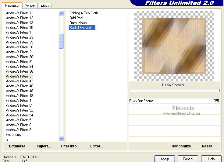 5. Effets>Modules Externes>Filters Unlimited 2.0 - Andrew's Filters 3 - Radial Shoved.