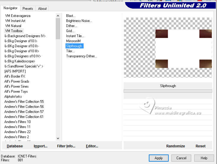 Effets>Modules Externes>Filters Unlimited 2.0 - VM Toolbox - Slipthrough.