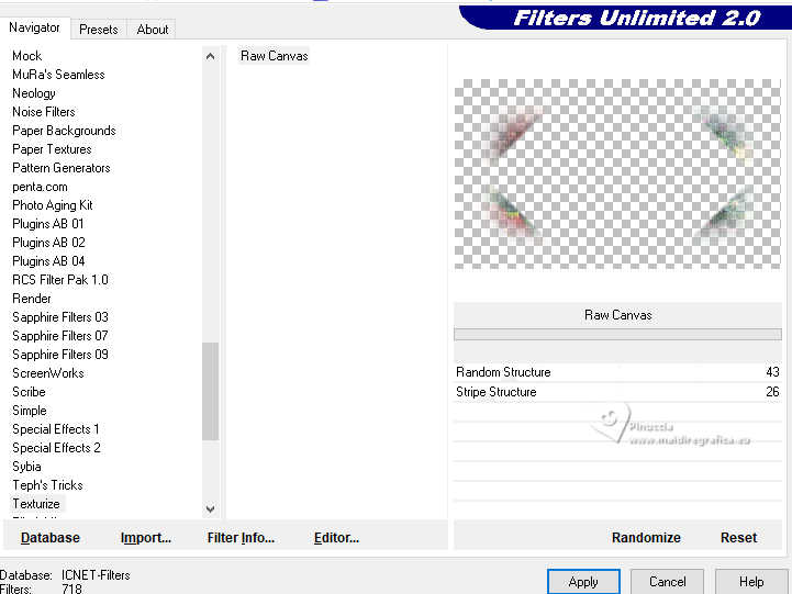 6. Effets>Modules Externes>Filters Unlimited 2.0 - Texturize - Raw Canvas, par défaut.
