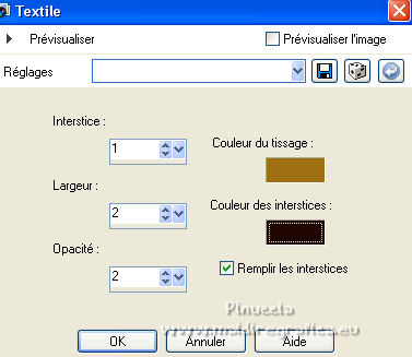 6. Effets>Effets de textures>Textile - avec deux couleur foncée de votre arrière plan.