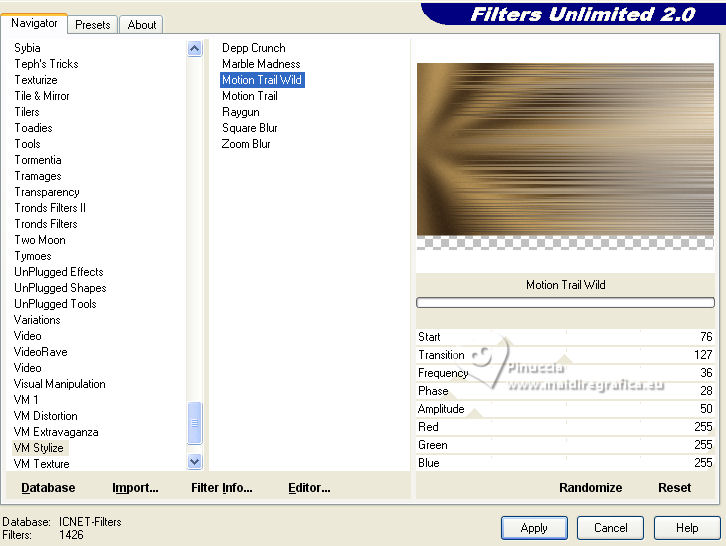 11. Effets>Modules Externes>Filters Unlimited 2.0 - VM Stylize - Motion Trail Wild, par défaut.
