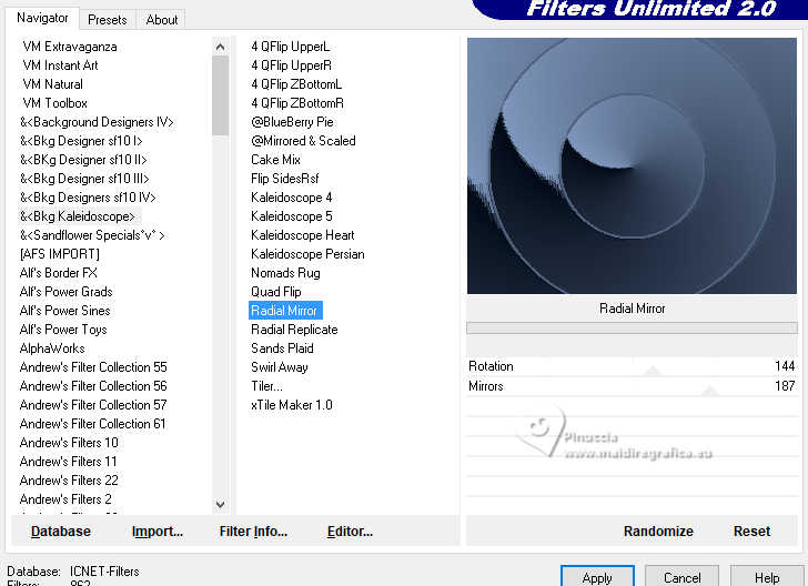 4. Effets>Modules Externes>Filters Unlimited 2.0 - &<Bkg Kaleidoscope> - Radial Mirror, par défaut.