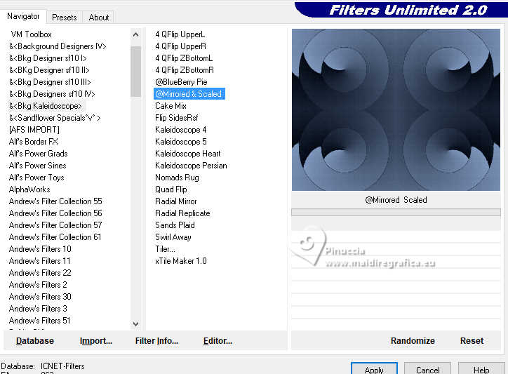 6. Effets>Modules Externes>Filters Unlimited 2.0 - &<Bkg Kaleidoscope> - @Mirrored & Scaled.