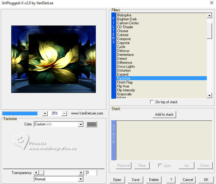 24. Effets>Modules Externes>VanDerLee - Unplugged-X - Factorize, par défaut.