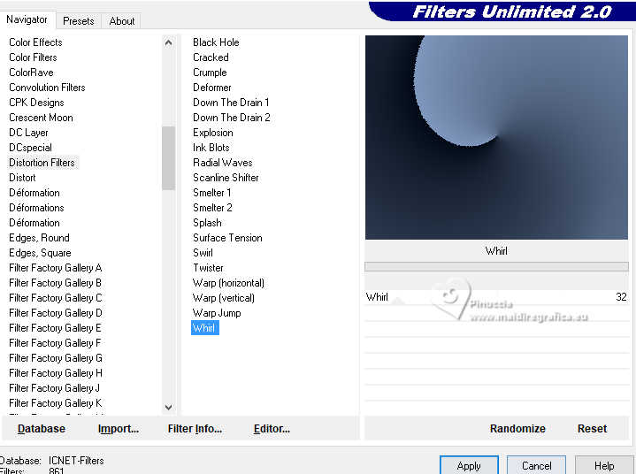 3. Effets>Modules Externes>Filters Unlimited 2.0 - Distortion Filters - Whirl, par défaut.