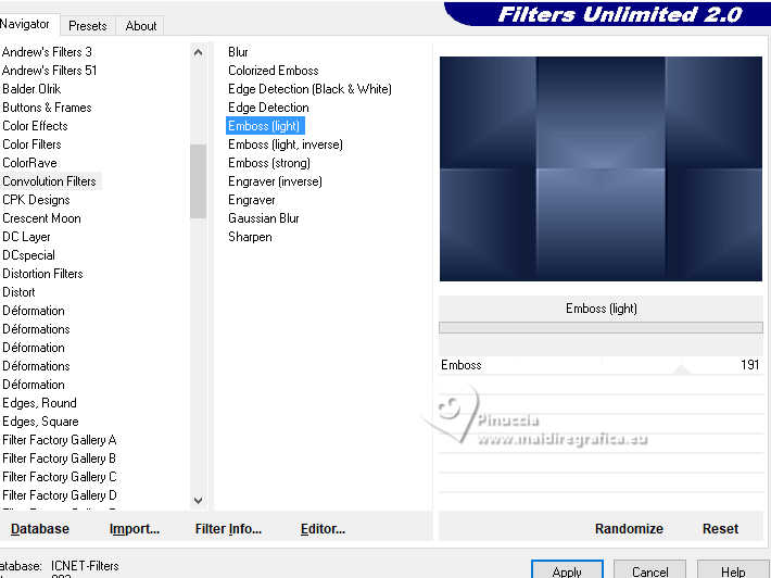 6. Effets>Modules Externes>Filters Unlimited 2.0 - Convolution Filter - Emboss (light), par défaut