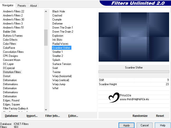 7. Effets>Modules Externes>Filters Unlimited 2.0 - Distortion Filters - Scanline Shifter, par défaut.