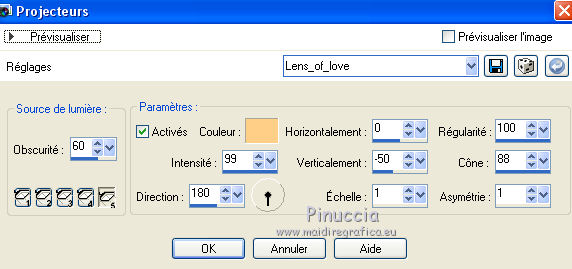 Effets>Effets d'éclairage>Projecteurs - sélectionner le preset Lens_of_love et ok.