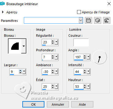 20. Effets>Effets 3D>Biseautage intérieur, comme précédemment.