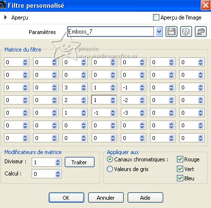 Effets>Filtre personnalisé - sélectionner le preset Emboss 7 et ok.